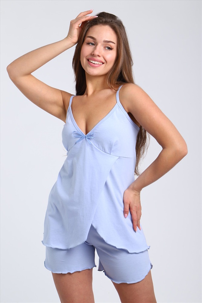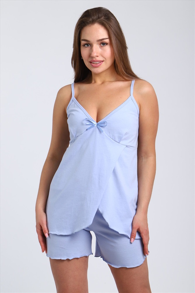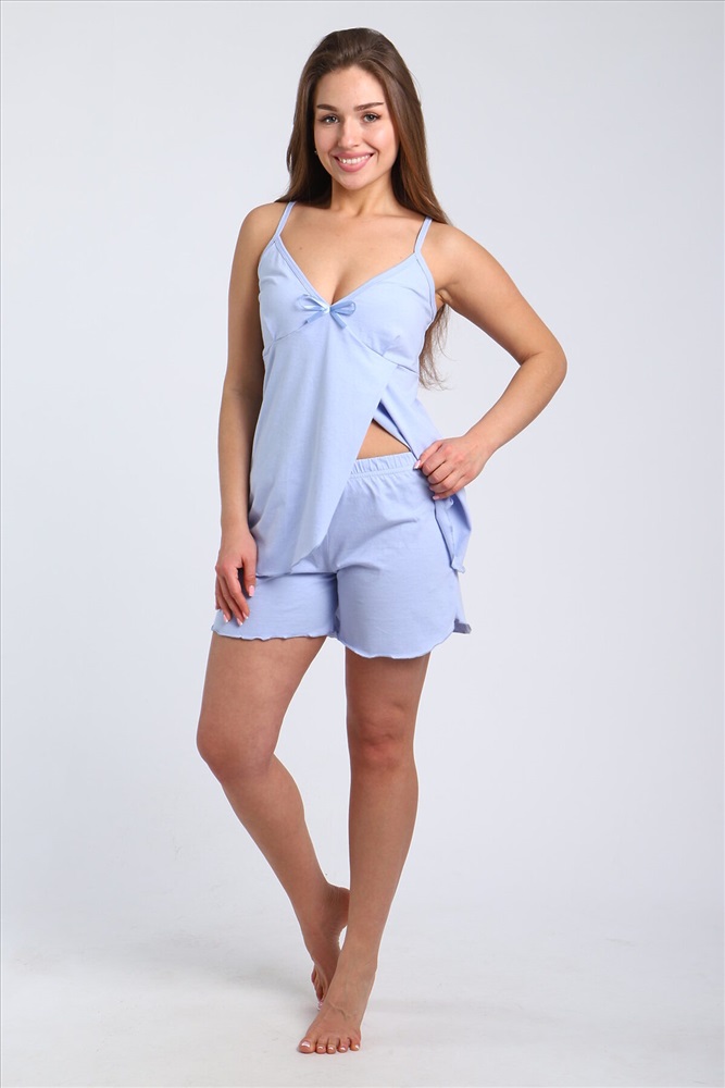 Страна производства: Россия Пижама состоит из майки и шорт. Майка на бретелях, лиф с вытачками. Нижняя часть ассиметрична на запах. Шорты на притачной резинке, расширены к низу.