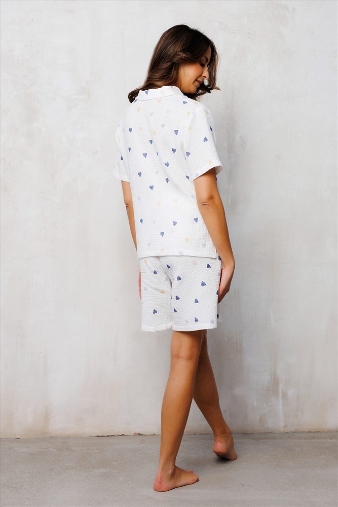 Пижама с шортами женская из муслина от бренда Raposa идеальный вариант для домашнего отдыха или прогулок по пляжу. Изготовлена из натурального хлопкового текстиля, что делает ее максимально удобной и приятной к телу. Уютная пижамка больших размеров, оверсайз, подойдет как беременным женщинам, так и дамам плюс сайз. Узор в виде разноцветных сердечек придает пижаме особый шарм, а дышащий материал обеспечивает комфорт в жаркую погоду, благодаря чему пижамный комплект вполне применим как универсальный и стильный пляжный костюм. Модная пижама из хлопка 100 % понравится подросткам, эта женственная двойка свободного кроя приятна для тела и совершенно не стесняет движений. Пижама из муслина понравится поклонникам стиля оверсайз, хороша как подарок к любому празднику маме, жене, дочке, любимой девушке.