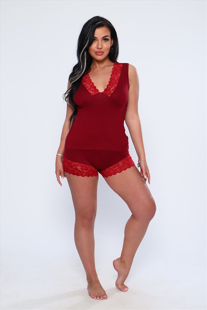 Страна производства: Россия Пижама женская сексуальная с шортами из вискозы.Шортики и майка выполнена из нежной вискозы идеально подчнеркивают фигуру.Майка без рукава по груди сесуальный вырез оформлен кружевом под грудью подрез со складками,шортики по низу с кружевом.в этой пижаме вы будите неотразима .На модели 48 размер. Идеально подойдет к модели 78518.