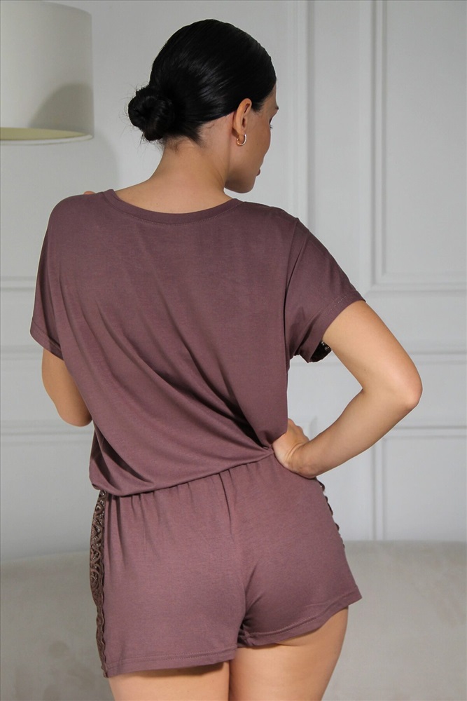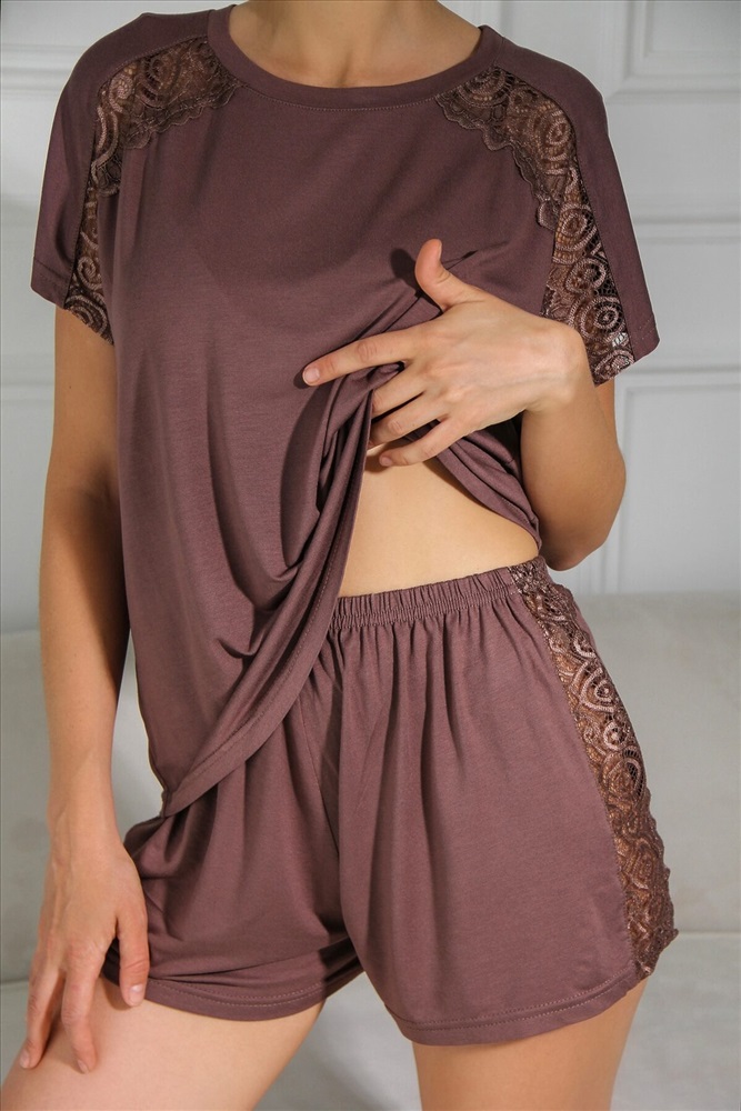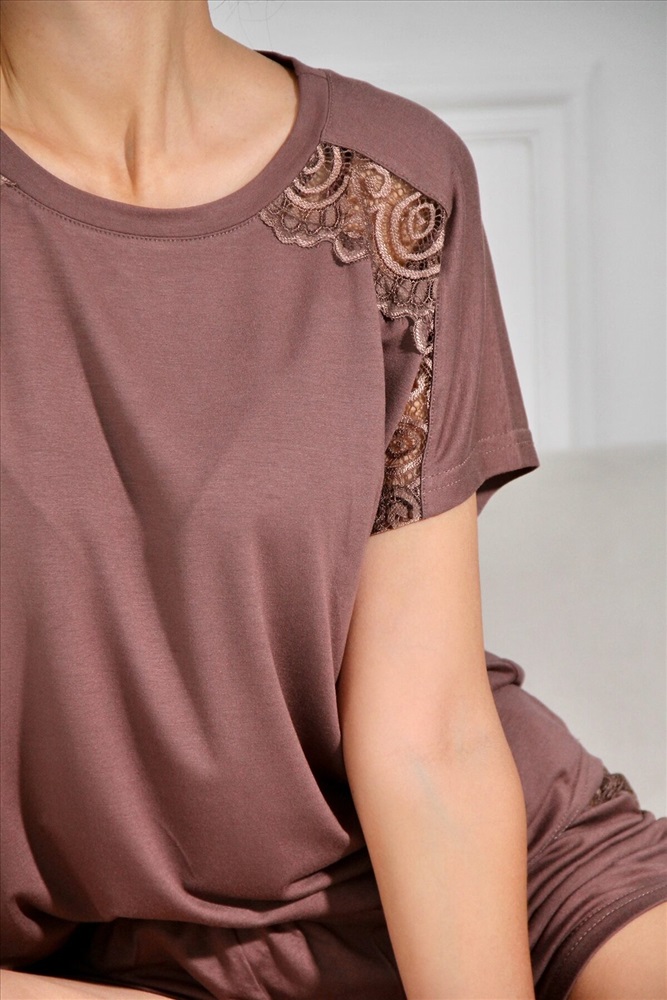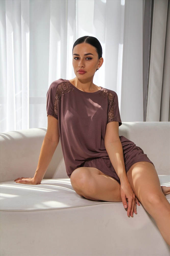 Элегантный женский пижамный комплект состоит из футболки и шорт. Мягкая и легкая вискоза, самый удачный вариант для сна и домашнего отдыха. Качественный материал долго не изнашивается, не скатывается, имеет достаточную эластичность и стойкость к многочисленным стиркам. Футболка свободного кроя со спущенной линией плеча с кружевной отделкой, горловина круглая. По спинке футболке может быть шов. Шорты короткие, на талии фиксируются эластичной резинкой шириной 2см.На фото модель представлена в 44 размере.