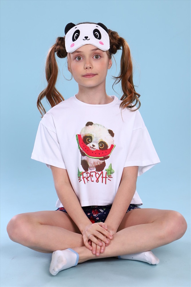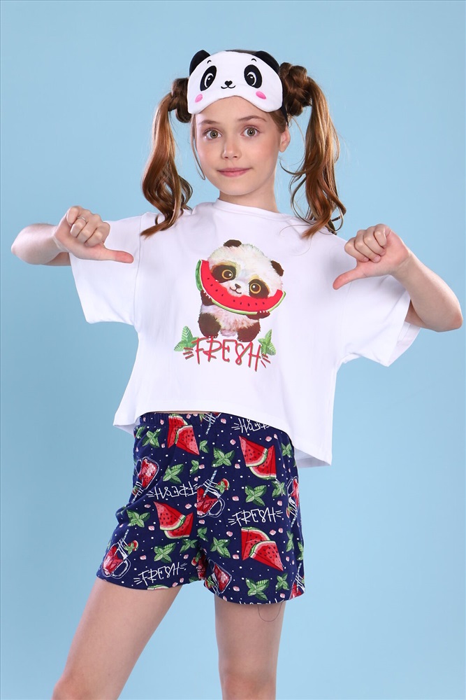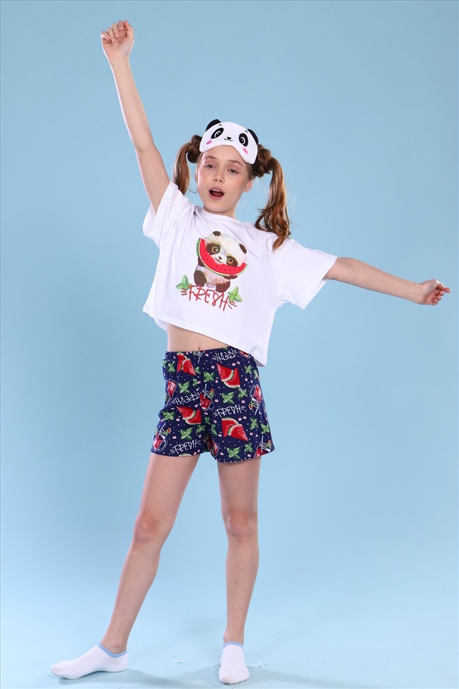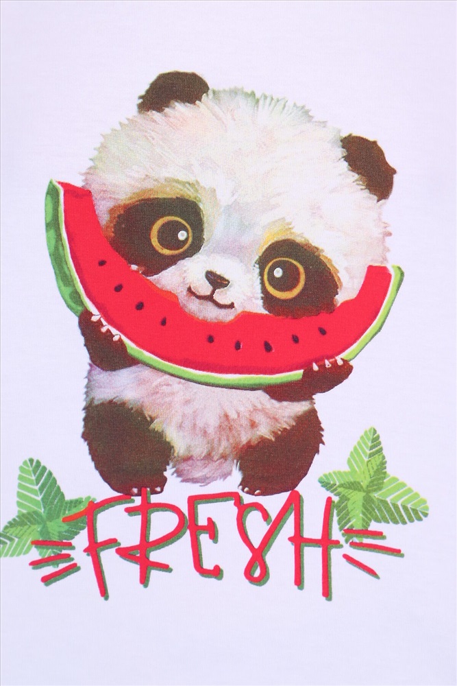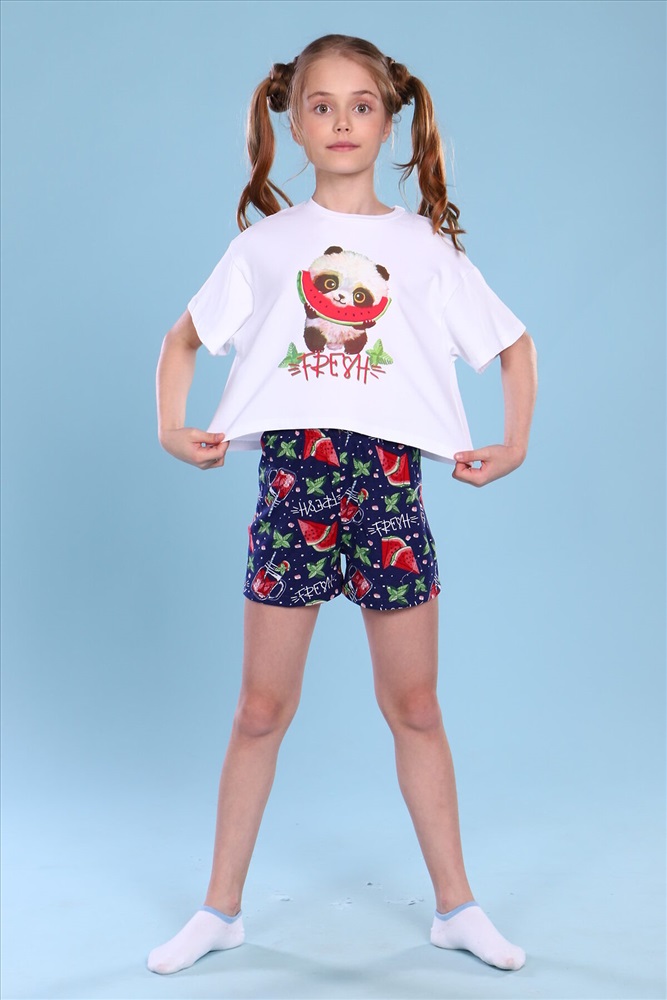 Комфортная пижама для девочки с ярким модным принтом Панда с арбузом. Пижама детская состоит из футболки и шорт. Дизайн ткани позволяет использовать пижаму не только для сна, но и как костюм для дома. Материал очень мягкий и в тоже время износостойкий, не скатывается и не вытягивается. Модель пижамы не сковывает движения ребенка во время сна. Покрой футболки свободный, шорты классические без карманов. Пижама выполнена из 100% гиппоаллергенного хлопка, что позволяет коже ребенка дышать во время сна.