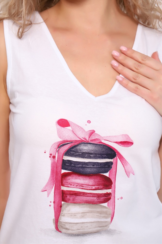 Застежка: без застежки Пижама женская из 100% хлопка для сна и отдыха, состоящая из майки с V-образным вырезом и печатным рисунком на груди. Клетчатые шорты средней длины и объемности со складкой спереди и поясом на резинке, карманы в боковых швах.