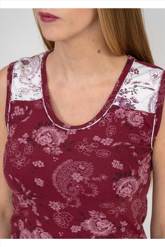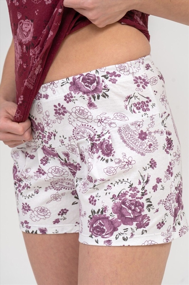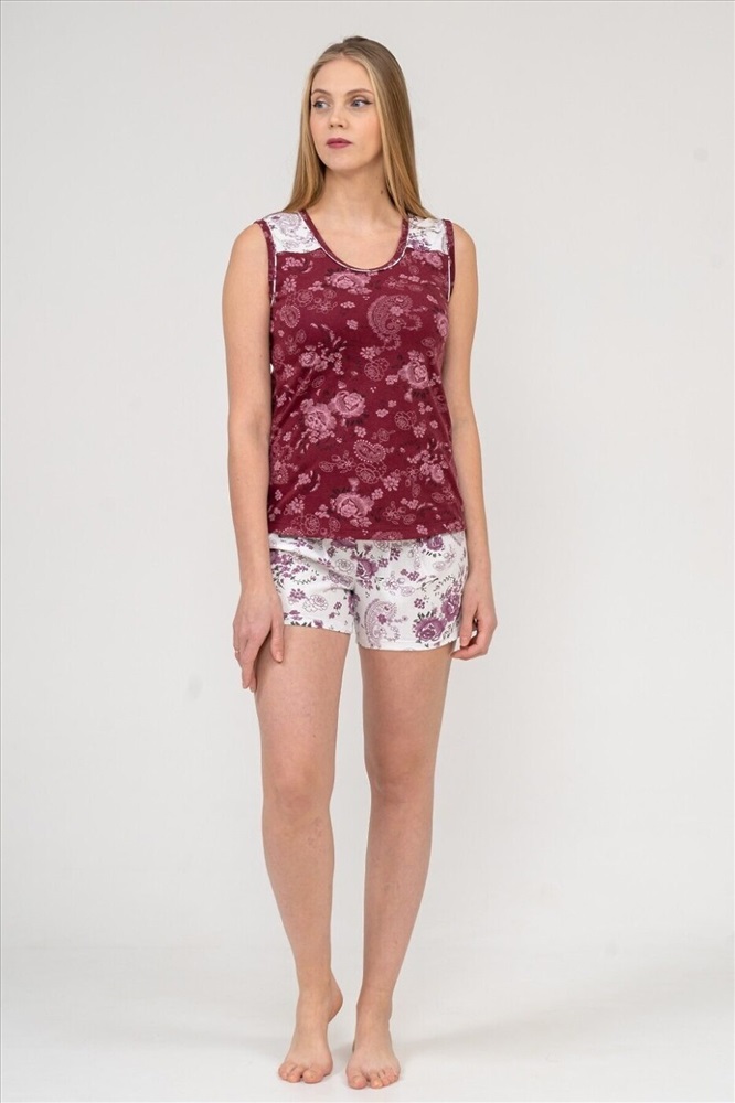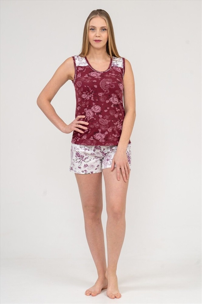 Страна производства: Россия Пижама женская состоит из майки и шорт. Майка прямого силуэта, на широких бретелях, длиной до середины бедер. Горловина округлой формы обработана контрастной окантовкой. Шорты свободные на резинке.