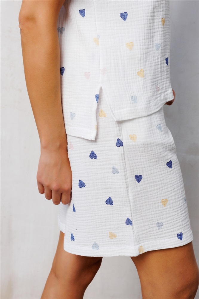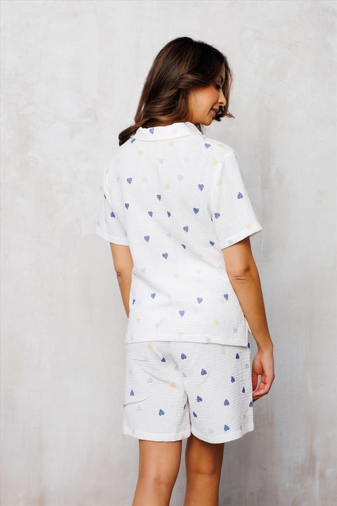 Застежка: без застежки Пижама с шортами женская из муслина от бренда Raposa идеальный вариант для домашнего отдыха или прогулок по пляжу. Изготовлена из натурального хлопкового текстиля, что делает ее максимально удобной и приятной к телу. Уютная пижамка больших размеров, оверсайз, подойдет как беременным женщинам, так и дамам плюс сайз. Узор в виде разноцветных сердечек придает пижаме особый шарм, а дышащий материал обеспечивает комфорт в жаркую погоду, благодаря чему пижамный комплект вполне применим как универсальный и стильный пляжный костюм. Модная пижама из хлопка 100 % понравится подросткам, эта женственная двойка свободного кроя приятна для тела и совершенно не стесняет движений. Пижама из муслина понравится поклонникам стиля оверсайз, хороша как подарок к любому празднику маме, жене, дочке, любимой девушке.