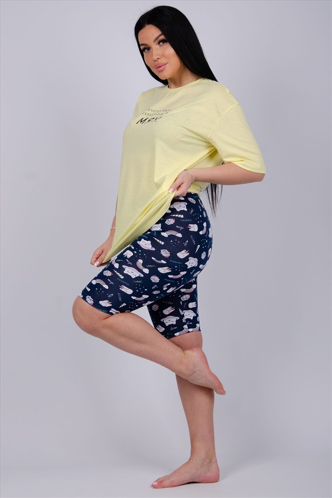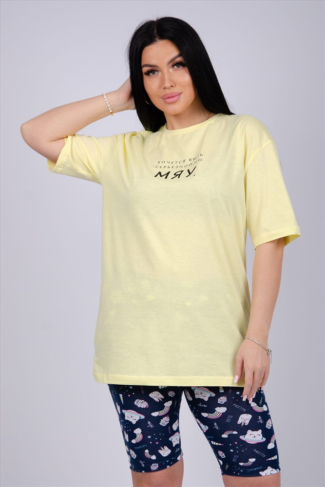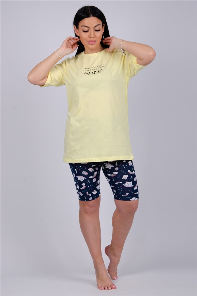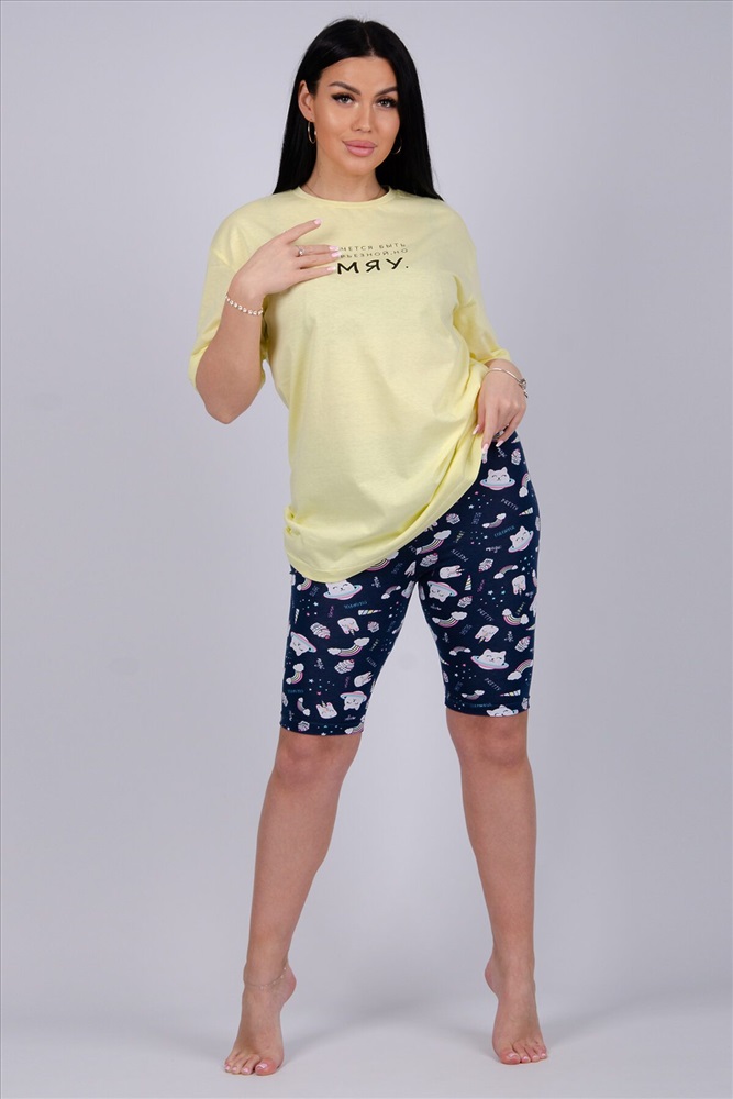 ID товара: 980376 Состав: Хлопок 100% Сезон: Весна/Лето Фасон: Прямой Рукав: Короткий Крой брючин: Облегающий Рисунок: Фантазийный Вид ткани: Кулирка Страна бренда: Россия Страна производства: Россия Костюм женский с велосипедками Комментарии к товару