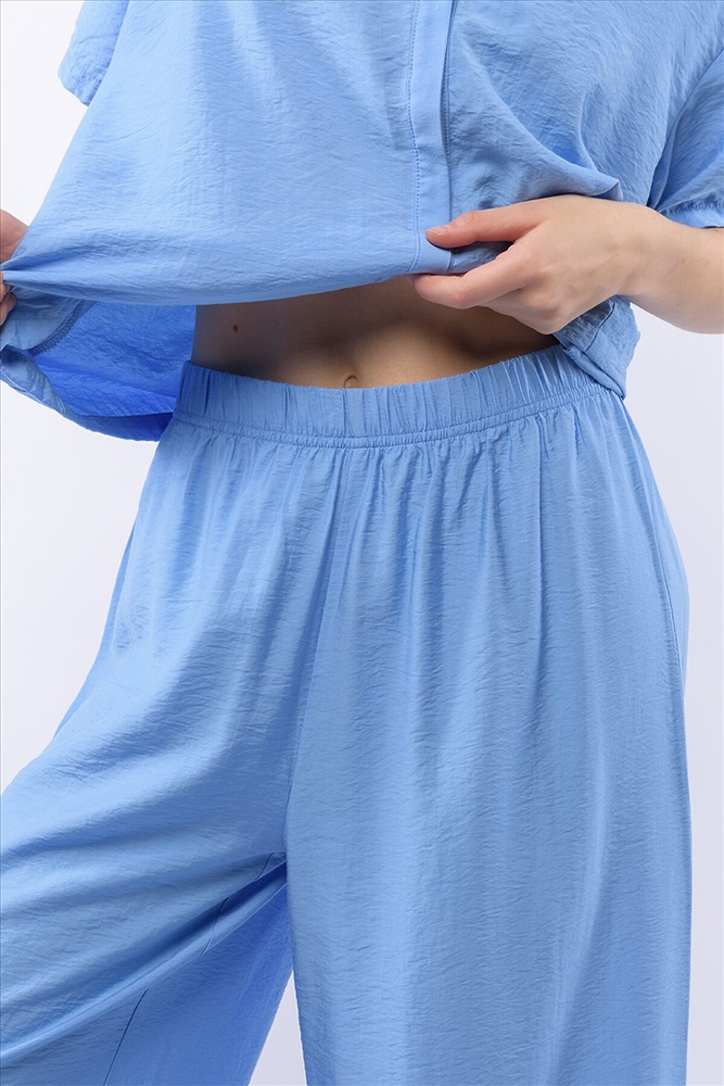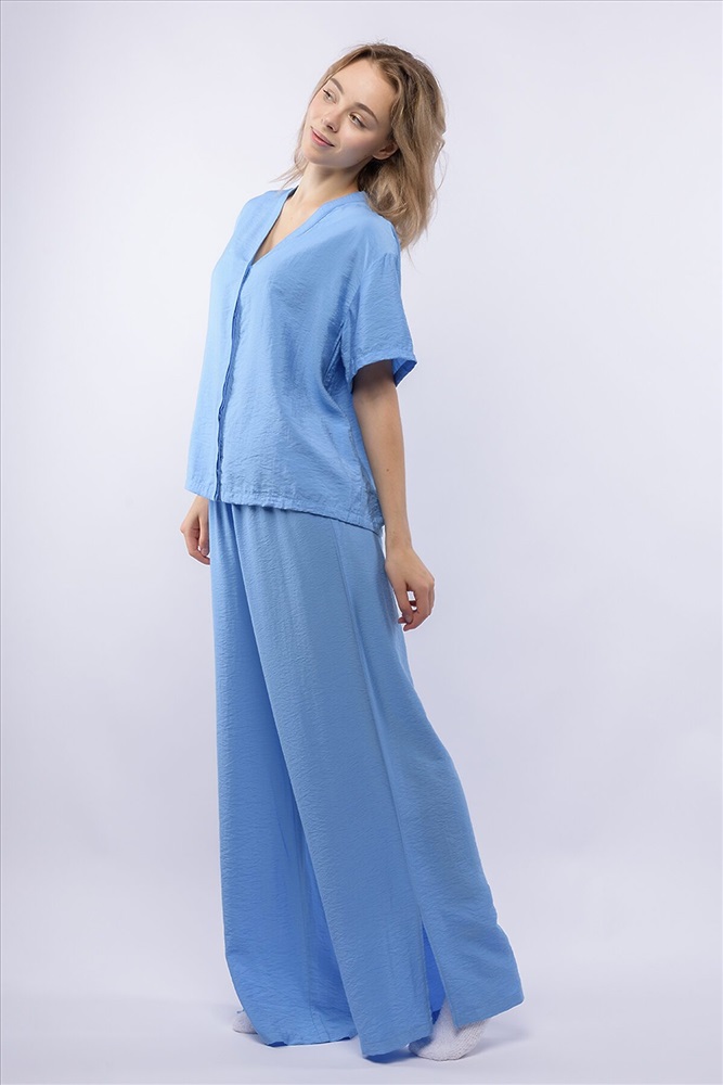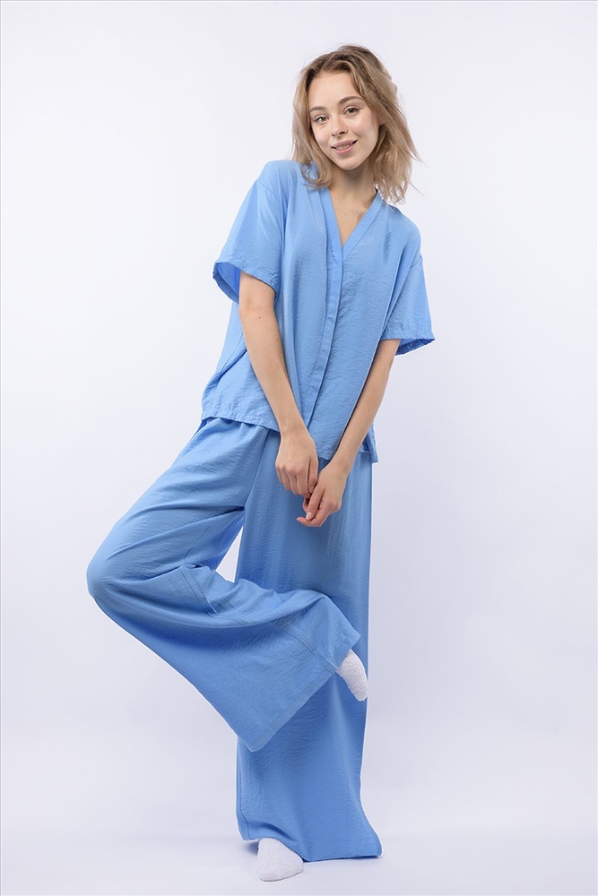 Домашний костюм OVERSIZE из эластичного вафельного трикотажа розово-бежевого цвета состоит из лонгслива и широких брюк. Лонгслив с V-образным вырезом с 2 пуговицами, отделка горловины из материала изделия. Рукав длинный без манжет, подгиб и плоский шов по запястью и низу изделия. Брюки на широкой резинке со шнурком. Подгиб и плоский шов по низу брюк. XS-XS(170-84-90), S-S(170-88-94), M-M(170-92-98), L-L(170-96-102), XL-XL(170-100-106)