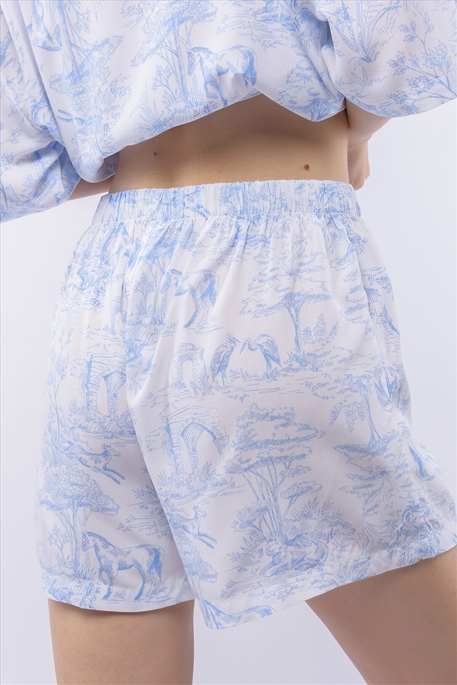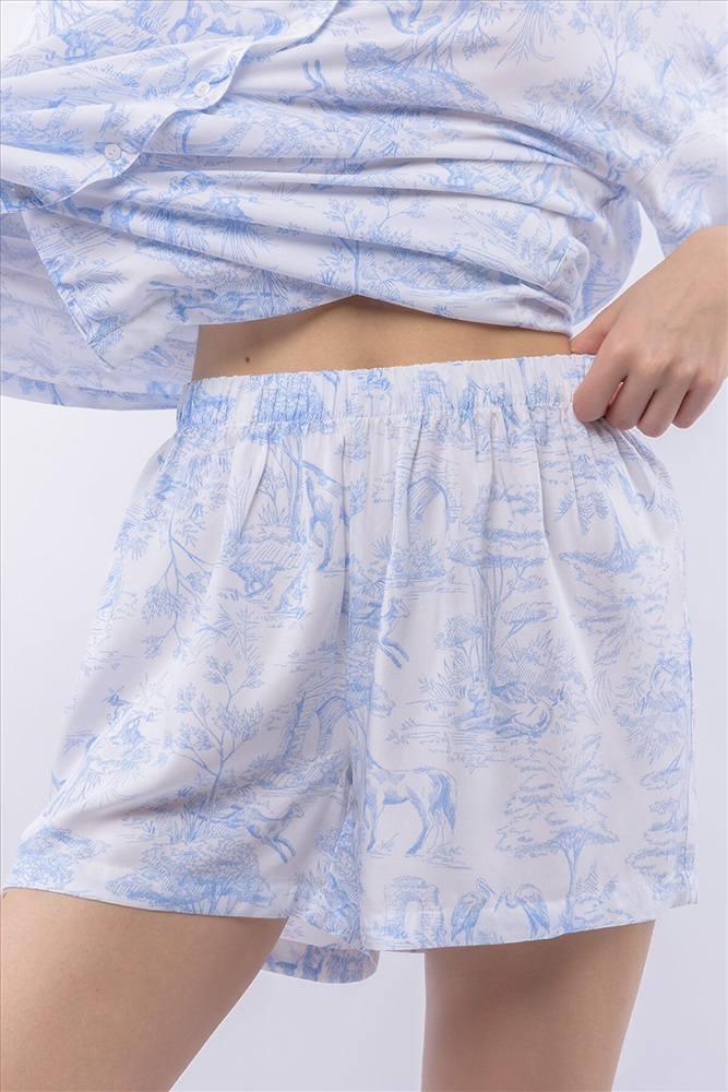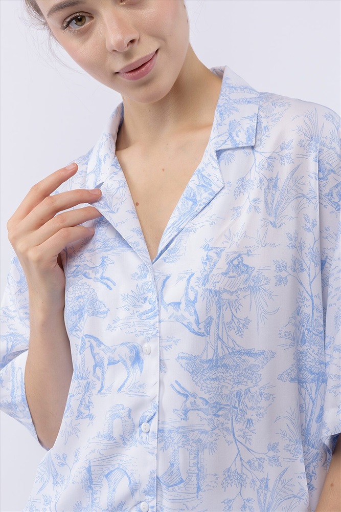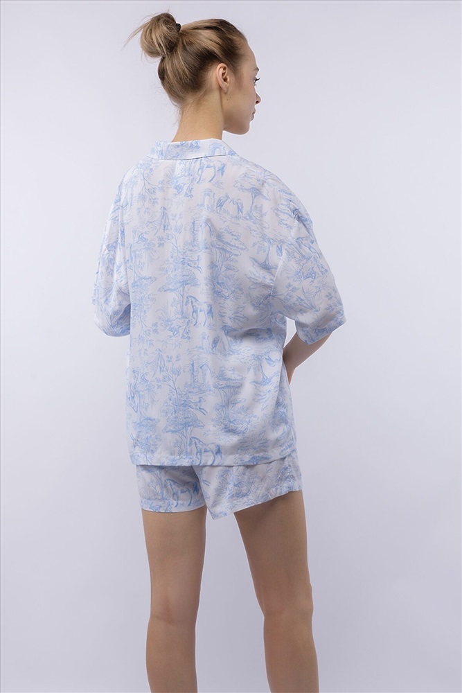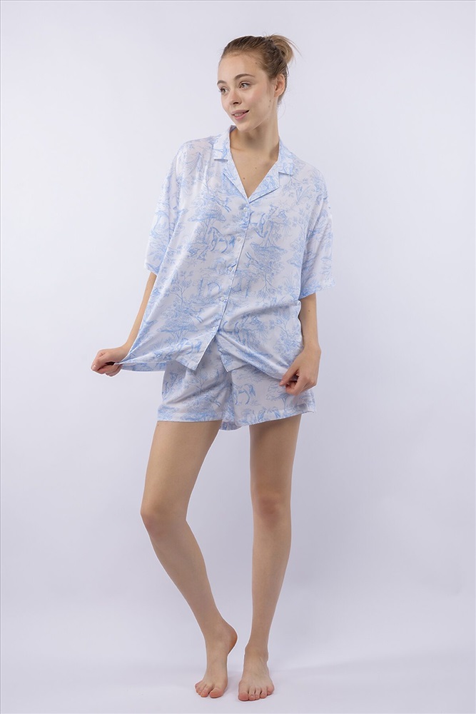 ID товара: 1201763 Состав: 100% Вискоза Сезон: Демисезон Длина: Средняя Фасон: Свободный Рукав: Короткие Вид застежки: Пуговицы Основная ткань: Вискоза Страна бренда: Россия Страна производства: Россия Домашний костюм из тканой вискозы состоит из рубашки и шорт. Принт : «Туаль де Жуи» (Toile de Jouy) — это французская ткань с одноцветным рисунком в синих тонах на светлом фоне, изображающим пасторальные сцены, пейзажи или сцены из жизни XVIII века. Рубашка с английским воротником, на пуговицах, с коротким рукавом. Короткие шорты на резинке. Подгиб и строчка по низу рукава и рубашки и низу брюк. XS-XS(170-84-90), S-S(170-88-94), M-M(170-92-98), L-L(170-96-102), XL-XL(170-100-106) Комментарии к товару