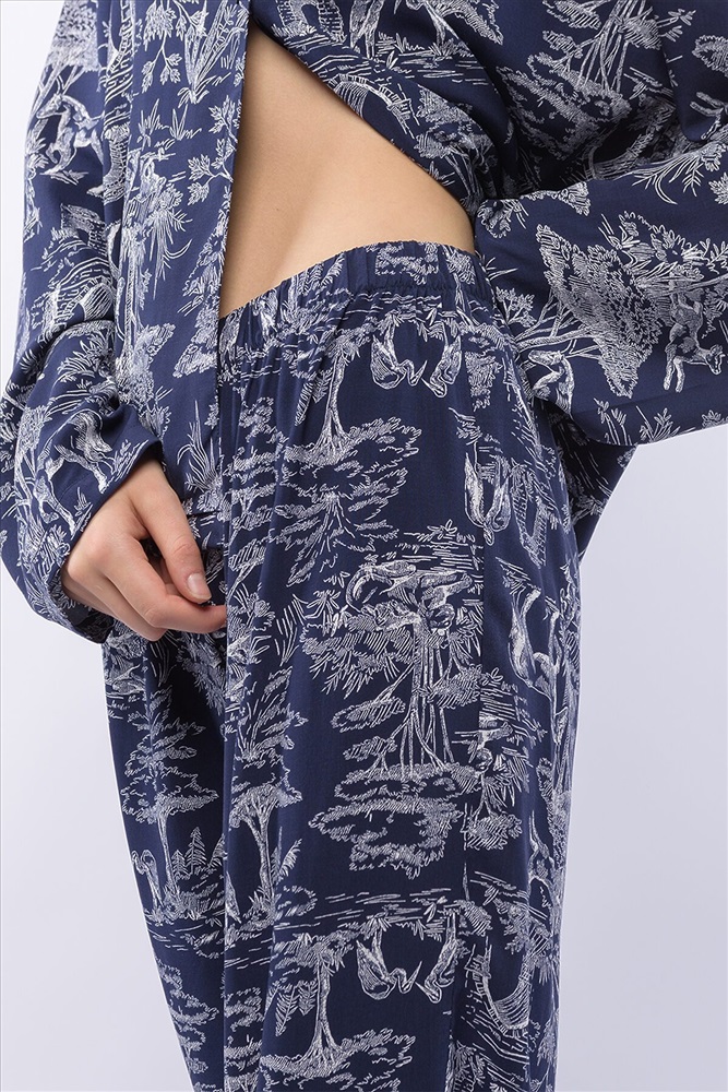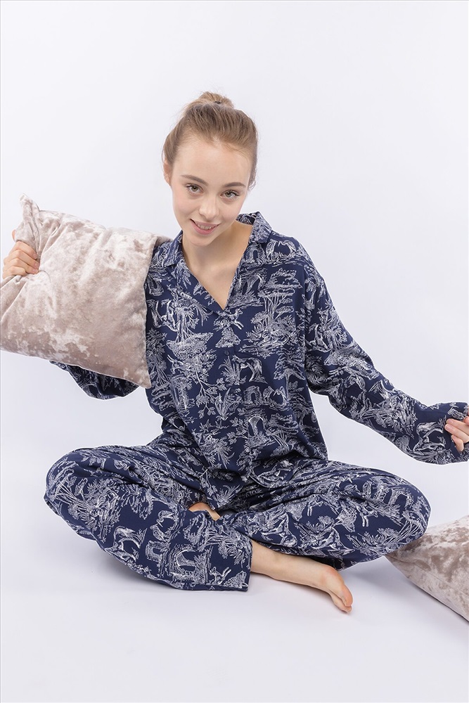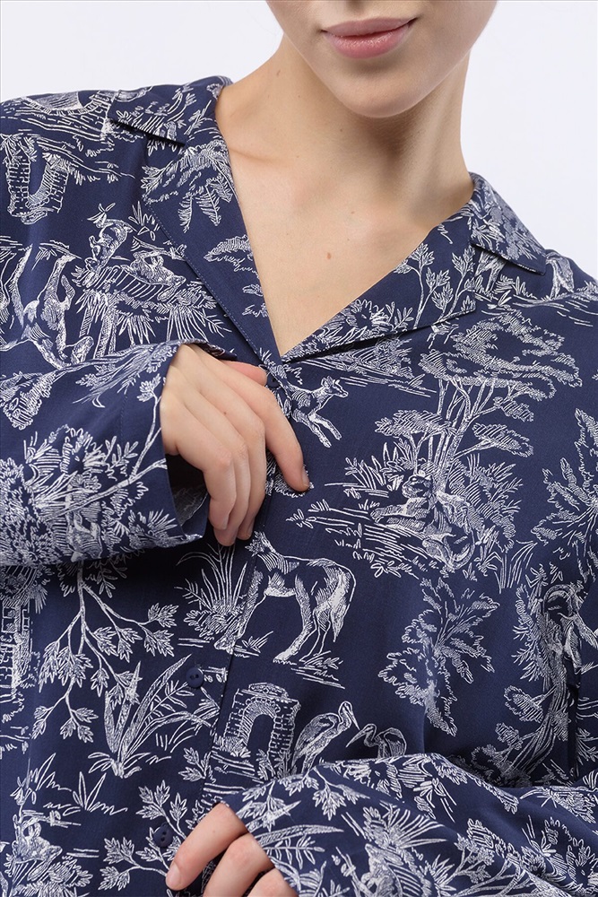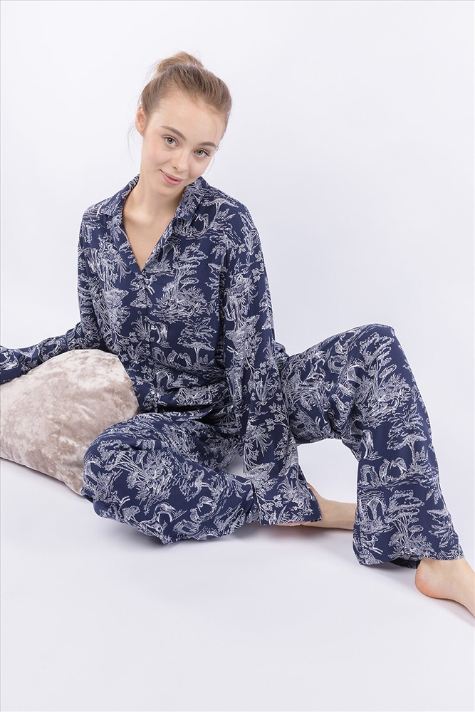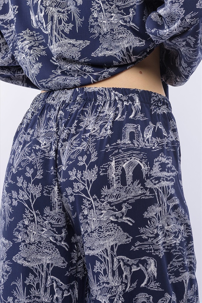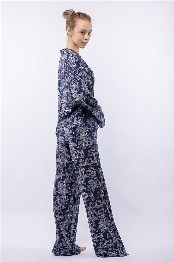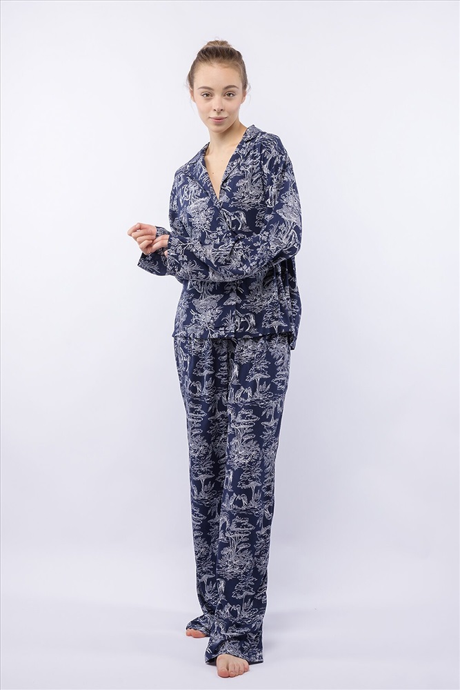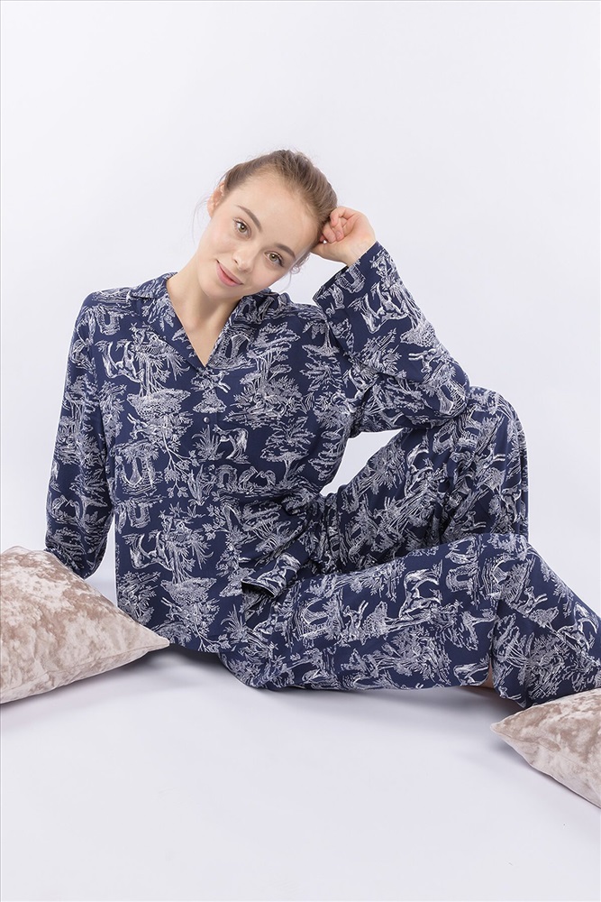 Домашний костюм из тканой вискозы состоит из рубашки и длинных широких брюк. Принт : «Туаль де Жуи» (Toile de Jouy) — это французская ткань с одноцветным рисунком в белых тонах на синем фоне, изображающим пасторальные сцены, пейзажи или сцены из жизни XVIII века. Рубашка с английским воротником, на пуговицах, с длинным рукавом без манжет. Брюки на резинке. Подгиб и строчка по низу рукава и рубашки и низу брюк. XS-XS(170-84-90), S-S(170-88-94), M-M(170-92-98), L-L(170-96-102), XL-XL(170-100-106)
