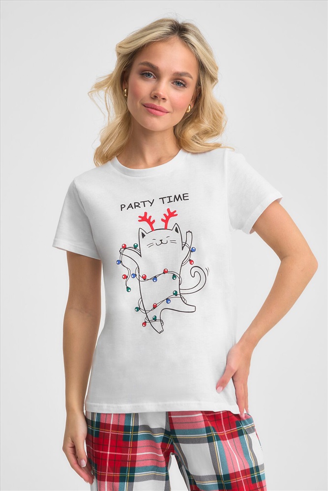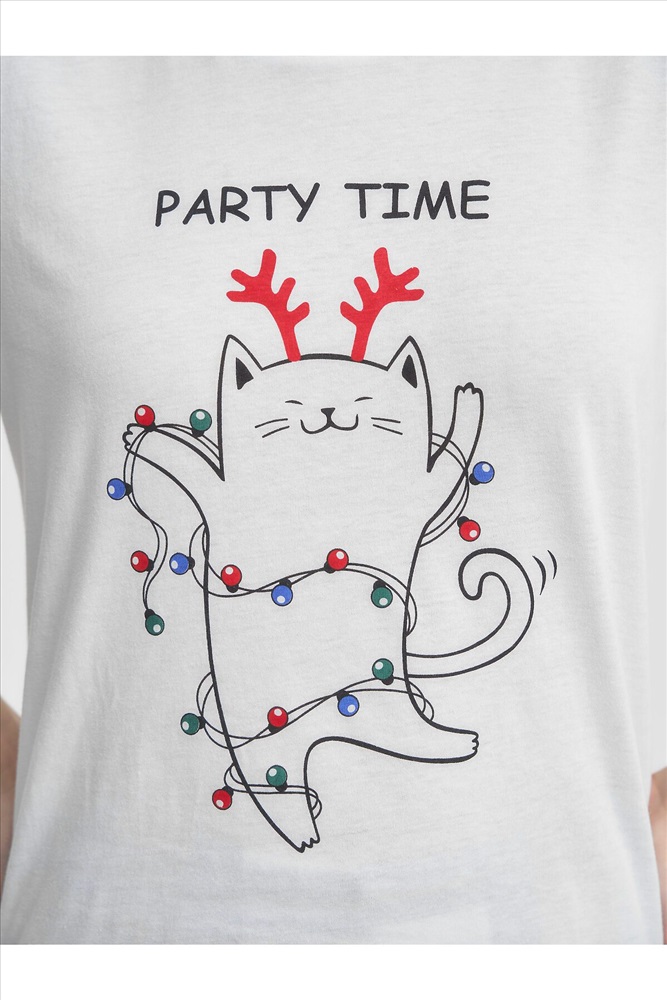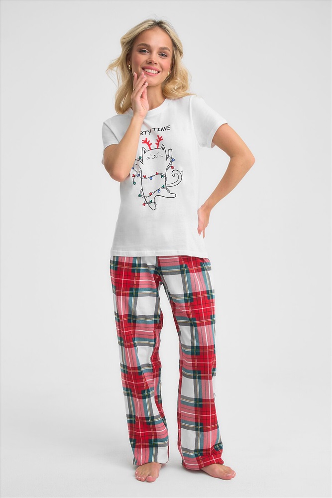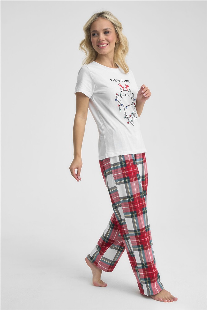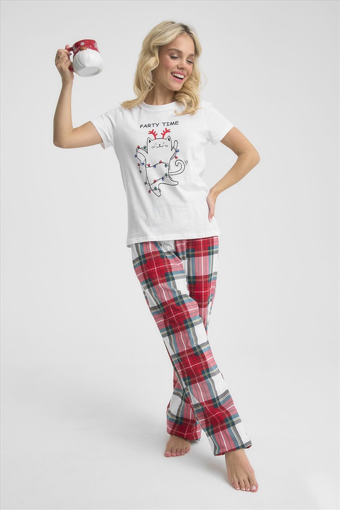 ID товара: 1215051 Состав: 100% Хлопок Сезон: Демисезон Длина: Полная Фасон: Прямой Рукав: короткие Декоративные элементы: Принт Основная ткань: Хлопок Страна бренда: Россия Страна производства: Россия Трикотажная пижама с Новогодней тематикой. Белая футболка свободного кроя длиной до бердра украшена принтом веселого котика с гирляндой. Принтованные брюки свободного кроя на резинке. Комментарии к товару