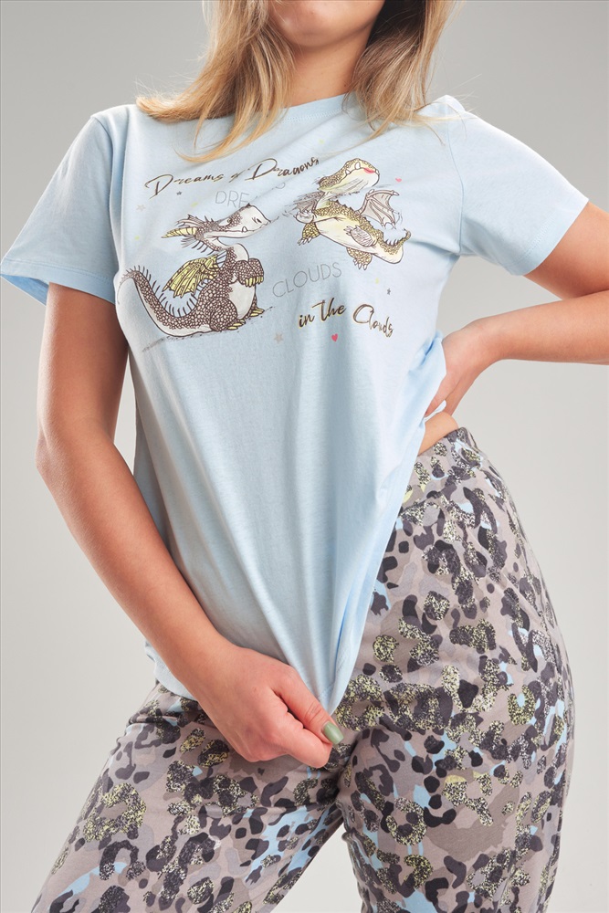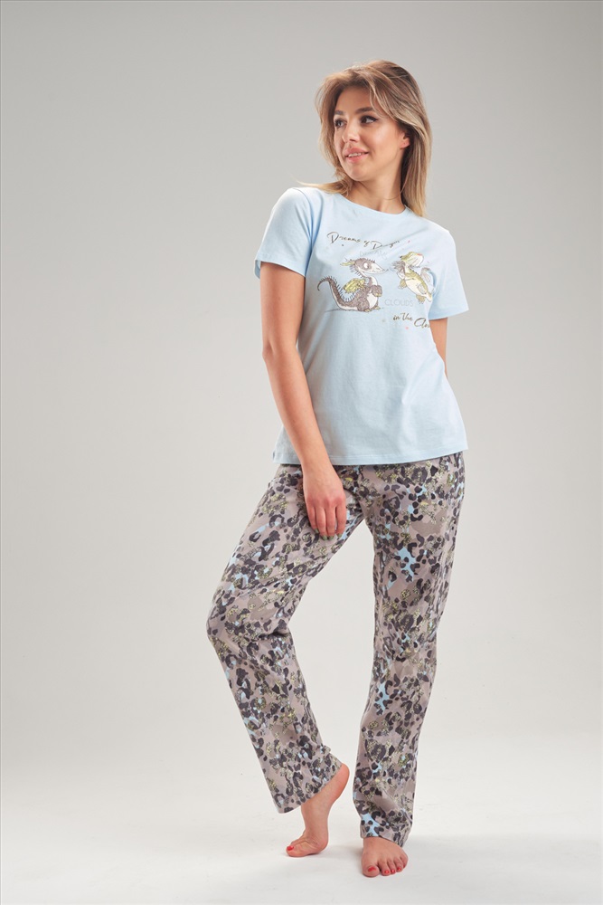Застежка: без застежки Пижама с брюками и футболкой. Футболка с втачным рукавом и декоративной, глянцевой печатью в стиле шелкографии. Брюки прямого силуэта на резинке с карманами.