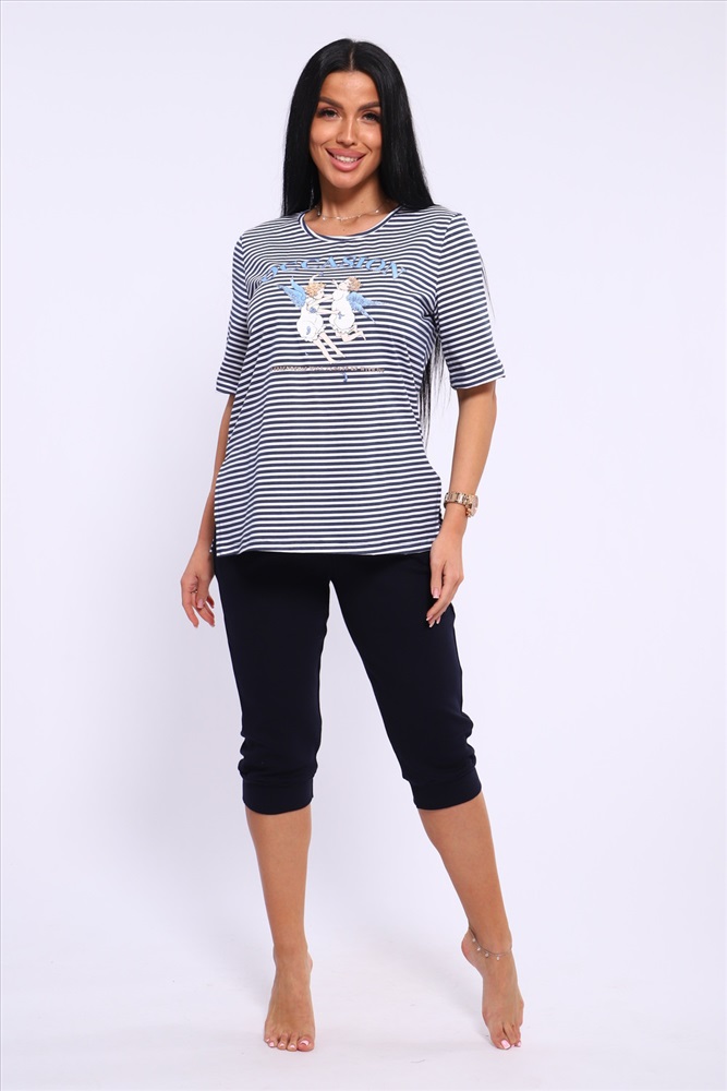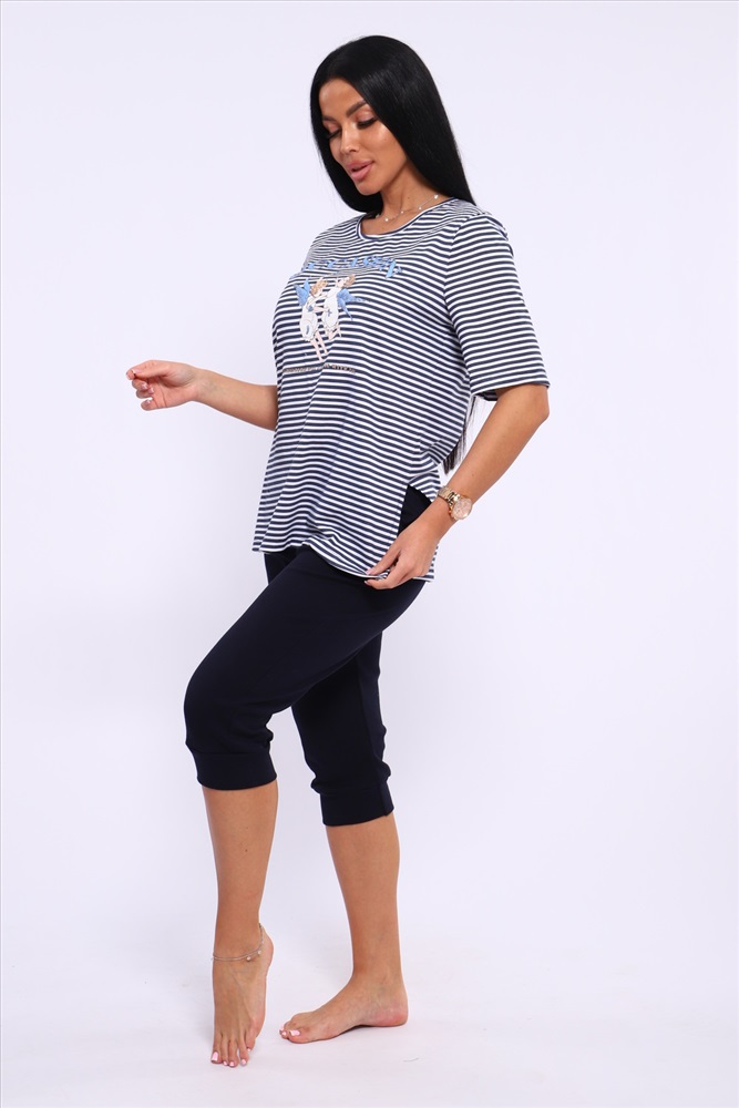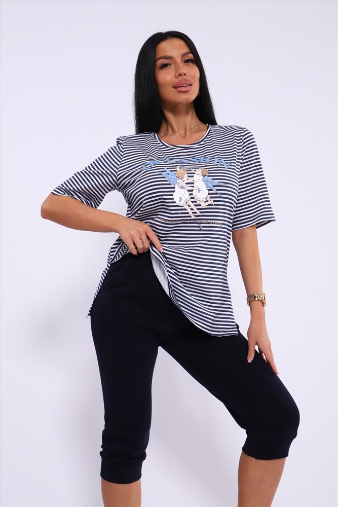 Застежка: без застежки Пижама из хлопка свободного кроя. Футболка с боковыми разрезами и декоративной, глянцевой печатью в стиле шелкографии с добавлением глиттера. Бриджи на резинке с карманами.
