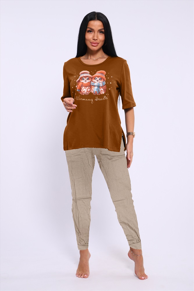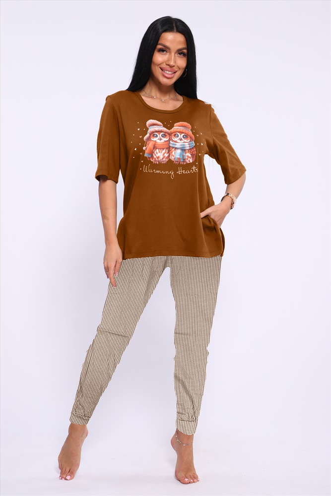 Состав: 100% хлопок Модель: Пижама ТК 387 Тип товара: пижама с брюками Материал: интерлок | интерлок Бренд: NINEL Карман: боковые Назначение: для дома НДС: Без НДС Особенности: на резинке Отделка: с карманами | с печатью Посадка: высокая посадка Рейтинг: Рейтинг 4 и выше Рисунок: клетка | зверюшки Рукав: короткий рукав Сезонность: лето | осень | весна | зима Силуэт: свободный Стиль: домашний Воротник: без воротника Застежка: без застежки Пижама женская с футболкой и брюками на резинке и боковыми карманами. Таблица размеров и весафутболка