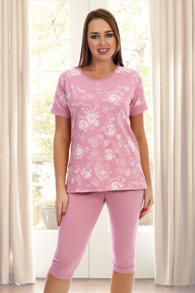 ID товара: 275246 Состав: 100% Хлопок Сезон: Весна/Лето Длина: Средняя Фасон: Повседневный Рукав: Короткий Основная ткань: Хлопок | Кулирка, Кулирка — это самое тонкое и гладкое трикотажное полотно, изготовленное из чистого хлопка. Полотно имеет характерную структуру- с лицевой стороны плоские «косички», с изнаночной – «кирпичная кладка». Особенности- гигроскопична, воздухопроницаема, при стирке, сушке и глажке не садится, хорошо держит форму, не образует складки. Стиль: Повседневный Страна бренда: Россия Страна производства: Россия Пижама с бриджами. Кофта полуприлегающего силуэта с однотонной вставкой по горловине, украшенной пуговицами Комментарии к товару