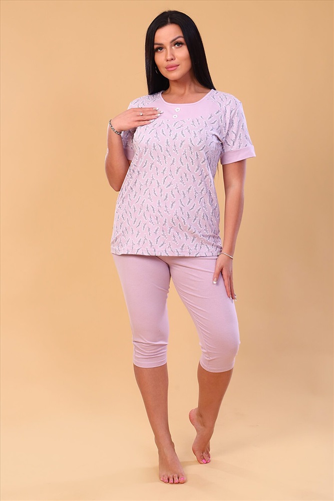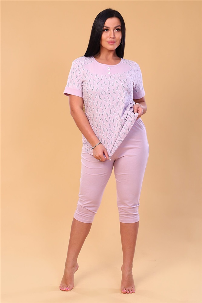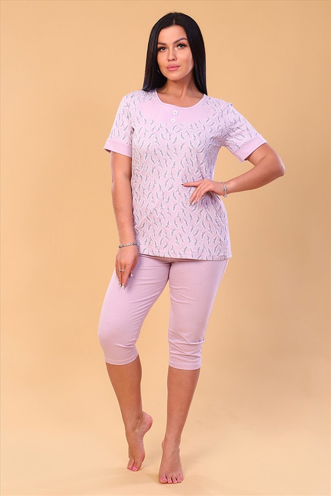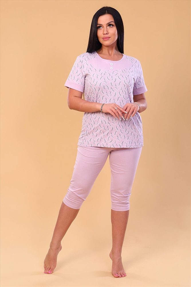 Страна производства: Россия Пижама с бриджами. Кофта полуприлегающего силуэта с однотонной вставкой по горловине, украшенной пуговицами