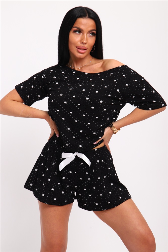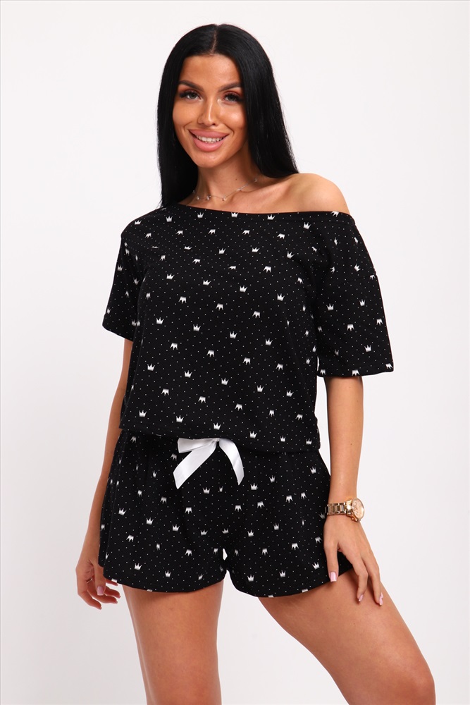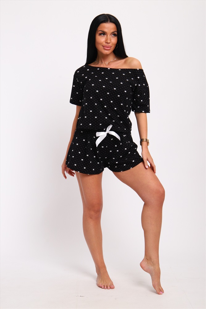 Застежка: без застежки Пижама женская футболка и шорты. Футболка свободного кроя с широким вырезом горловины. Рукав короткий на спущенном плече.