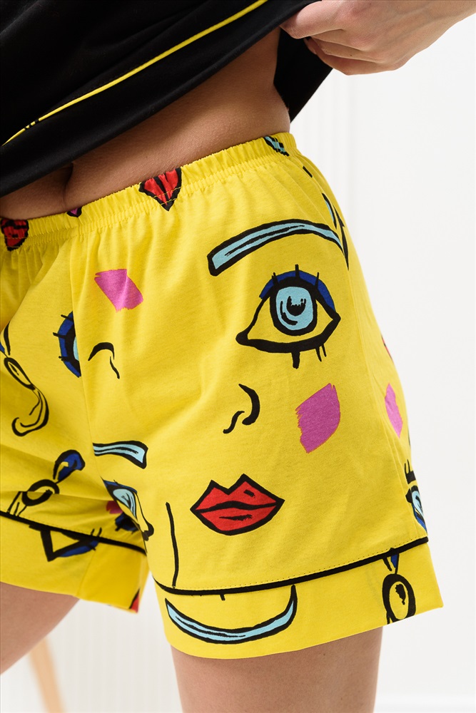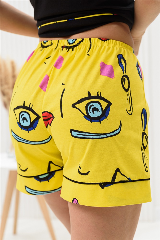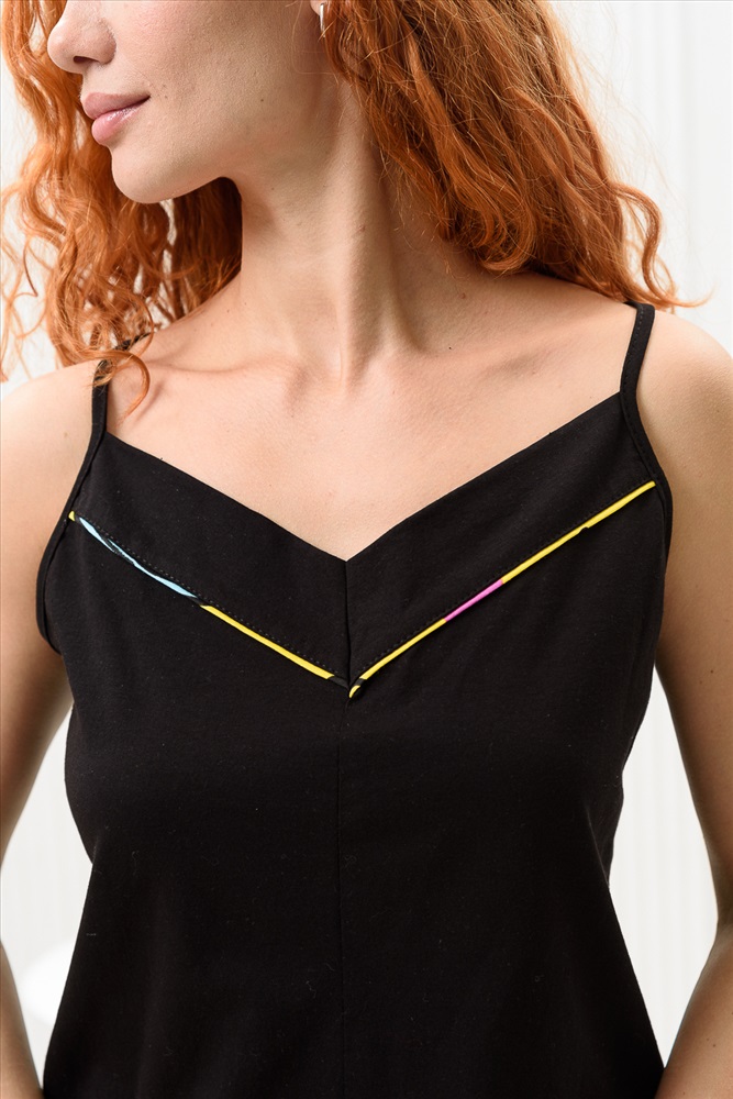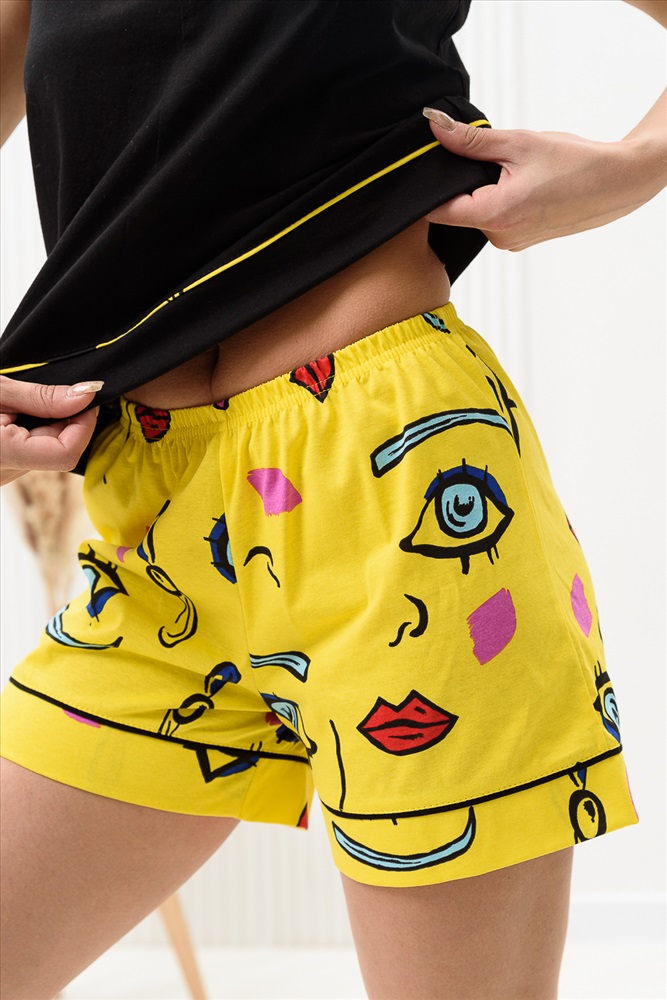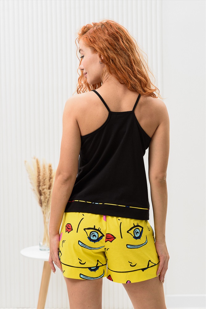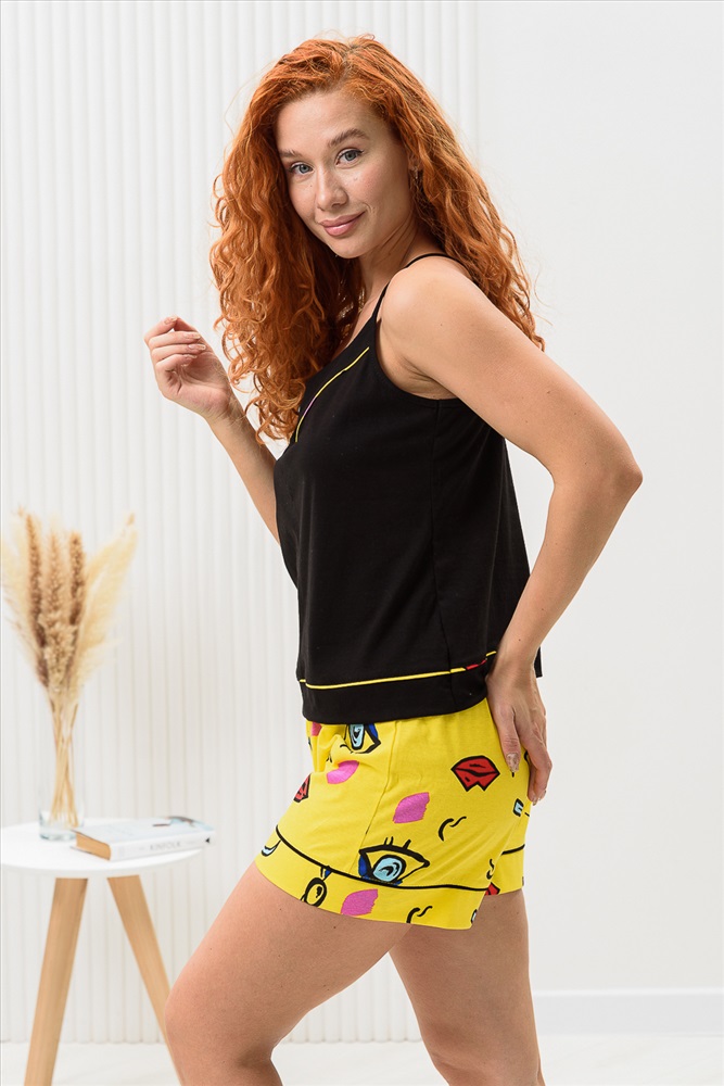 Стиль: домашний | молодежный Комплект состоит из майки и шорт. Майка на тонких бретелях, с V-образной горловиной на полочке, с отделочным кантом по горловине и низу. Горловина и бретели обработаны бейкой из основного полотна. Шорты прямые, короткие, с манжетом и отделочным кантом, на резинке.