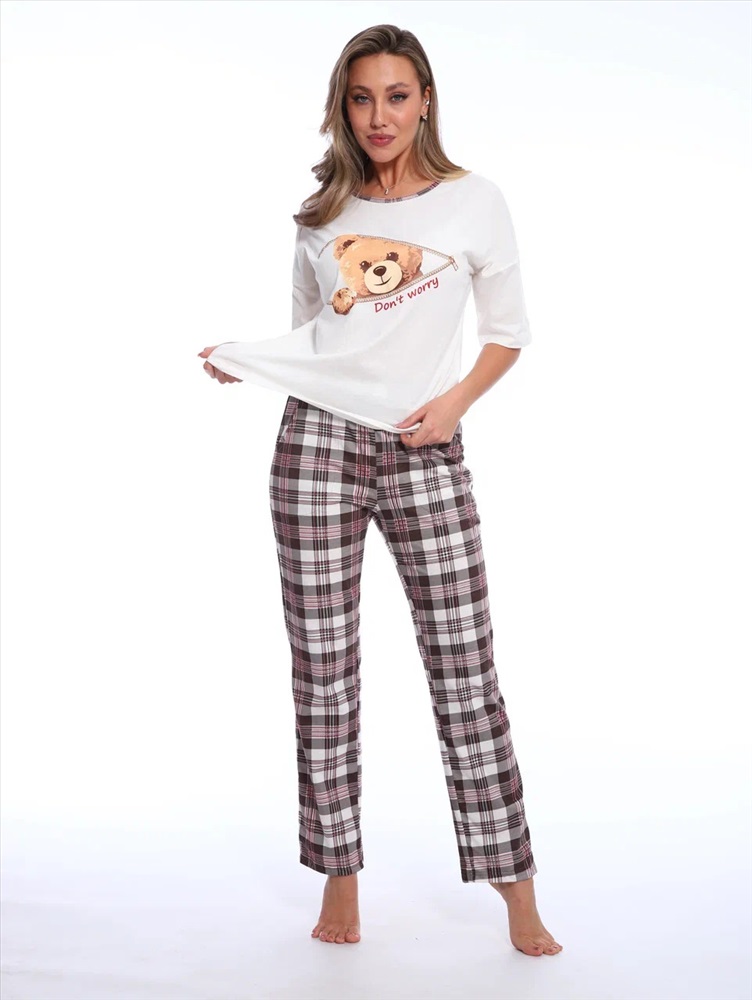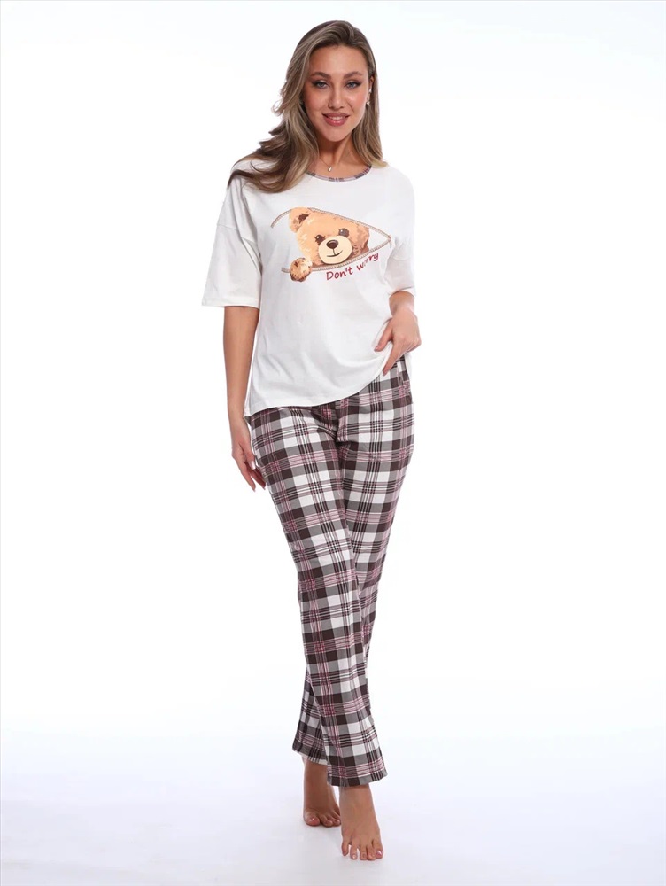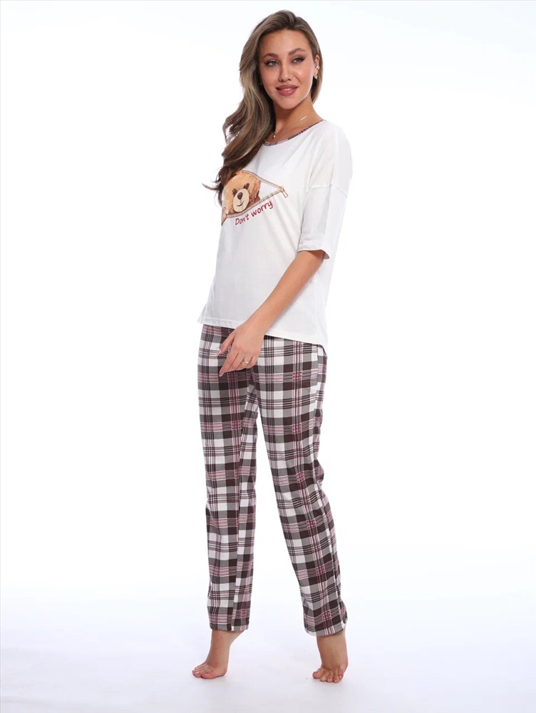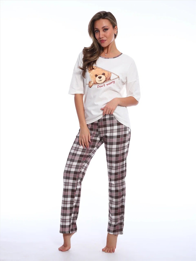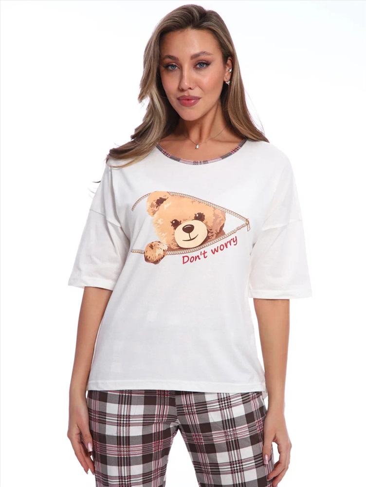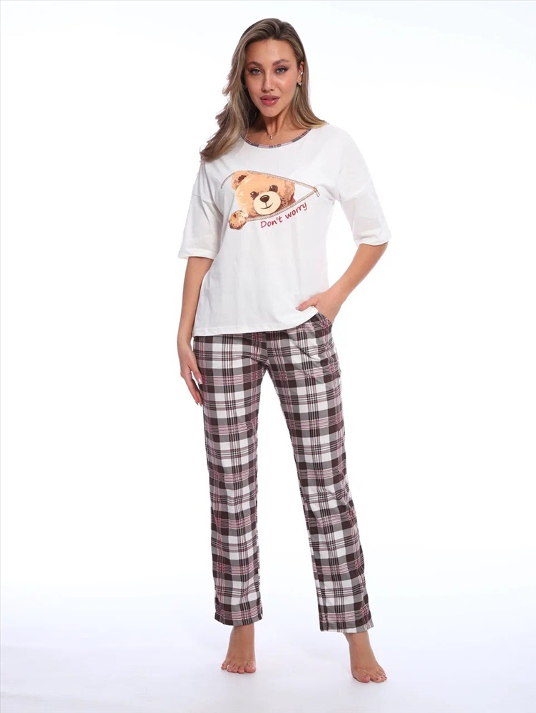 Состав: хлопок 100% Модель: Пижама женская с удлиненной футболкой и брюками в клетку, Арт. 518 Тип товара: пижама с брюками Материал: кулирка | кулирка пенье | кулирка | кулирка пенье Бренд: Vesta' Карман: боковые Назначение: для дома НДС: Без НДС Особенности: на резинке Отделка: с карманами | с печатью Посадка: средняя посадка Рисунок: клетка | разное Рукав: короткий рукав Сезонность: лето | осень | весна | зима Силуэт: прямой | свободный Стиль: домашний Воротник: без воротника Застежка: без застежки Женская пижама из 100% хлопка с рисунком медвежонка на удлиненной сзади футболками и клетчатыми брюками уют и стиль для вашего дома Женский домашний костюм, выполненный из натурального 100% хлопка (кулирка), обеспечивающего непревзойденный комфорт и воздухопроницаемость. Этот комплект сочетает в себе стильный дизайн и продуманную функциональность, идеально подходя для отдыха и сна. Особенности комплекта: Футболка: Нежного цвета слоновой с легким кремовым оттенком, придающим мягкость образу. Рукава длиной до локтя и спущенная линия плеча обеспечивают свободу движений. Удлиненная спинка добавляет комфорта и современный акцент. Очаровательный рисунок медвежонка приносит нотку игривости. Горловина оформлена кантом в тон брюк, создавая гармоничный образ. Брюки: Стильный клетчатый принт с белой основой, широкими бежевыми и тонкими красными линиями. Прямой крой обеспечивает комфорт и свободу движений. Наличие карманов добавляет практичности и удобства. Преимущества нашего домашнего костюма: Натуральный материал: 100% хлопок (кулирка) обеспечивает мягкость, гипоаллергенность и отличную воздухопроницаемость, позволяя коже дышать. Стильный дизайн: Современное сочетание кремовой футболки с рисунком и клетчатых брюк подходит для женщин, ценящих комфорт и моду. Удобство в уходе: Ткань сохраняет форму и цвет после многократных стирок, обеспечивая долговечность изделия. Рекомендации по уходу: Рекомендуется деликатная стирка при температуре не выше 30C. Избегайте отбеливателей и химической чистки. Сушить в расправленном виде, гладить при средней температуре с изнаночной стороны. Подарите себе комфорт и стиль с нашим женским домашним костюмом из 100% хлопка. Идеальный выбор для уютных вечеров и спокойного сна. Наши пижамки идеальны для перепродажи, вшиты только размеры, можно легко нашить Ваш логотип. Таблица размеров и весафутболка