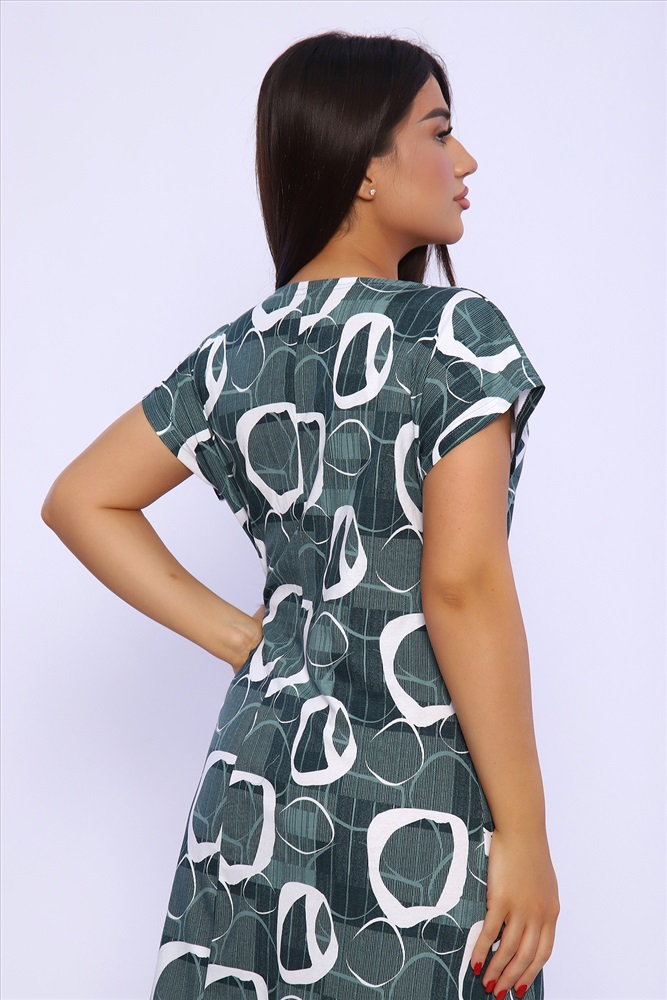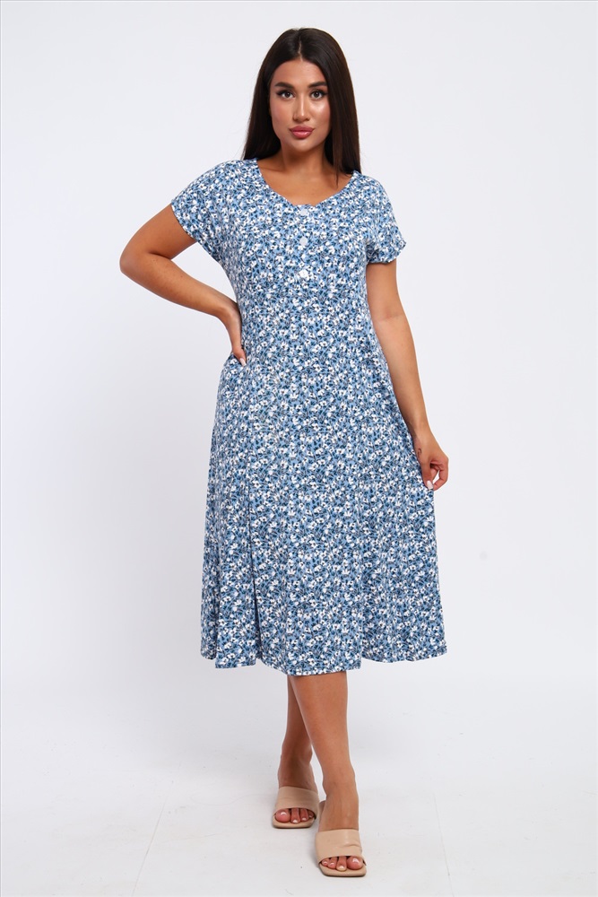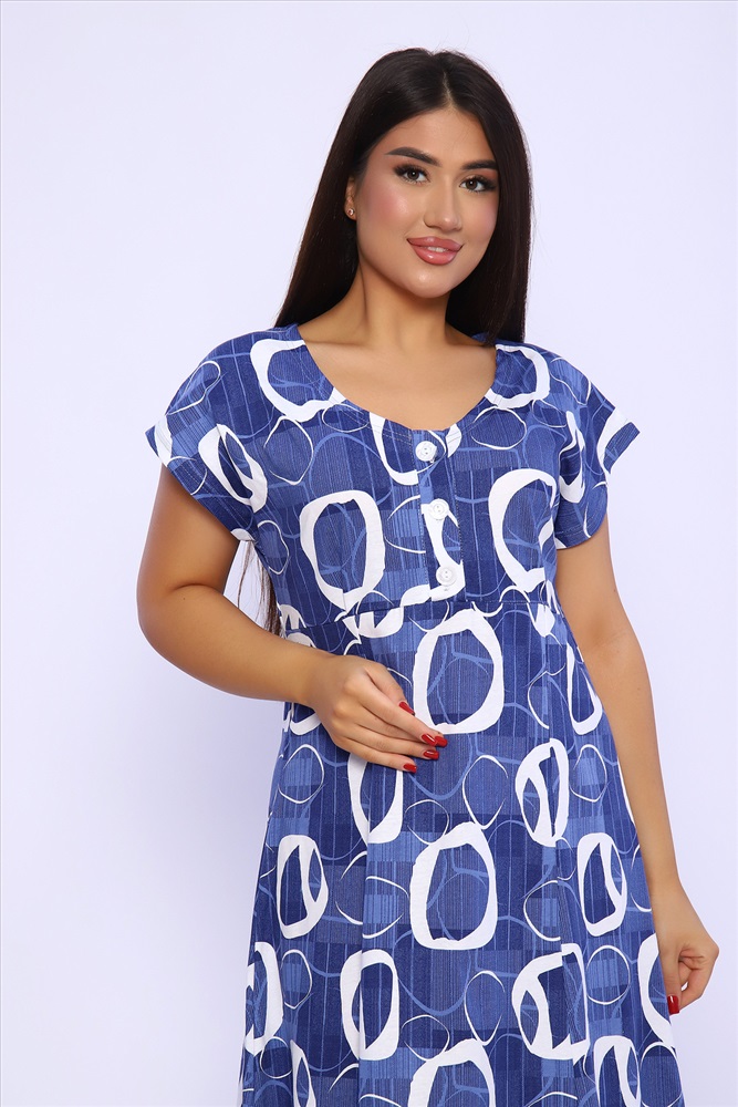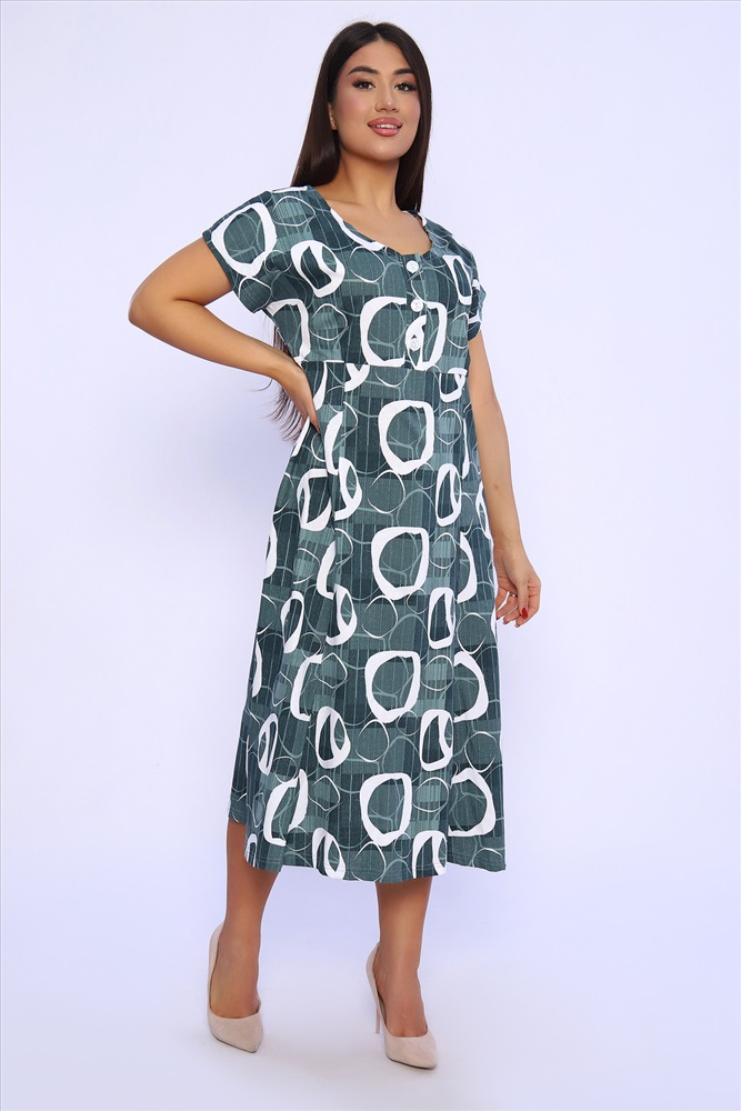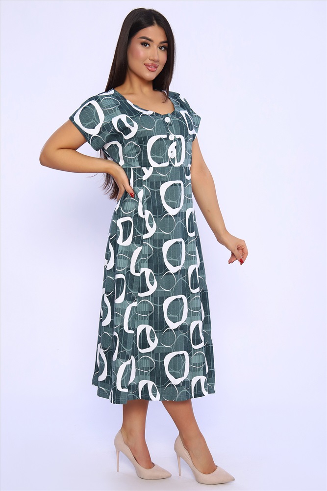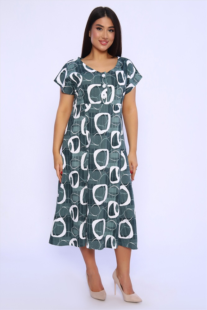 Застежка: пуговицы Платье женское со спущенным рукавом из кулирки 100% хлопок, с подрезом, планка на пуговицах, внизу расклешение. Идеально подойдет для прогулок и отдыха.