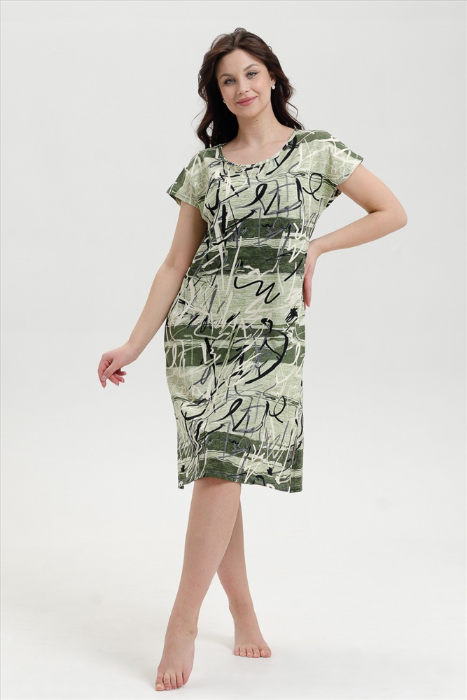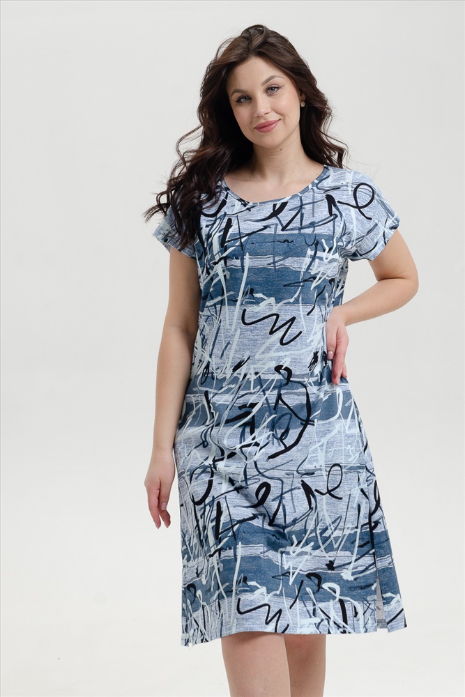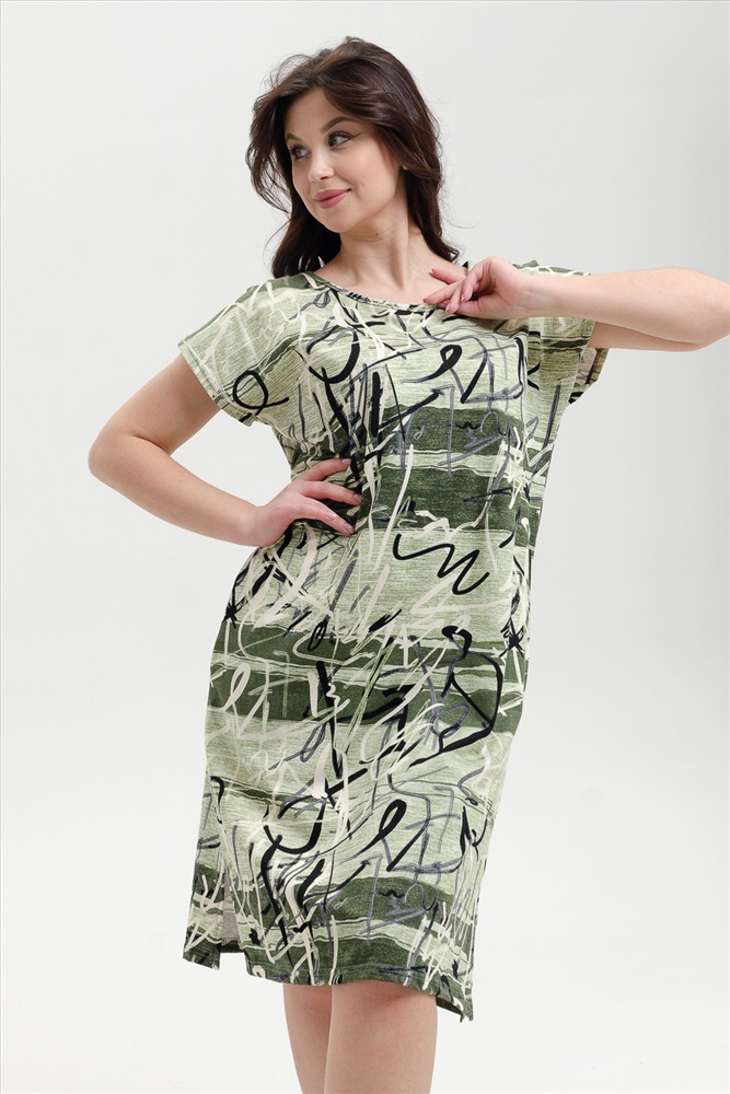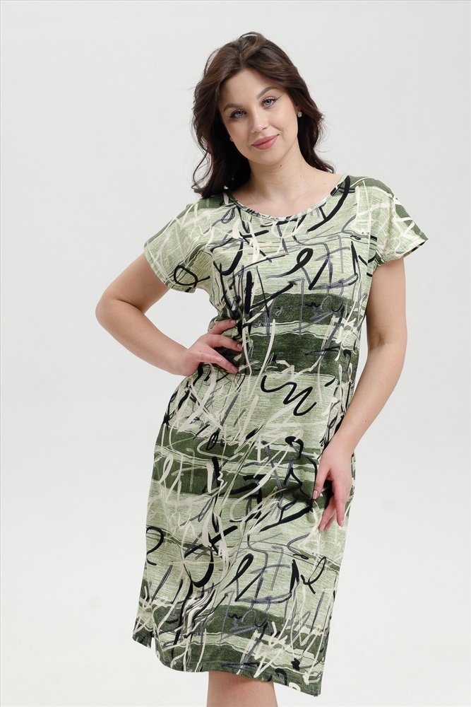 Застежка: без застежки Платье женское средней длины выполнено из кулирки 100% хлопок оригинальной расцветки. Рукав спущенный, в боках карманы, горловина обработана узким кантом.