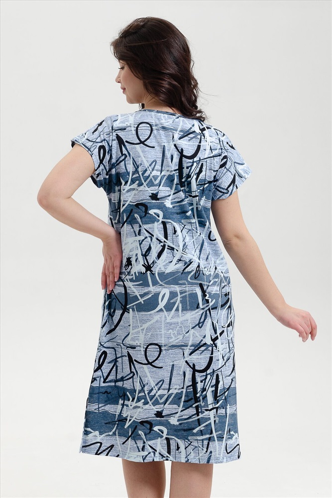 Страна производства: Россия Платье женское средней длины выполнено из кулирки 100% хлопок оригинальной расцветки. Рукав спущенный, в боках карманы, горловина обработана узким кантом.