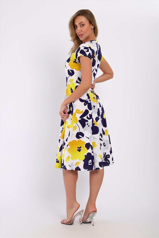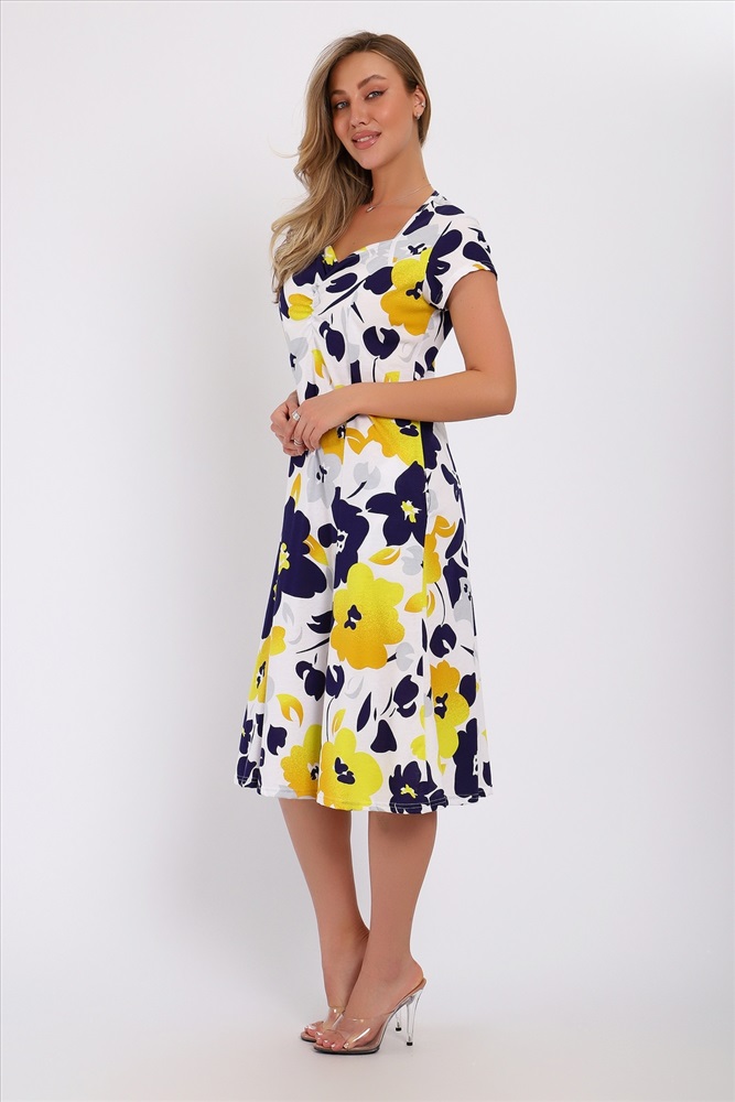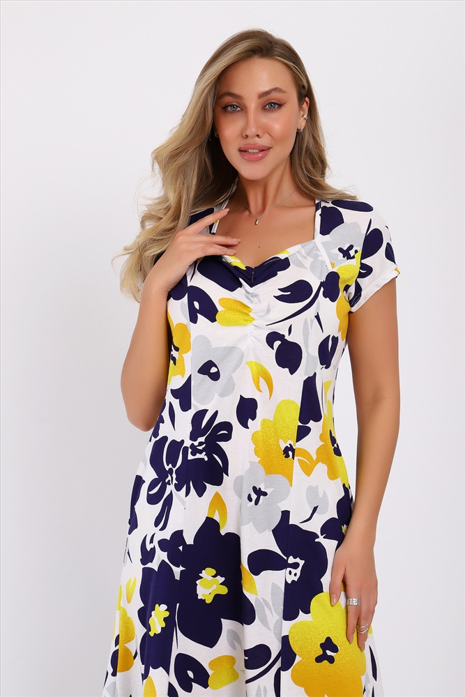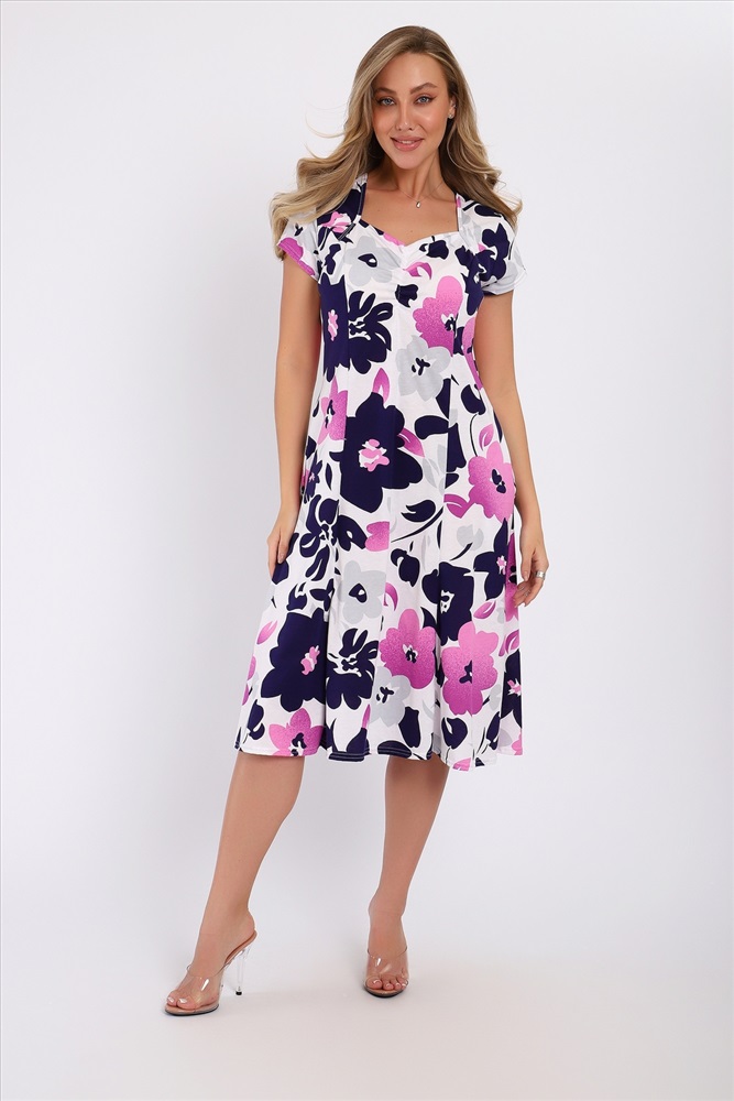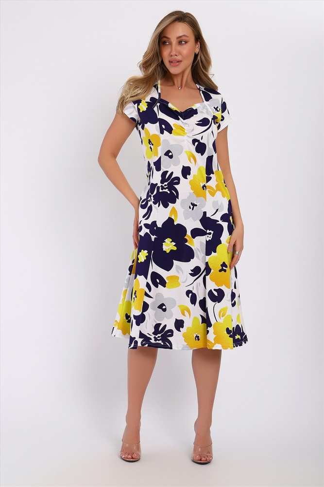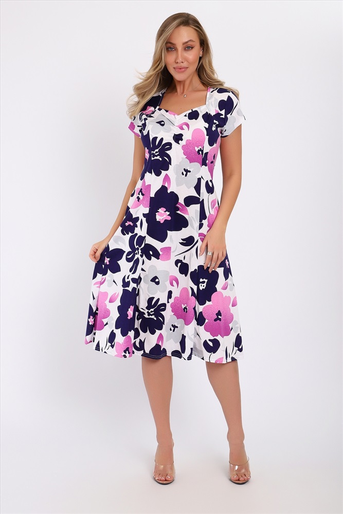 Застежка: без застежки Легкое летнее платье выполнено из кулирки 100% хлопок яркой оригинальной расцветки. Платье средней длины, приталенное, к низу расклешенное, рукав короткий, в области груди со сборкой. Идеально подойдет для прогулок и отдыха.