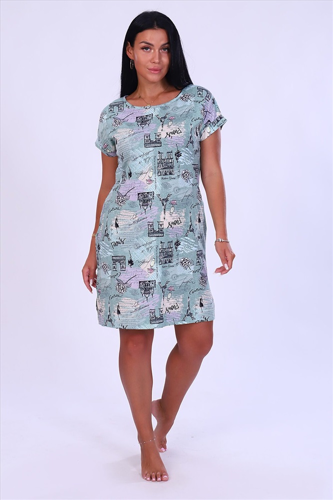 Страна производства: Россия Платье для дома и отдыха. Рукав цельнокроеный, с манжетом, длина выше колена. По бокам разрезы.