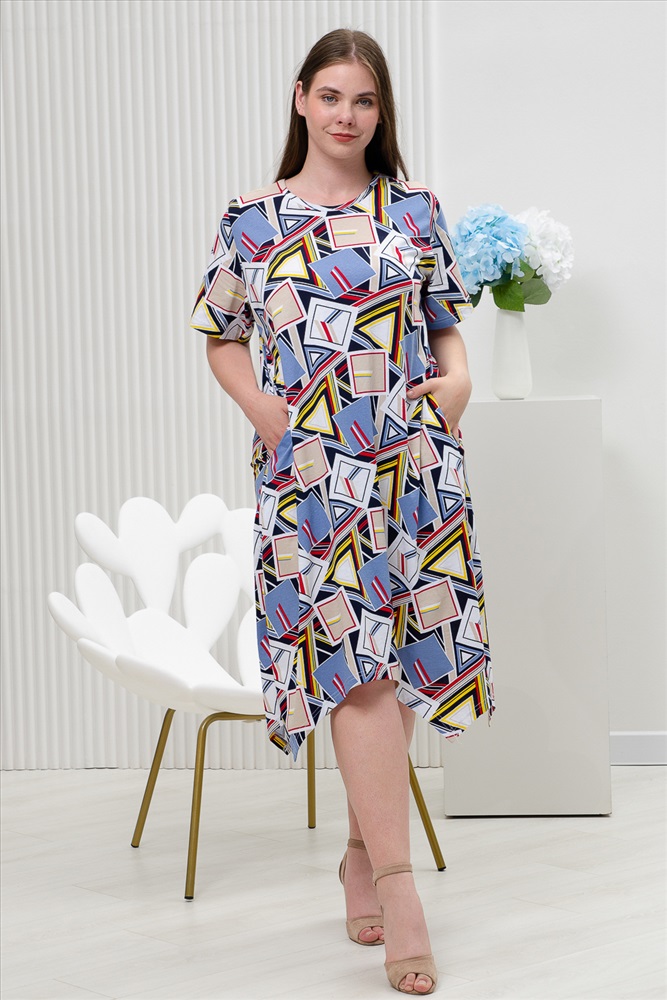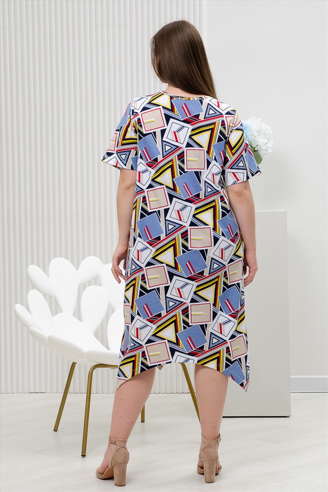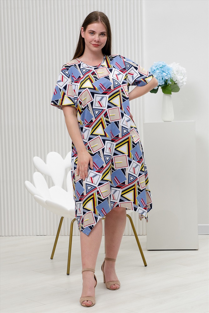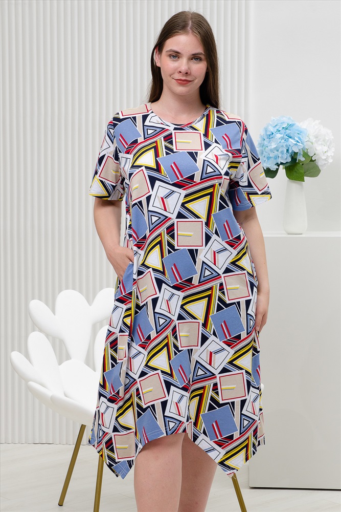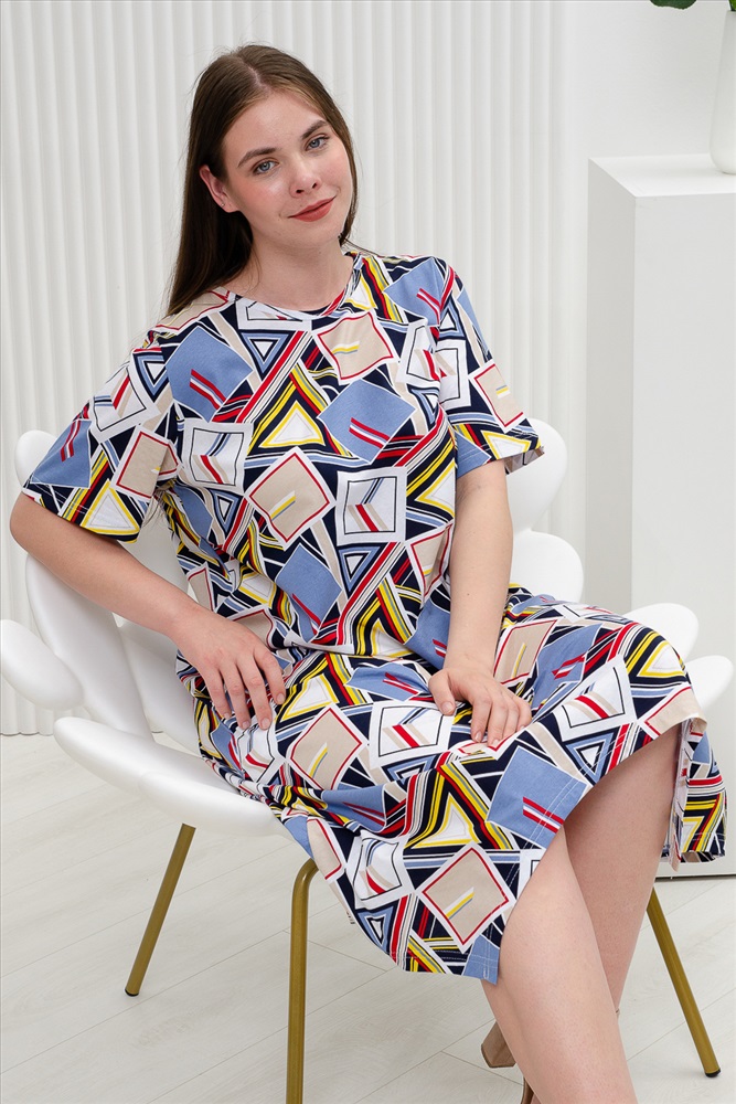 Состав: 100% хлопок Модель: Платье 11870 Тип товара: платье Материал: кулирка | кулирка Бренд: Натали Суслова Длина: средняя длина Карман: прорезные НДС: 22% Отделка: с карманами Рисунок: геометрия Рукав: короткий рукав Сезонность: лето | осень | весна Силуэт: свободный Скидка: любая | от 10% и больше Стиль: повседневный Воротник: без воротника Застежка: без застежки Платье женское имеет свободный крой, фигурный низ и короткий рукав. С принтом геометрия выполнена из 100% натурального хлопка. Свободный стиль подходит для любой женщины, ведь он может скрыть недостатки фигуры и подчеркнуть ее достоинства. Платье послужит прекрасным подарком для себя, коллеги и любимым дочке или сестре. Натуральный состав из 100% хлопка обеспечит вам комфорт и хорошее настроение. Данная модель платья отлично подойдет для прогулки, на пляж, море, повседневное, на каждый день, домашней одежды, станет платьем Вашего лета. Таблица размеров и веса