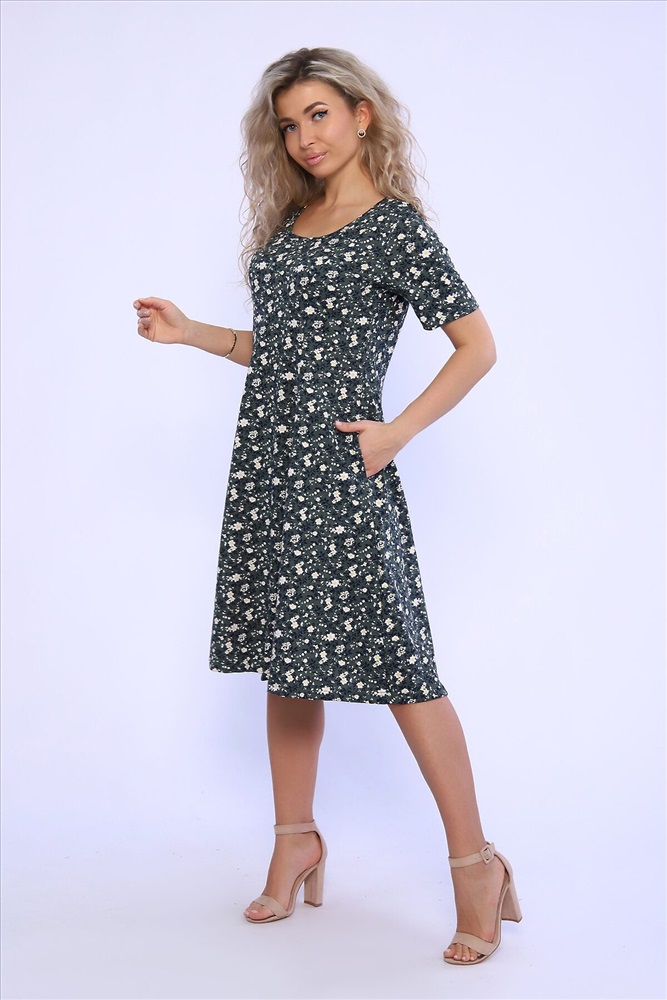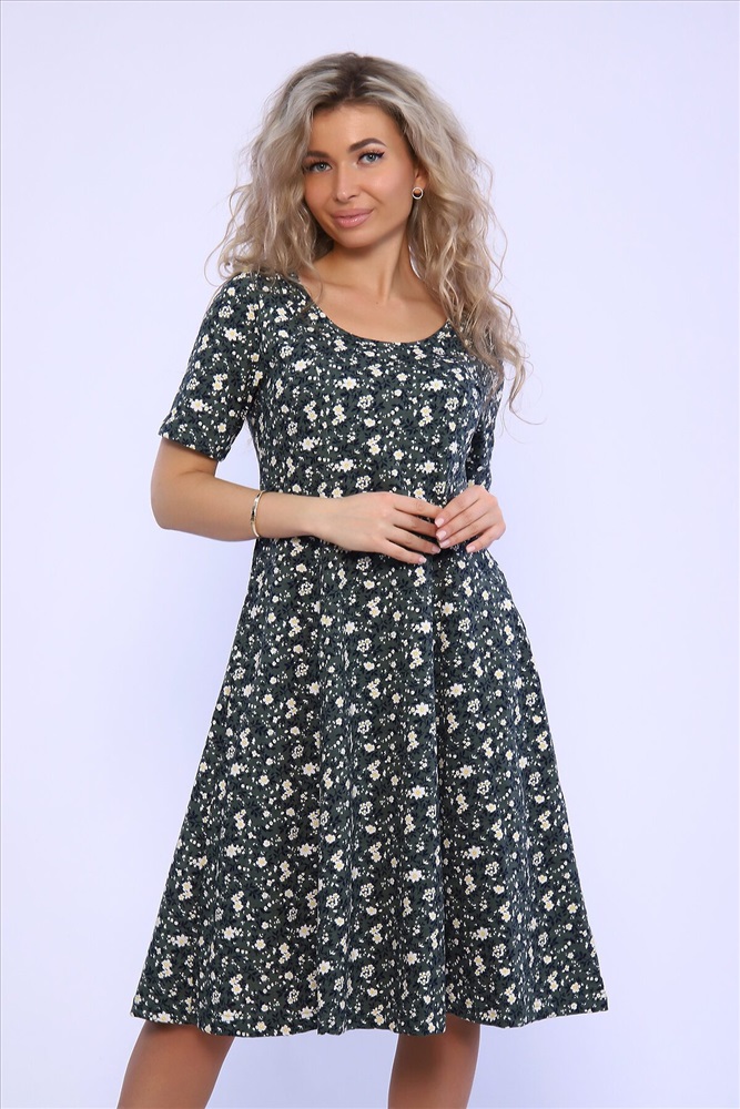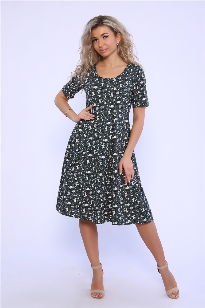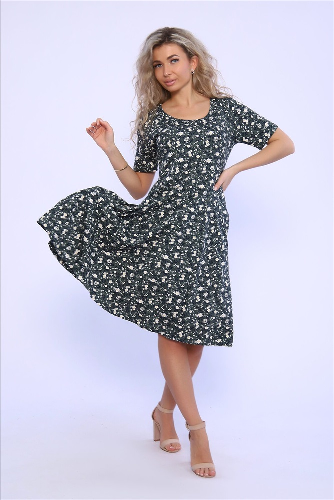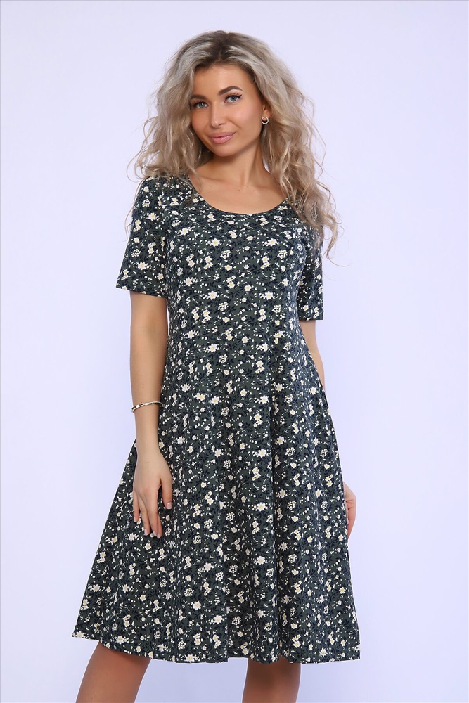 ID товара: 979100 Состав: 100% Хлопок Сезон: Весна/Лето Длина: Ниже колена Фасон: Расклешенное Рукав: короткие Вырез горловины: Округлый Рисунок: цветочный Декоративные элементы: Принт Основная ткань: Хлопок Стиль: классический Вид ткани: Кулирка Страна бренда: Россия Страна производства: Россия Платье полуприлегающего силуэта, приталенное с расклешенной юбкой. Полочка и спинка с рельефами. Карманы в боковых швах. Короткие рукава. Идеально для повседневной носки. Комментарии к товару
