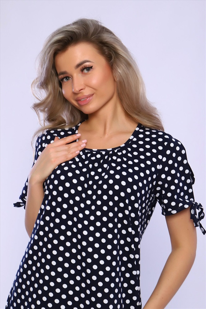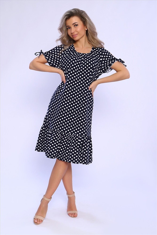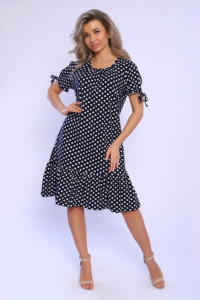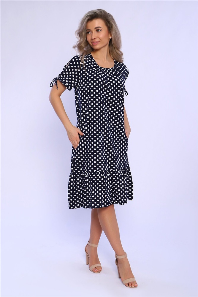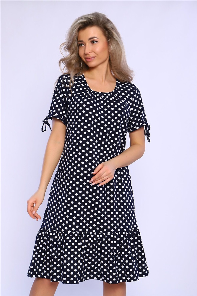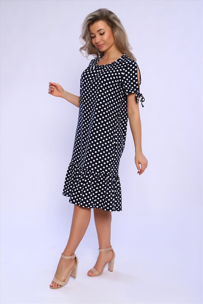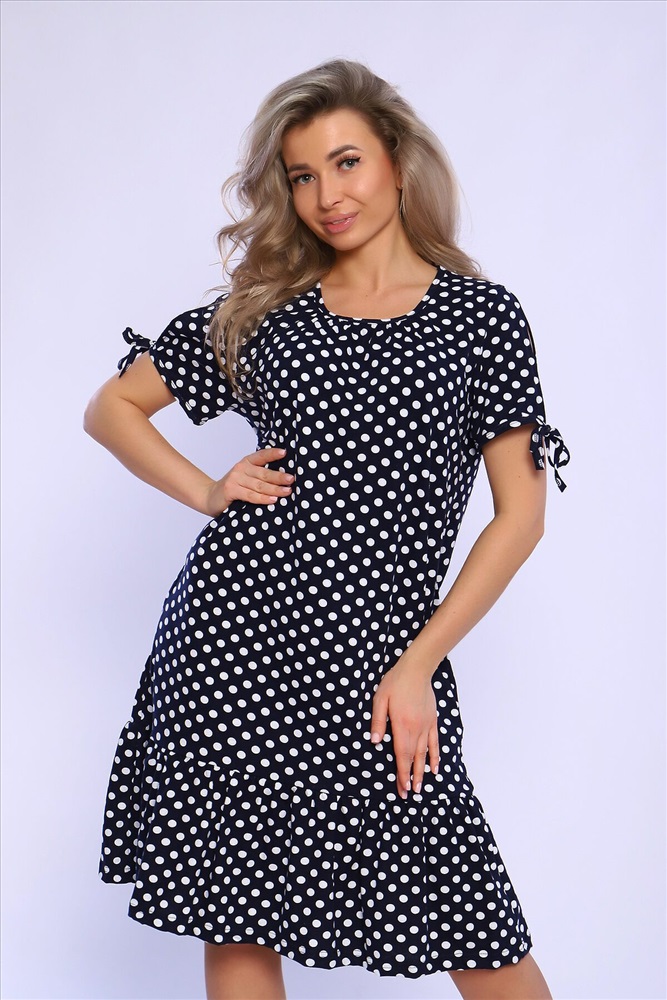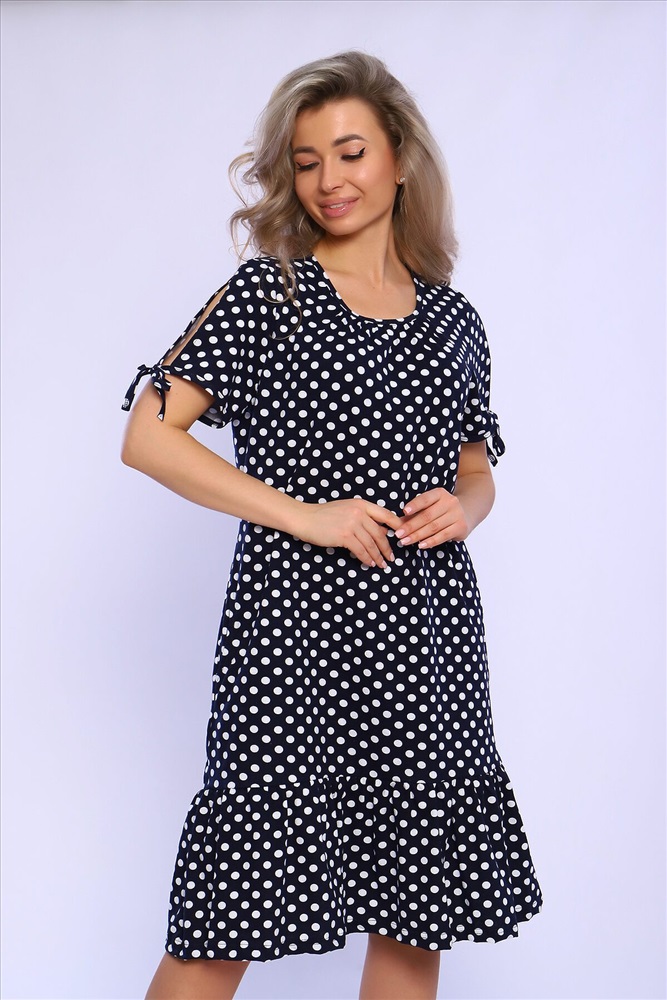 Страна производства: Россия Платье свободного кроя со сборкой по центру выреза и воланами на сборке по низу изделия. Рукава короткие с разрезами и на завязках. Комфортно для повседневной носки.