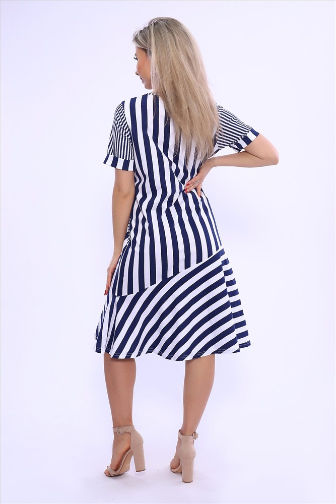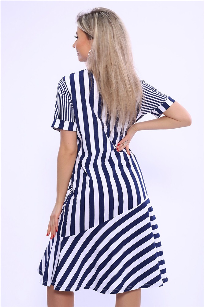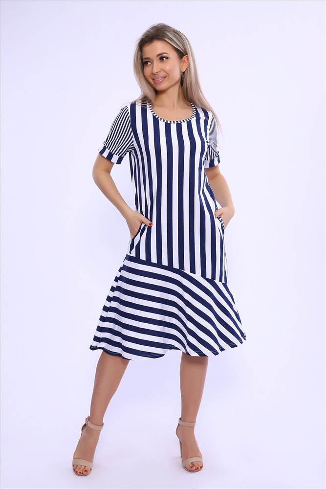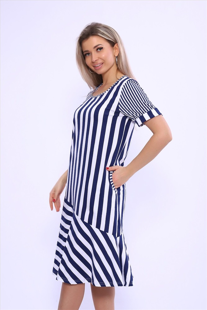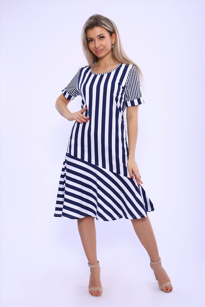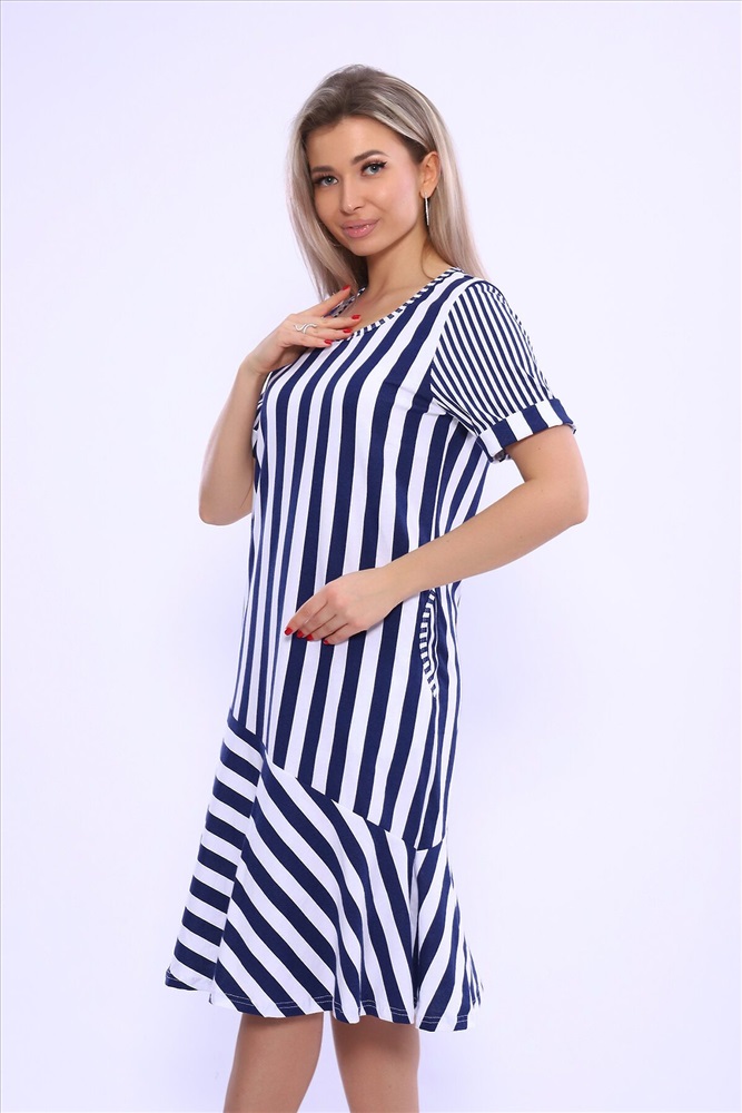 ID товара: 987010 Состав: 100% Хлопок Сезон: Весна/Лето Длина: Ниже колена Фасон: А-силуэт Рукав: короткие Вырез горловины: Округлый Рисунок: Полоски Декоративные элементы: Принт Основная ткань: Хлопок Стиль: повседневный Вид ткани: Кулирка Страна бренда: Россия Страна производства: Россия Платье полуприлегающего силуэта с короткими рукавами и карманами в боковых швах. Рукава с отворотными манжетами. По низу изделия ассиметричные воланы. Комментарии к товару