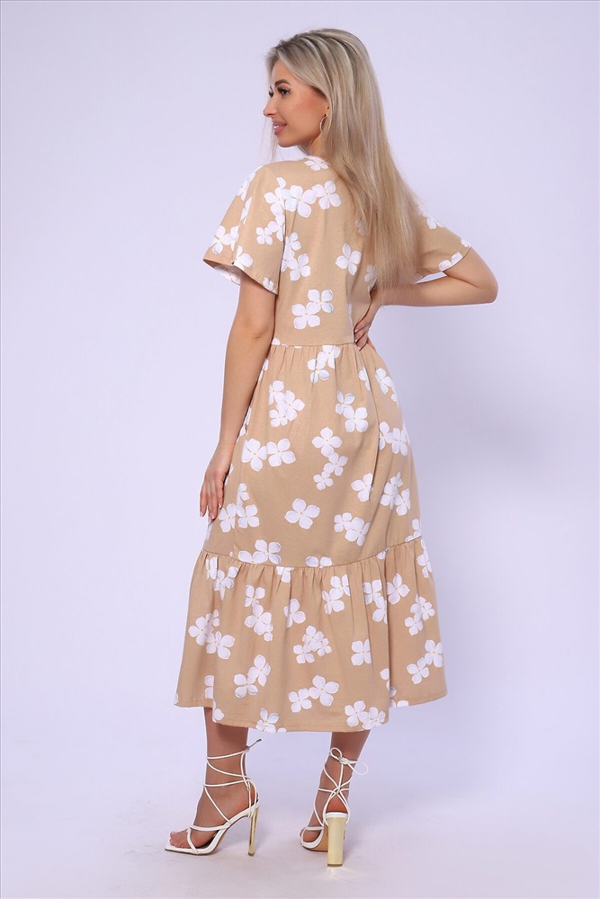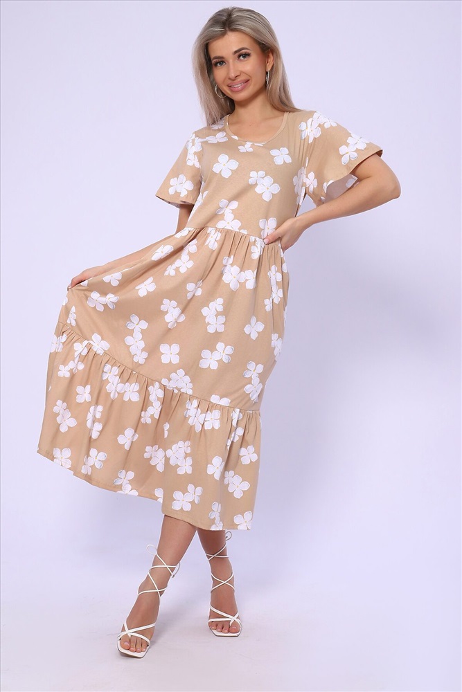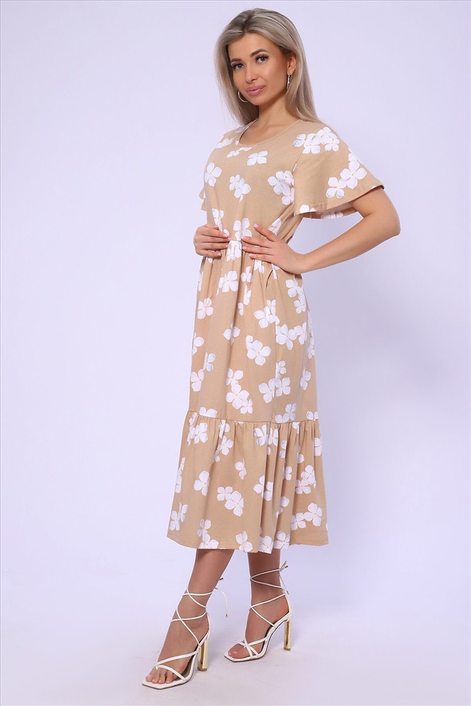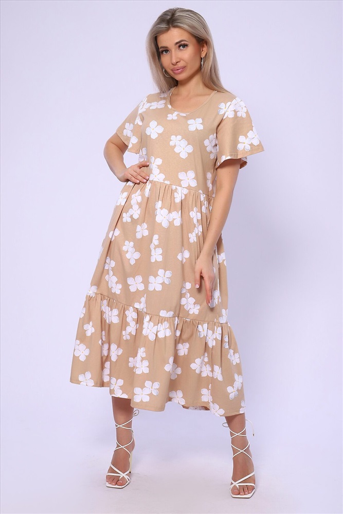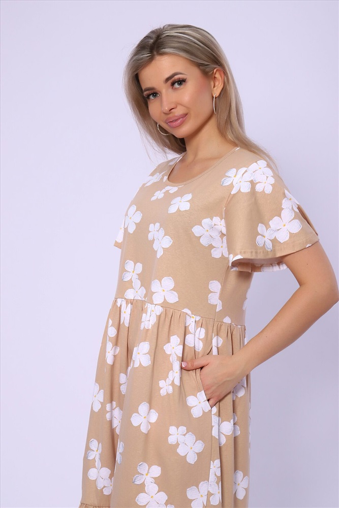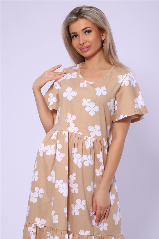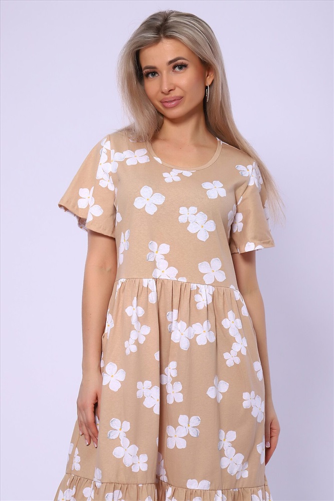 ID товара: 989541 Состав: 100% Хлопок Сезон: Весна/Лето Длина: Миди Фасон: Свободный Рукав: короткие Вырез горловины: Округлый Рисунок: цветочный Тип карманов: В шве Декоративные элементы: Принт Основная ткань: Хлопок Стиль: повседневный Вид ткани: Кулирка Страна бренда: Россия Страна производства: Россия Платье свободного кроя с короткими рукавами - крылышками. Юбка двухъярусная на сборке. Карманы в боковых швах. Комментарии к товару