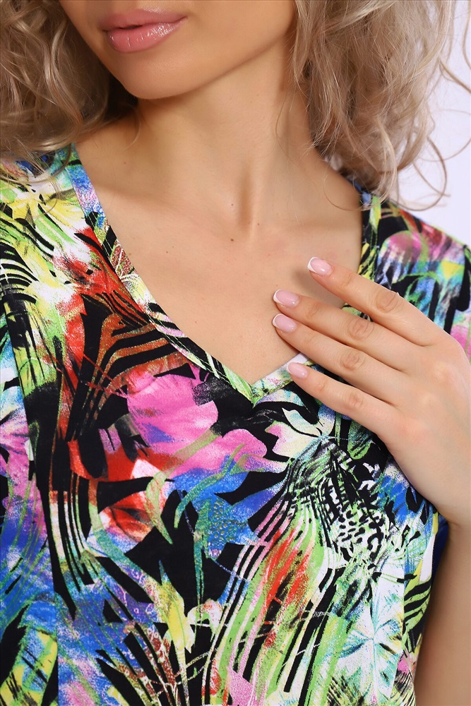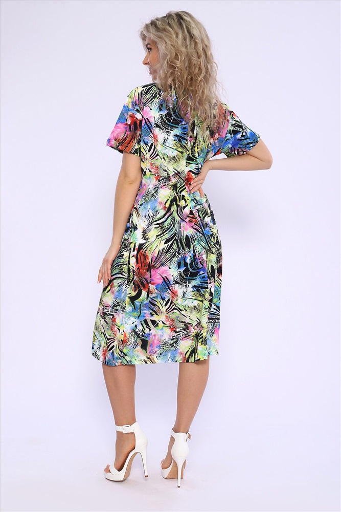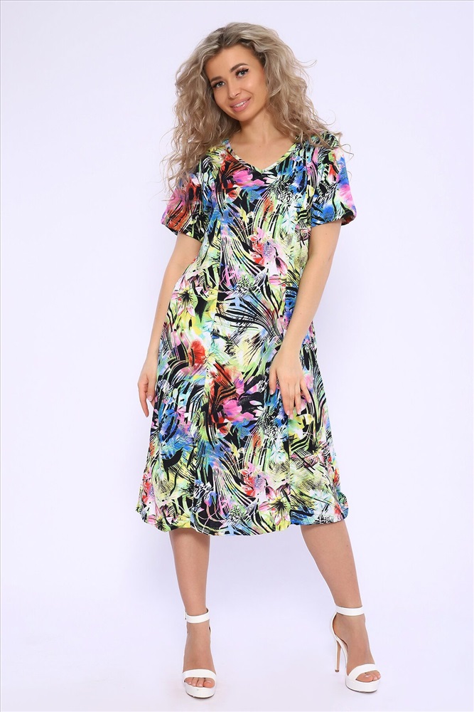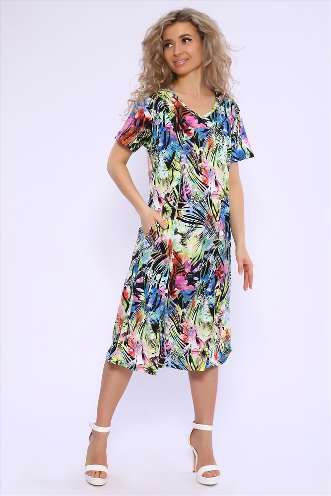 ID товара: 999797 Состав: 100% Хлопок Сезон: Весна/Лето Фасон: Полуприталенный Рукав: Короткий Вырез горловины: V-образный Рисунок: Фантазийный Тип карманов: Втачные Вид ткани: Кулирка Страна бренда: Россия Страна производства: Россия Платье с v - образным вырезом горловины, немного приталенное, к низу расклешенное. Карманы в боковых швах. Комментарии к товару