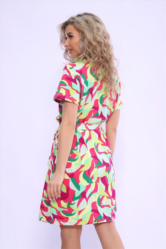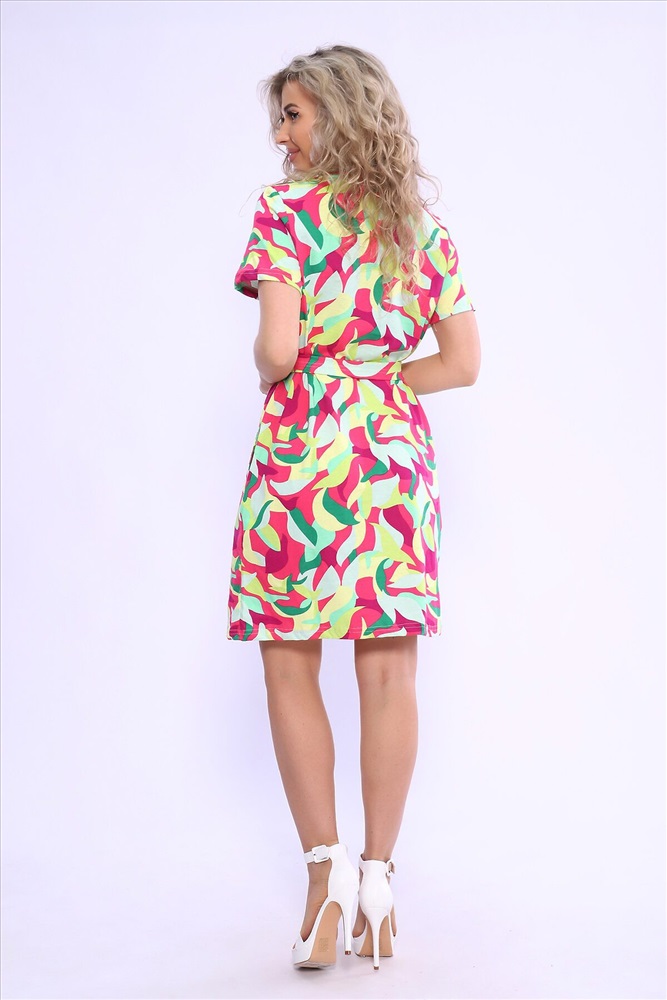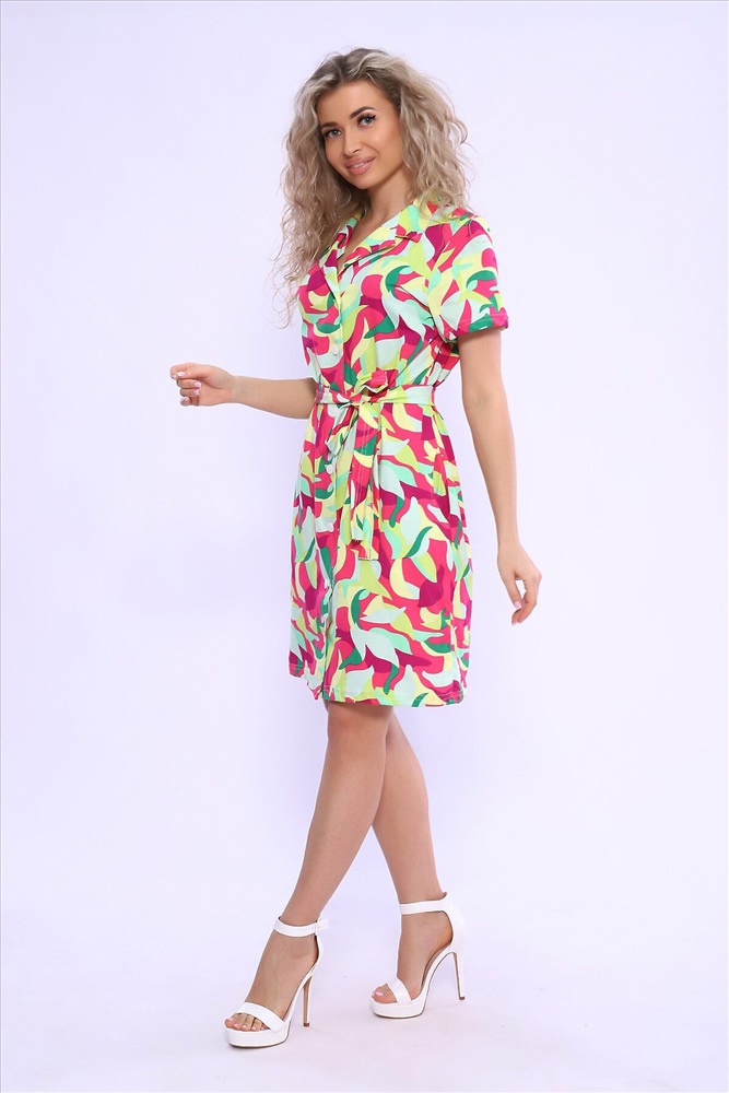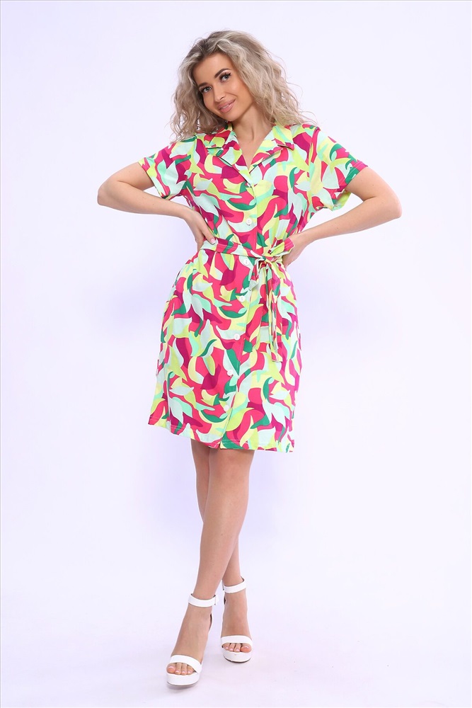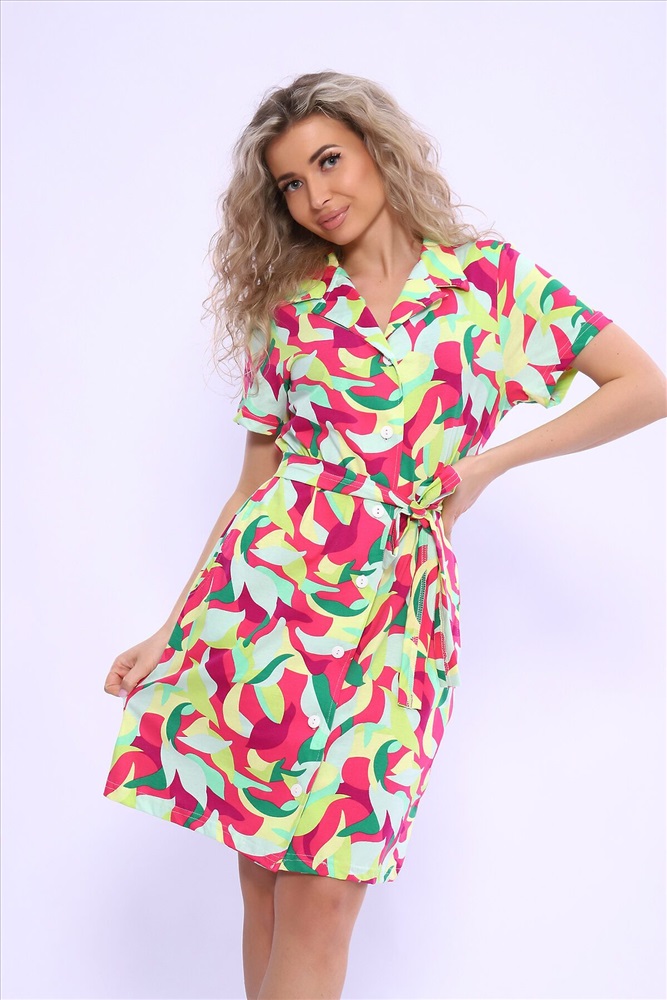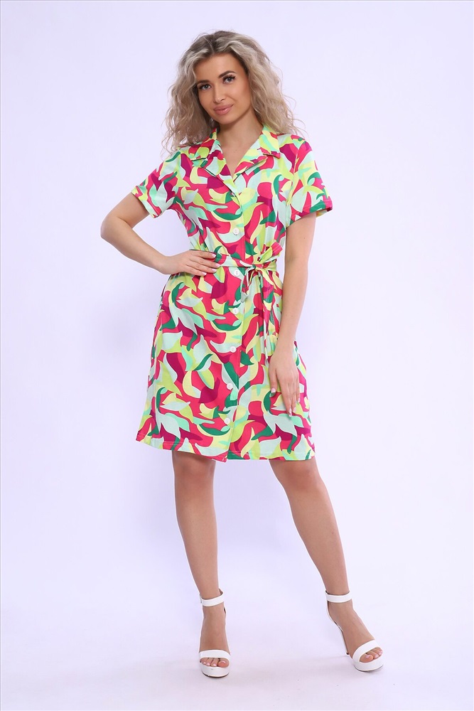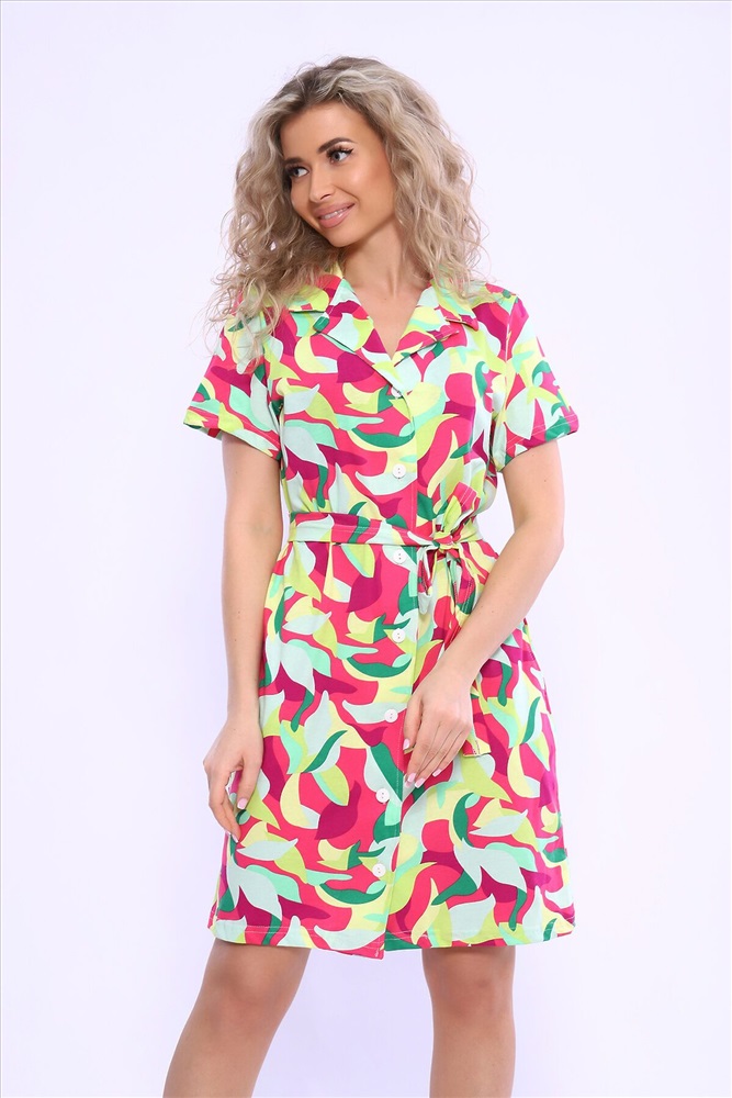 ID товара: 1003563 Состав: 100% Хлопок Сезон: Весна/Лето Фасон: Приталенный Рукав: Короткие Вырез горловины: Отложной воротник Рисунок: Фантазийный Вид ткани: Кулирка Страна бренда: Россия Страна производства: Россия Платье на пуговицах с английским воротником и короткими рукавами. В боковых швах удобные карманы. Комментарии к товару