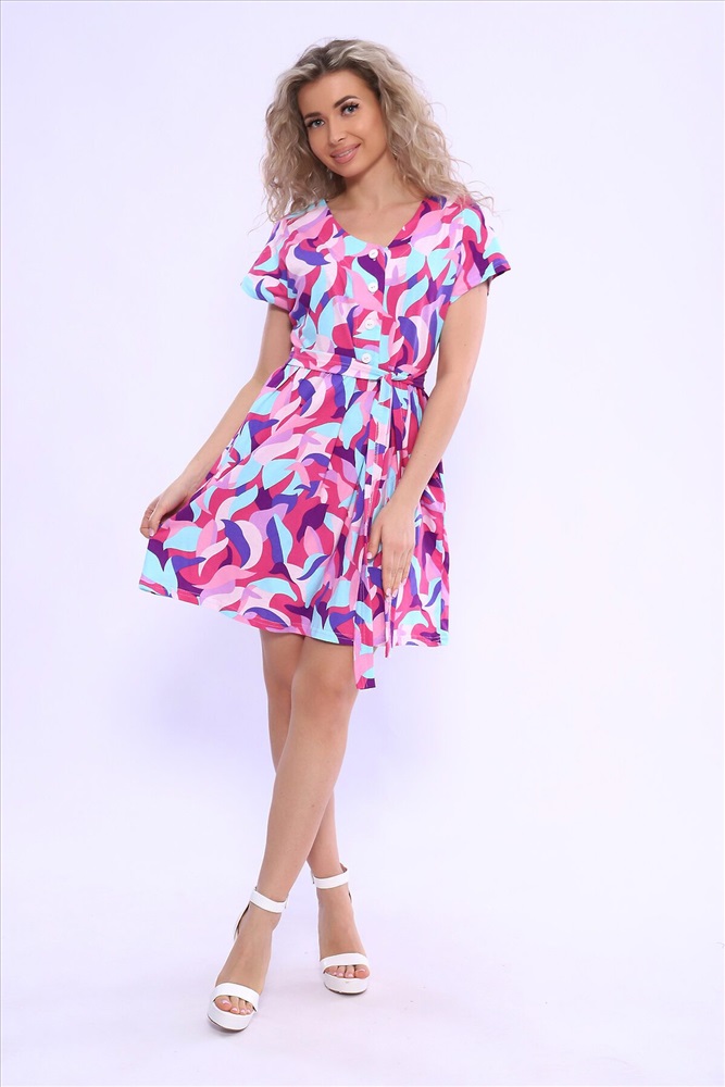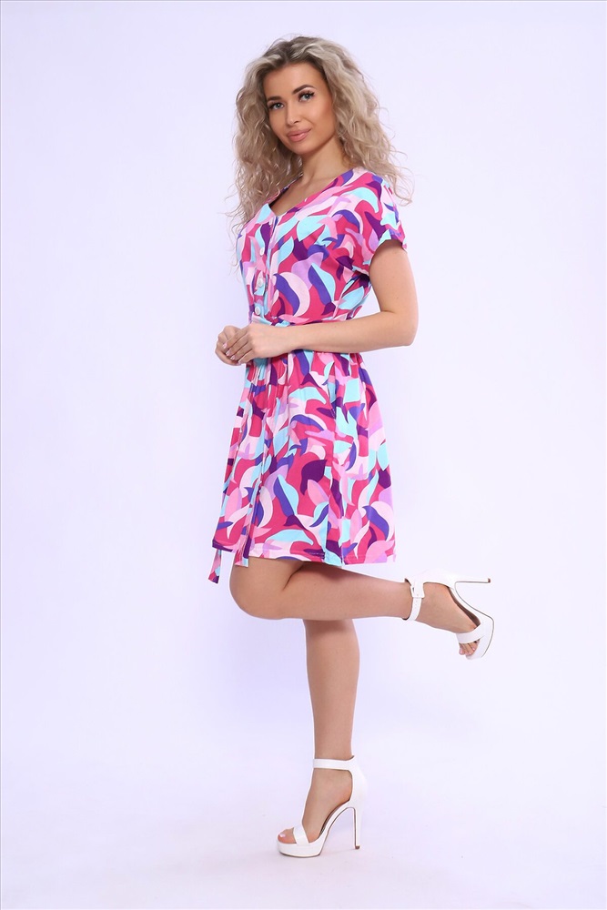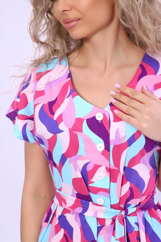 ID товара: 1003561 Состав: 100% Хлопок Сезон: Весна/Лето Фасон: Свободный крой Рукав: Короткие Вид застежки: Пуговицы Вырез горловины: Отложной воротник Рисунок: Фантазийный Вид ткани: Кулирка Страна бренда: Россия Страна производства: Россия Платье свободного кроя с юбкой на сборке. Полочка на пуговицах. Идеально для повседневной носки. Комментарии к товару