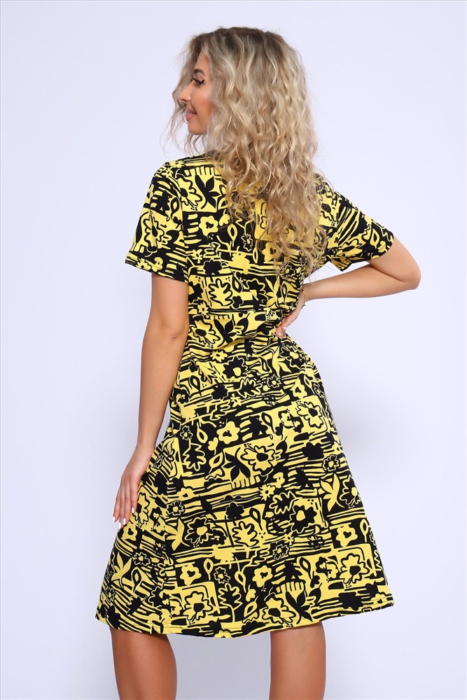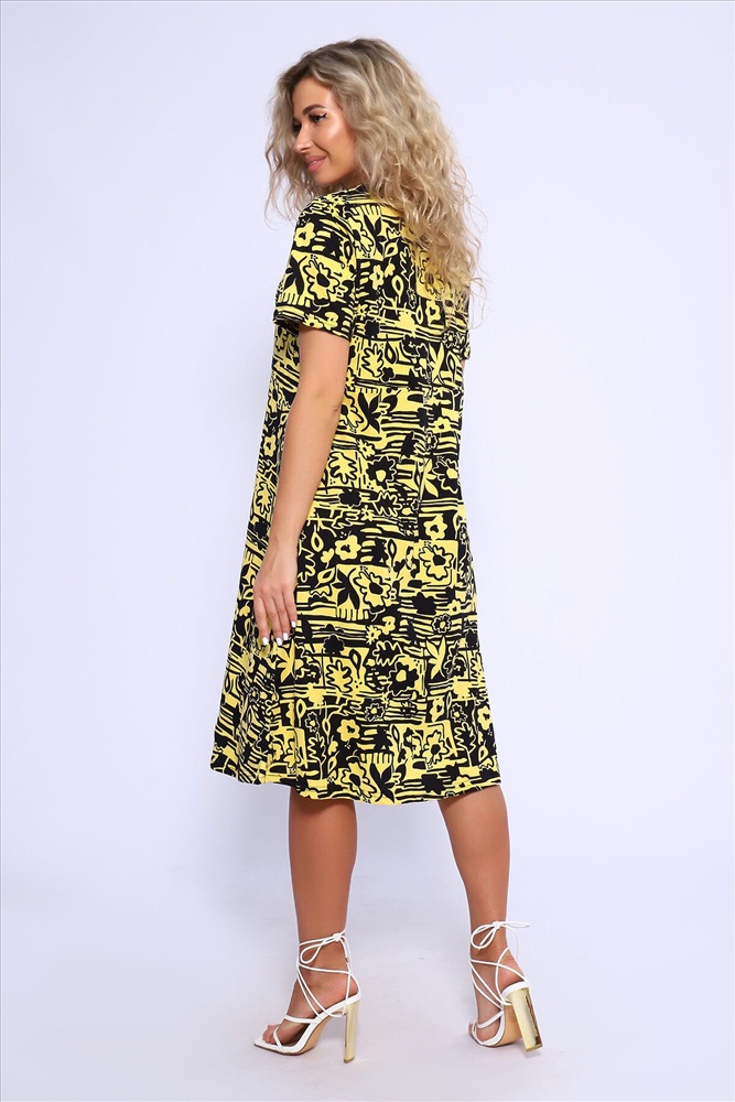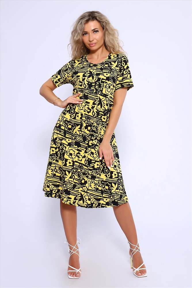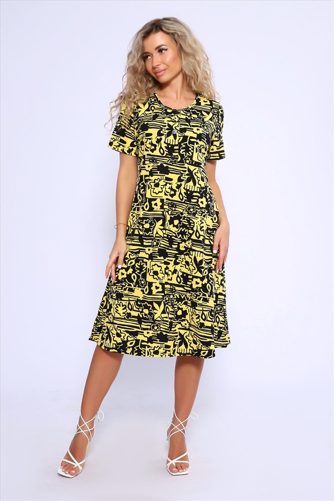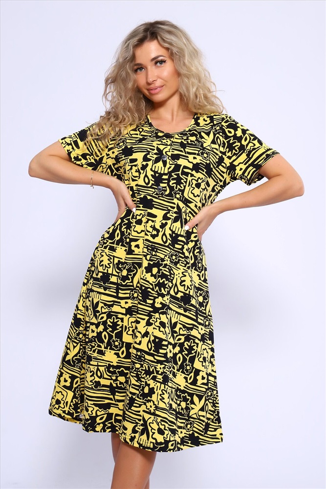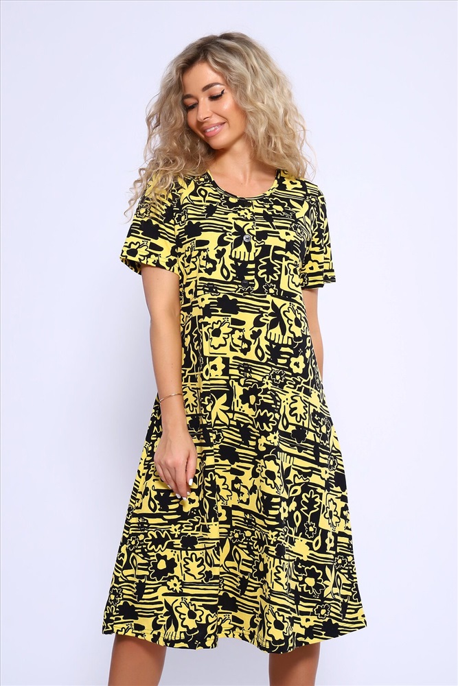 ID товара: 1021935 Состав: 100% Хлопок Сезон: Весна/Лето Фасон: Полуприлегающий Рукав: Короткий Вид застежки: Пуговицы Вырез горловины: Круглый Рисунок: Фантазийный Вид ткани: Кулирка Страна бренда: Россия Страна производства: Россия Платье полуприлегающего силуэта с короткими рукавами, отрезное по линии талии, нижняя часть изделия свободная, расклешенная. Полочка с имитацией застежки на пуговицы. Комментарии к товару