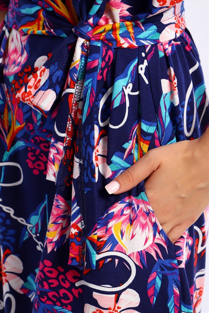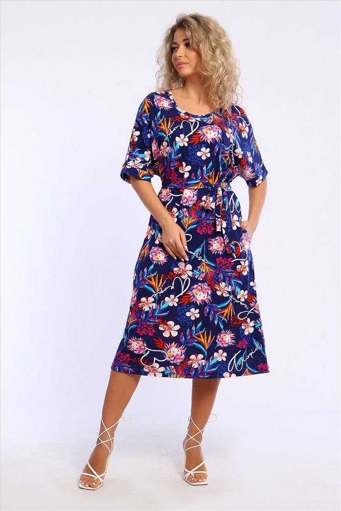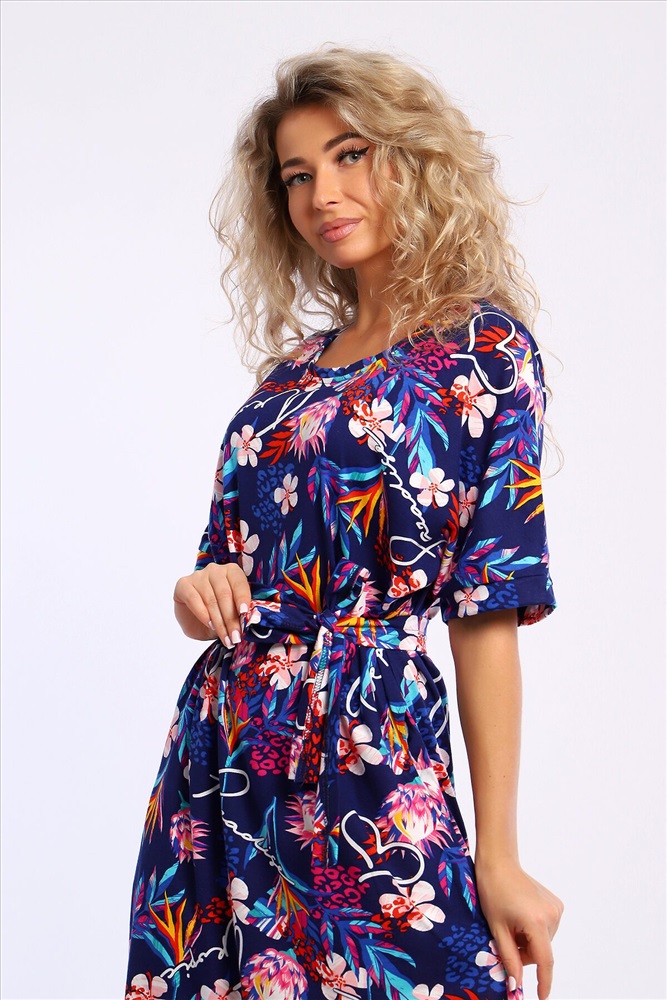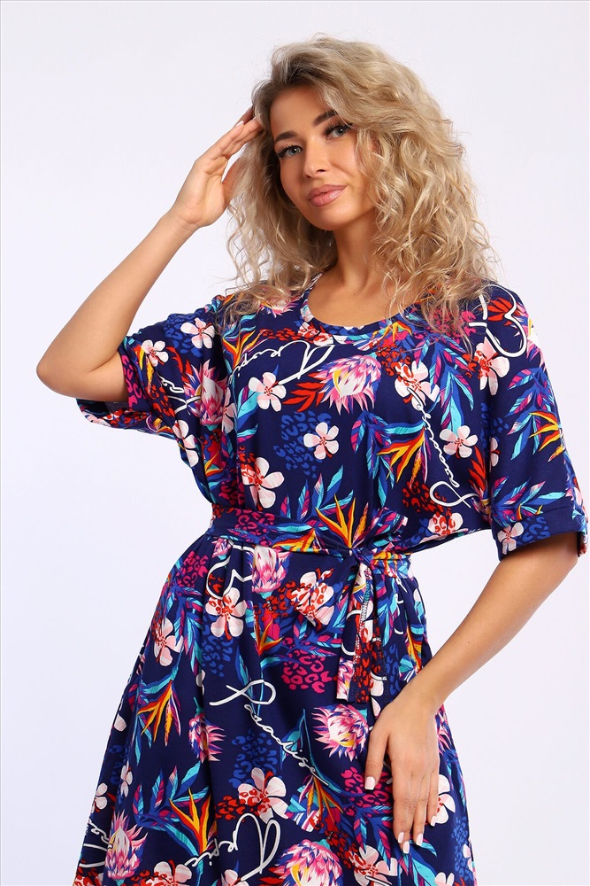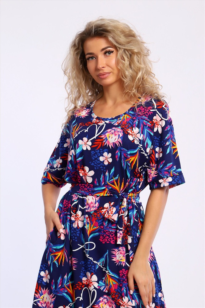 Страна производства: Россия Платье свободного кроя с короткими цельнокроеным рукавами на манжетах. В боковых швах удобные карманы.