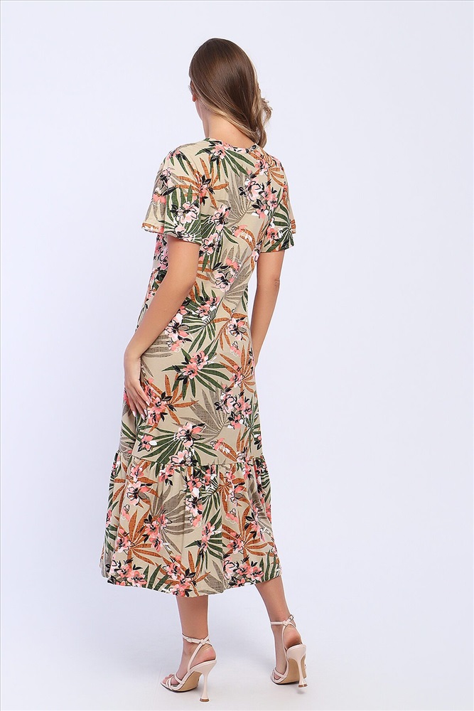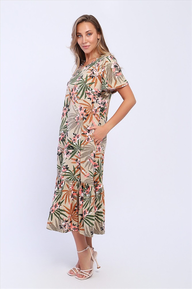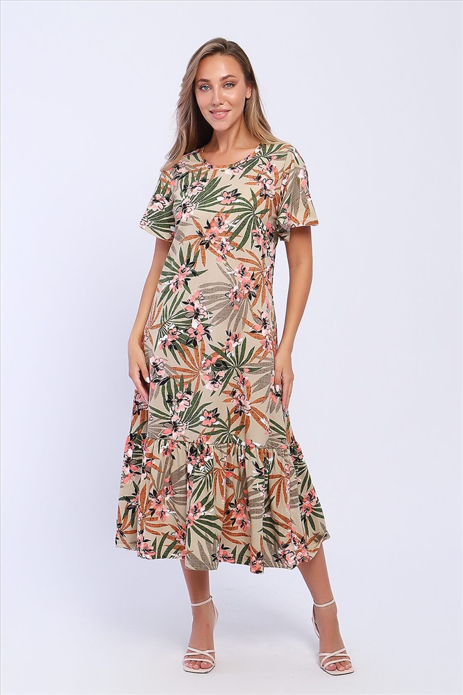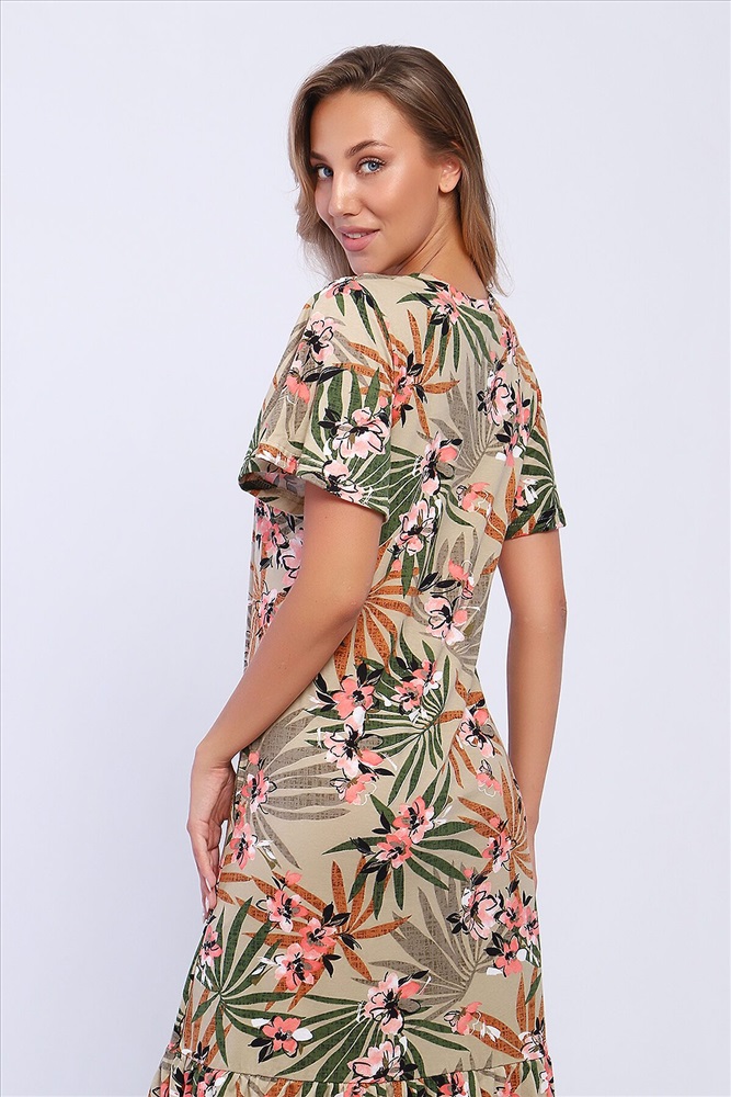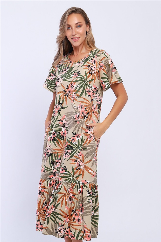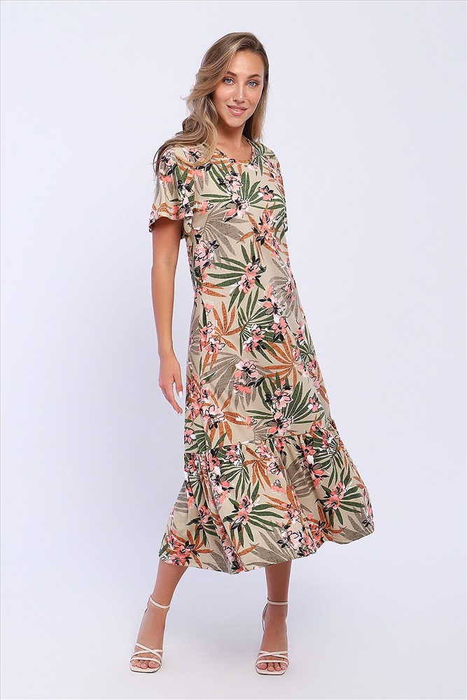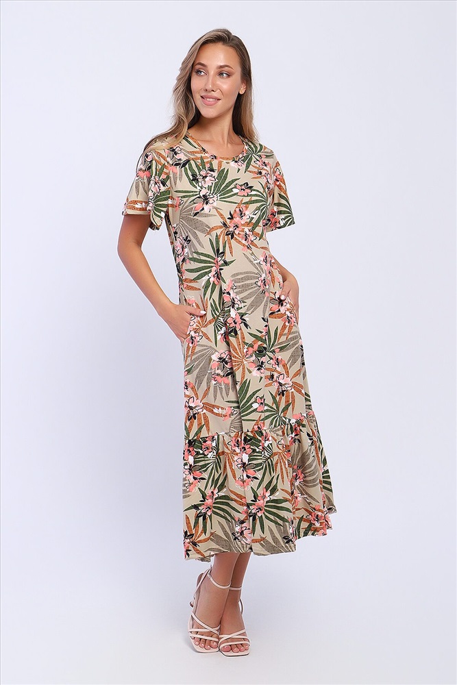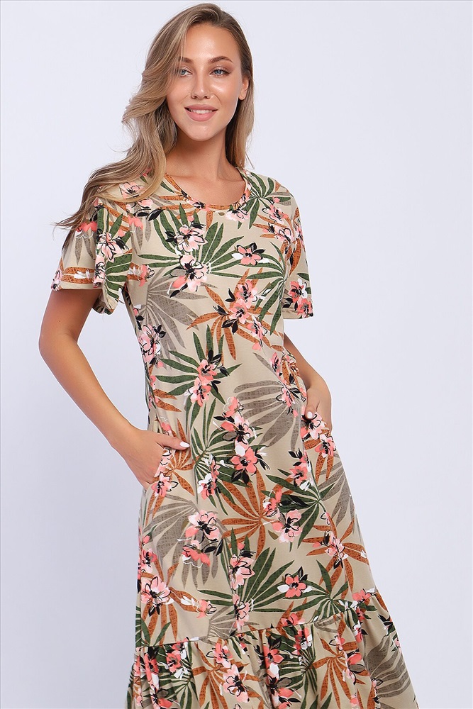 Страна производства: Россия Платье свободного кроя с короткими рукавами - крылышками. По низу изделия волан на сборке. Карманы в боковых швах.