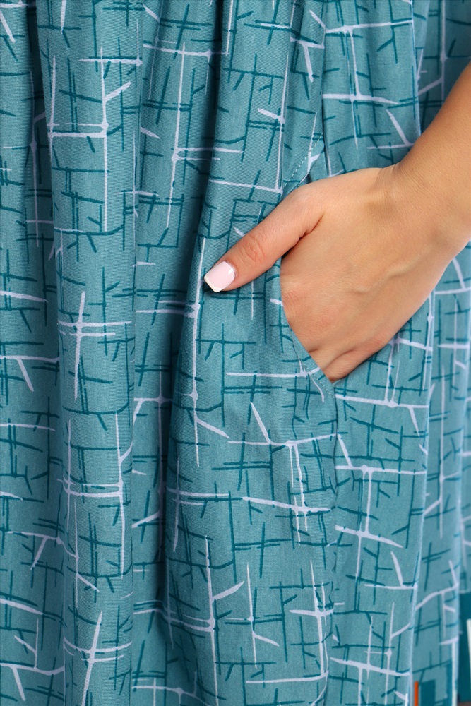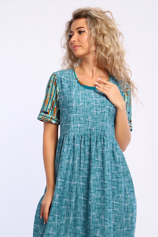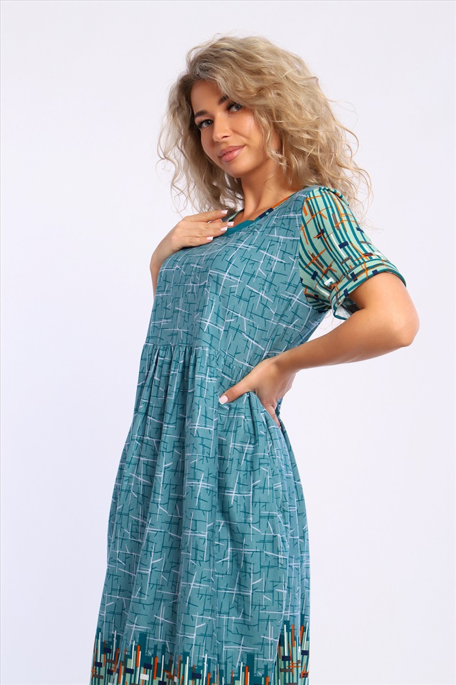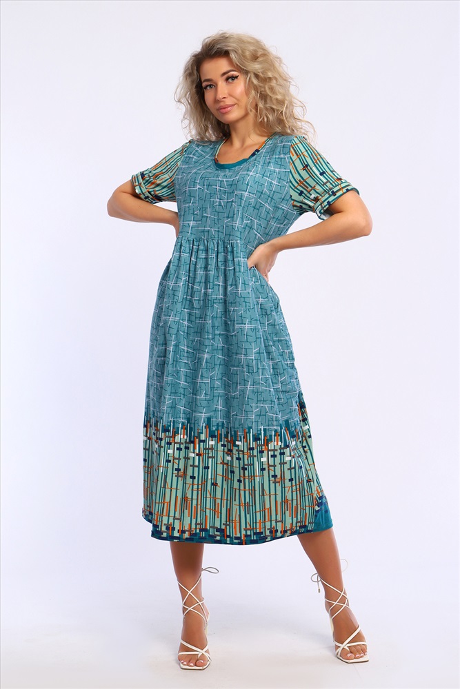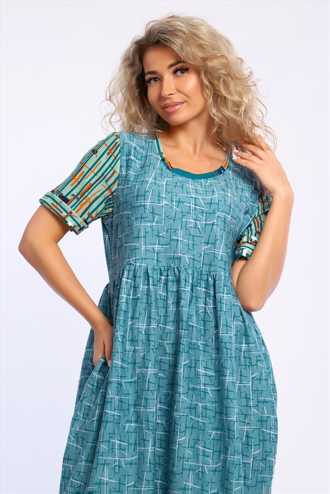 Застежка: без застежки Платье с юбкой на сборке и короткими рукавами. В боковых швах удобные карманы.