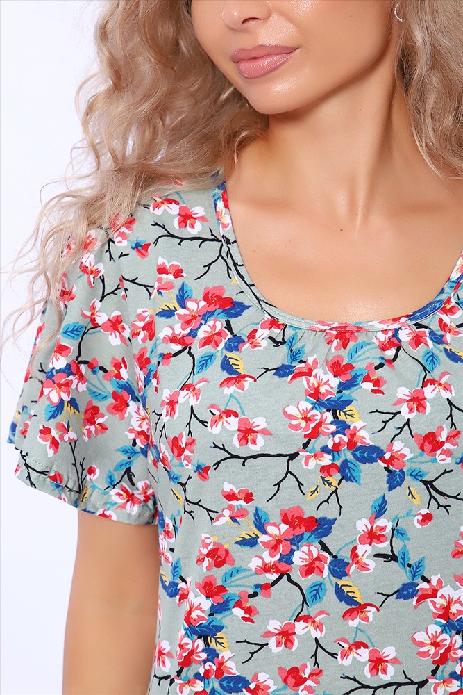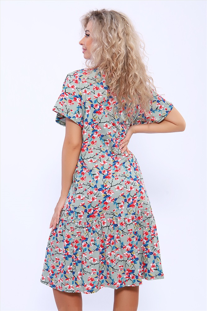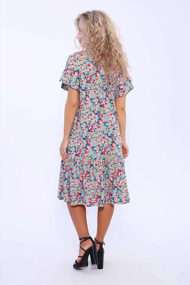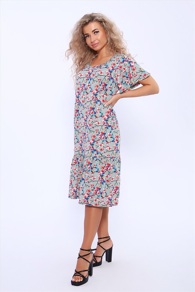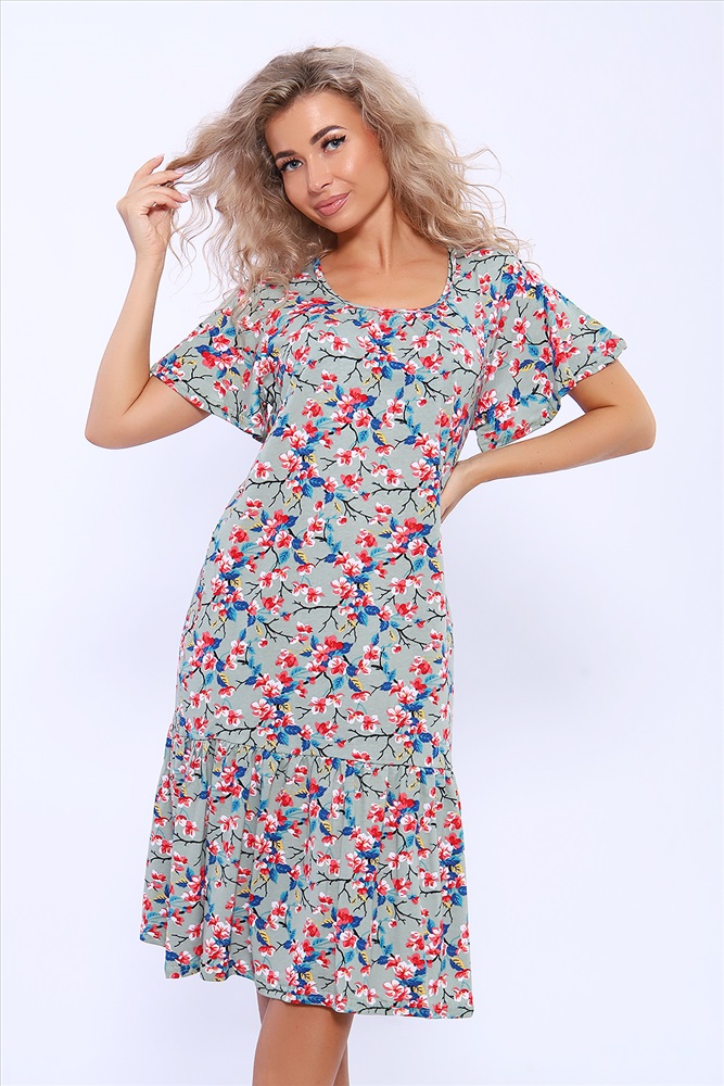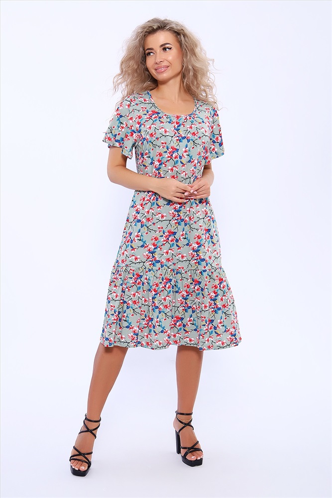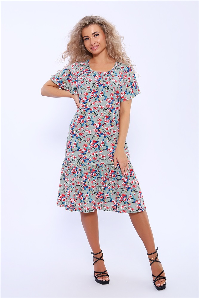 Застежка: без застежки Платье полуприлегающего силуэта с короткими расклешенными рукавами. По центру горловины сборка. В боковых швах удобные карманы. По низу изделия волан на сборке.