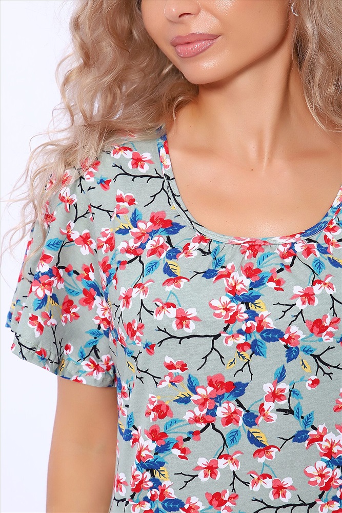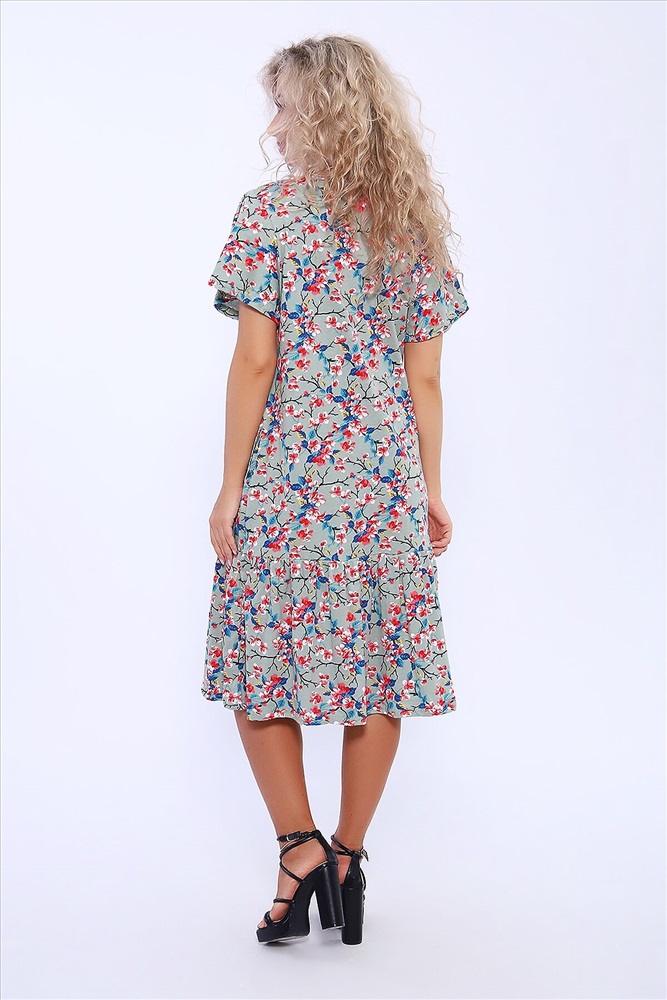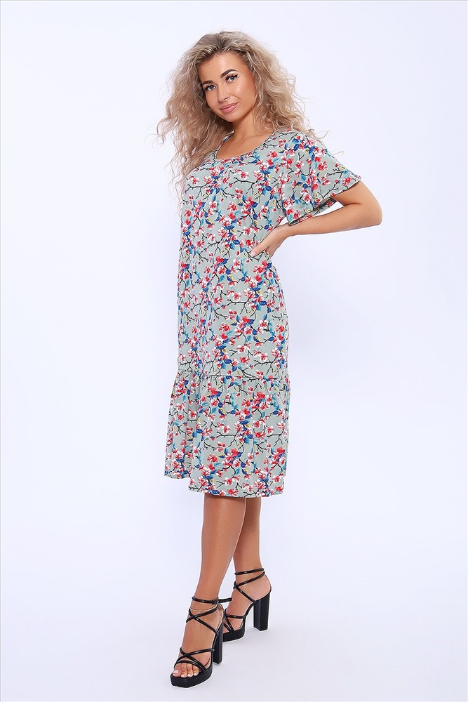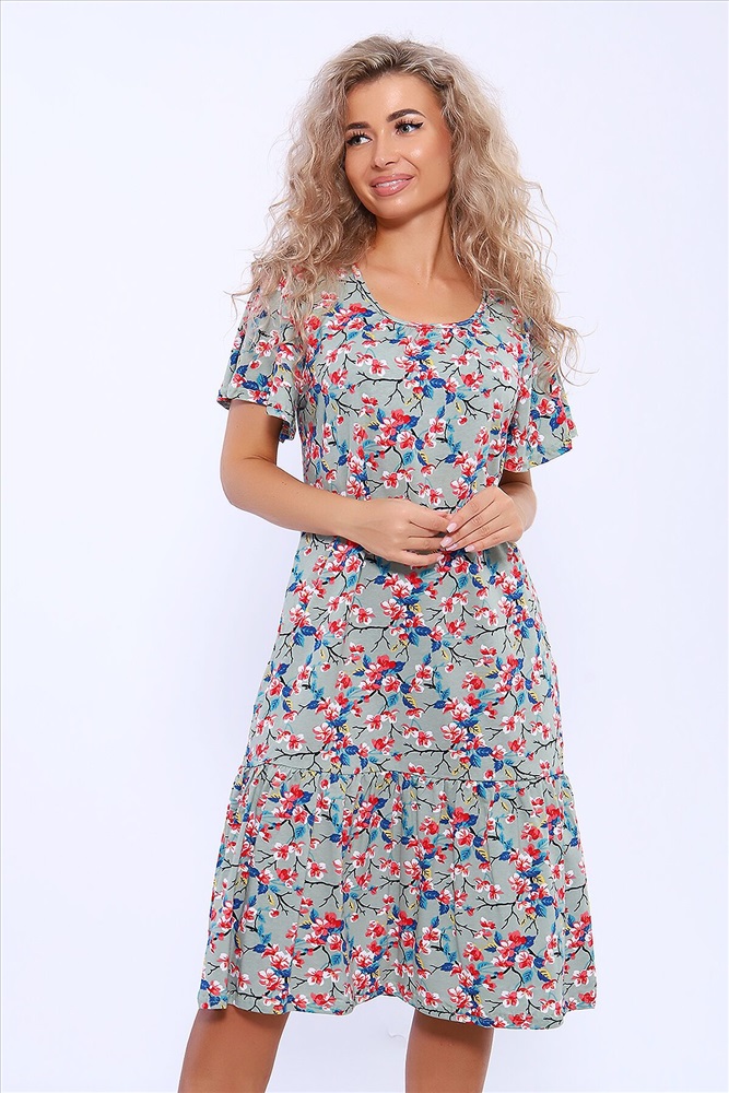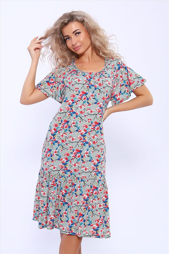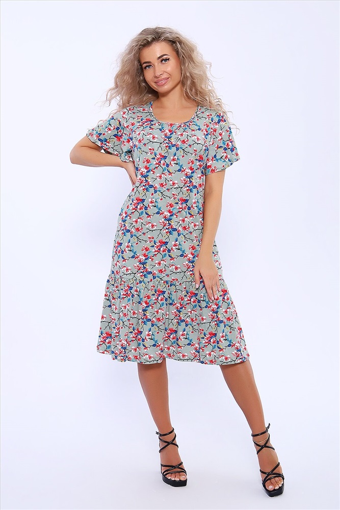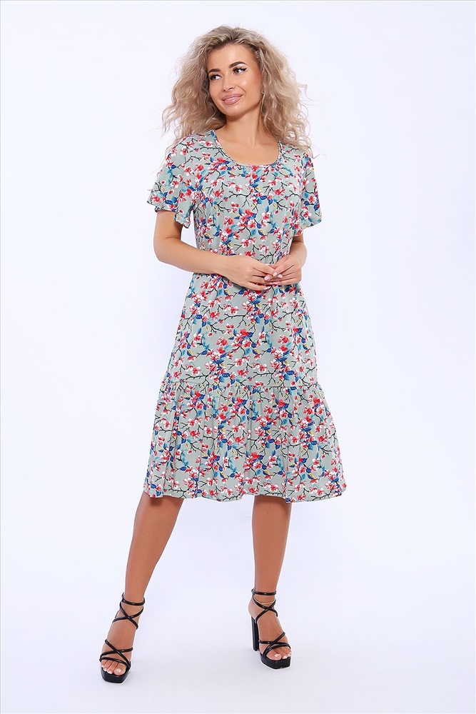Страна производства: Россия Платье полуприлегающего силуэта с короткими расклешенными рукавами. По центру горловины сборка. В боковых швах удобные карманы. По низу изделия волан на сборке.
