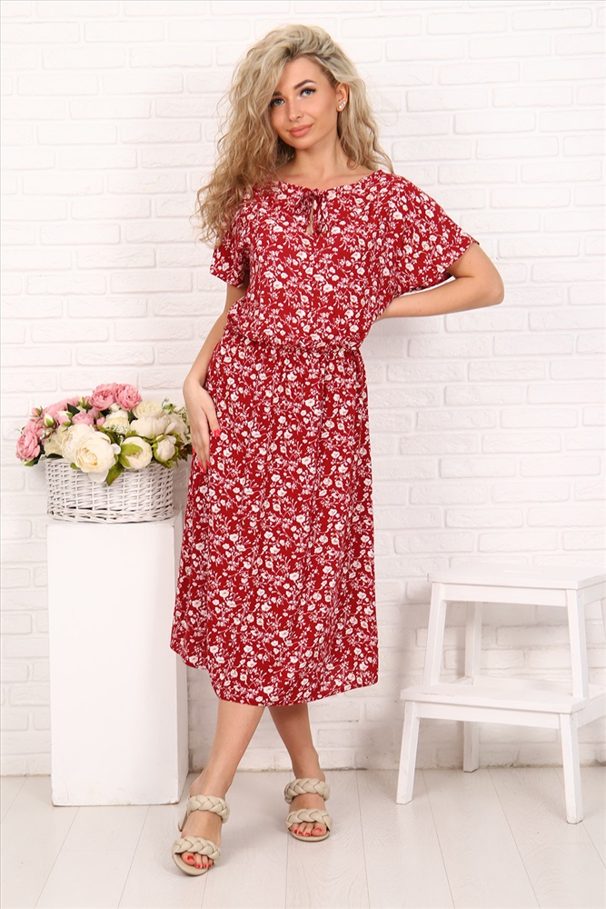 Застежка: без застежки Женское платье из легкого штапельного полотна, плинтованного рисунком в мелкий цветочек. Модель длиной миди, отрезная по линии талии, с напускным верхом и коротким цельнокроеным рукавом. В поясе мягкая резинка. На округлой горловине небольшой вертикальный разрез на завязках, идеальный вариант для комфортного женственного образа на каждый день. Универсальное платье больших размеров подойдет полным девушкам и солидным леди на любой случай - это и деловое платье для офиса, и повседневное платье для прогулок, и вечернее платье для торжественного мероприятия, и нарядное платье на выход, и легкое осеннее платье под куртку.