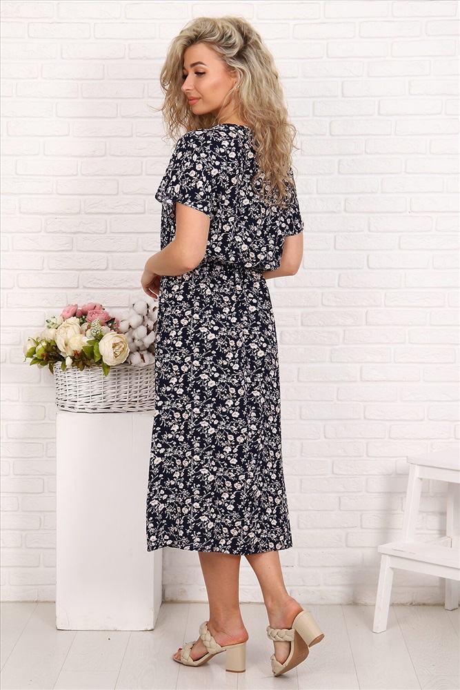 Женское платье из легкого штапельного полотна, плинтованного рисунком в мелкий цветочек. Модель длиной миди, отрезная по линии талии, с напускным верхом и коротким цельнокроеным рукавом. В поясе мягкая резинка. На округлой горловине небольшой вертикальный разрез на завязках, идеальный вариант для комфортного женственного образа на каждый день. Универсальное платье больших размеров подойдет полным девушкам и солидным леди на любой случай - это и деловое платье для офиса, и повседневное платье для прогулок, и вечернее платье для торжественного мероприятия, и нарядное платье на выход, и легкое осеннее платье под куртку.
