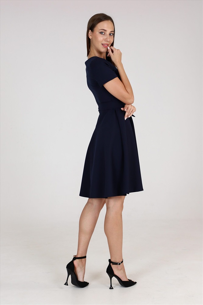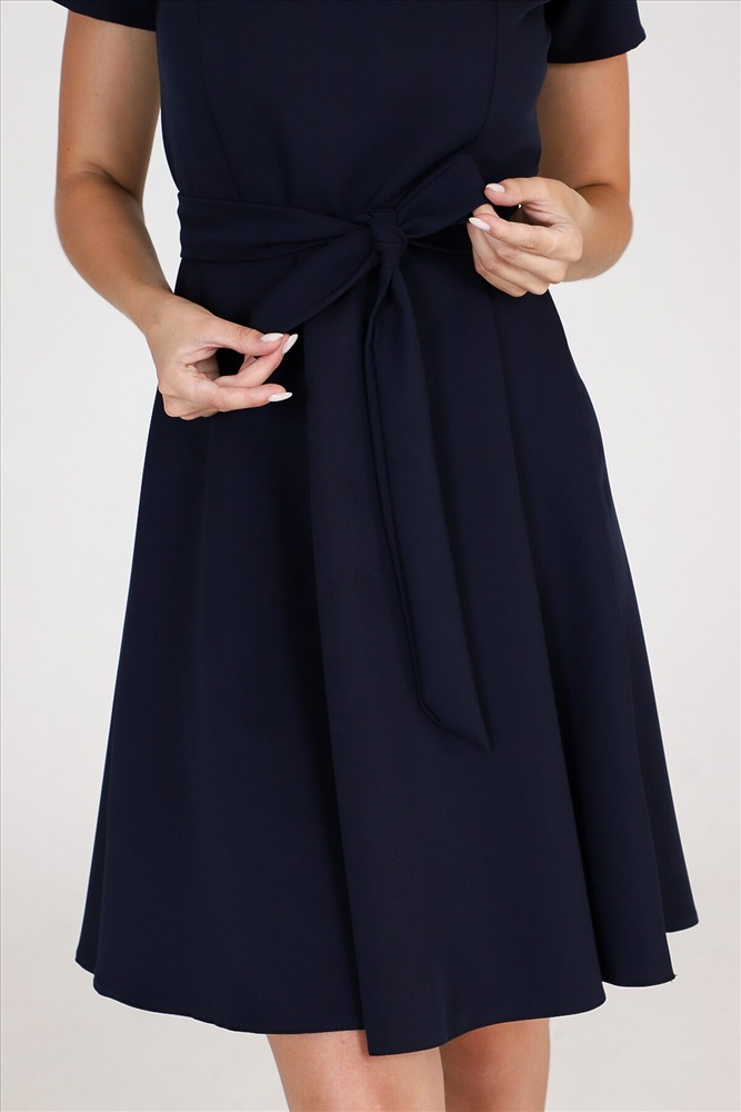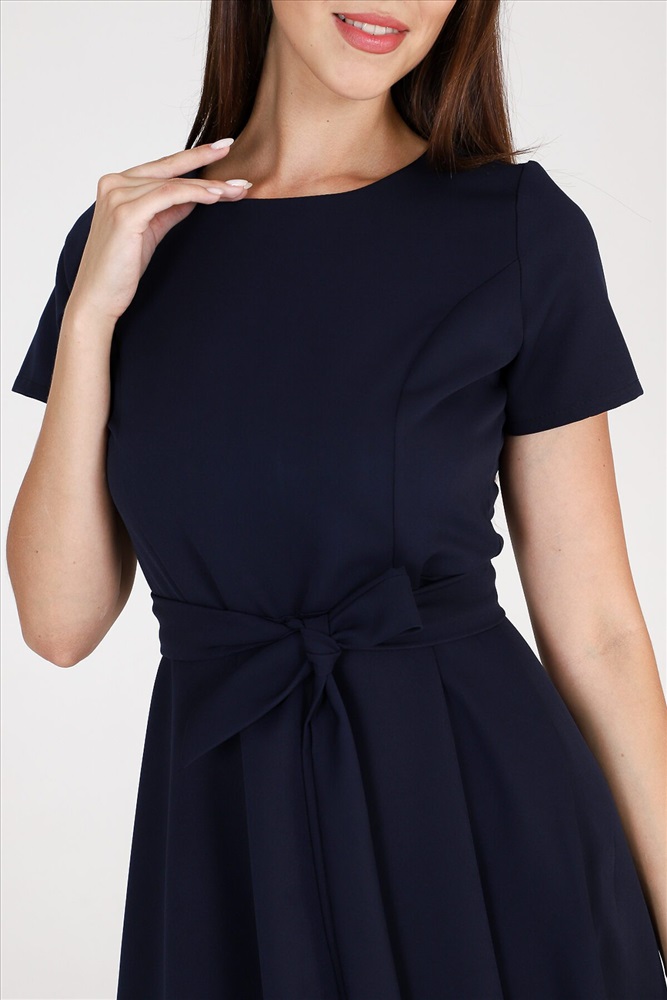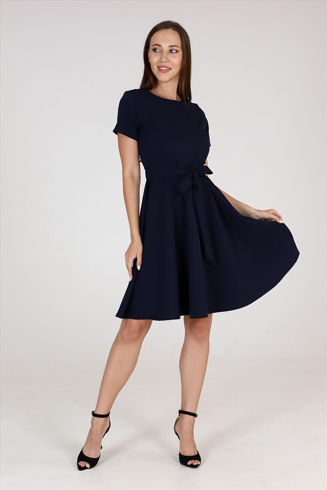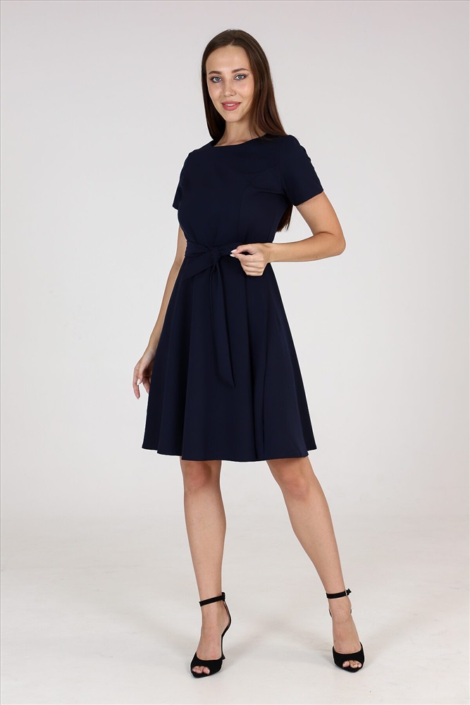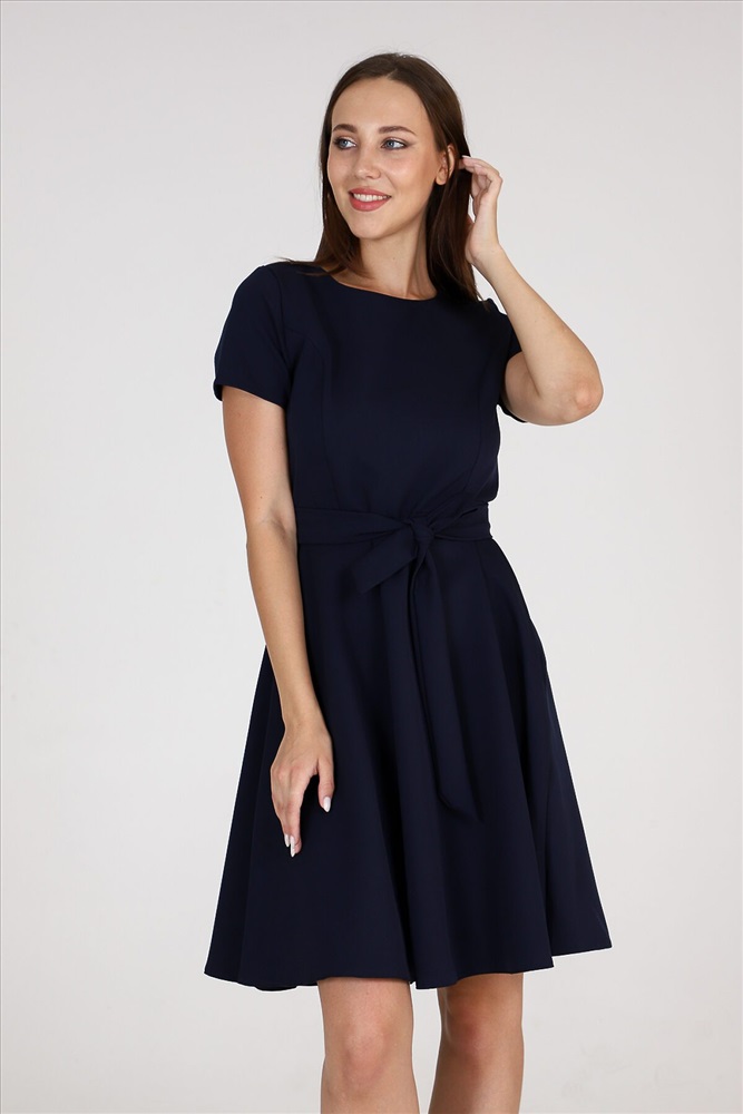 Страна производства: Россия Платье приталенного силуэта с широкой юбкой, отрезное по талии с тканевым поясом, эффектно подчеркивает линию талии. Округлый вырез горловины. Короткий рукав. Идеальный выбор для стильного гардероба. Прекрасно подойдет для работы в офисе и для романтической встречи