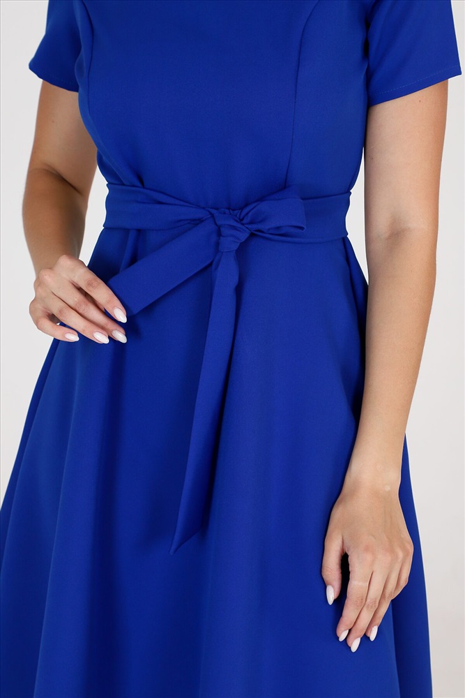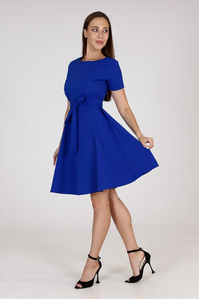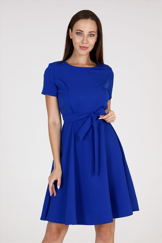 Страна производства: Россия Платье приталенного силуэта с широкой юбкой, отрезное по талии с тканевым поясом, эффектно подчеркивает линию талии. Округлый вырез горловины. Короткий рукав. Идеальный выбор для стильного гардероба. Прекрасно подойдет для работы в офисе и для романтической встречи