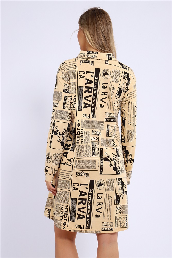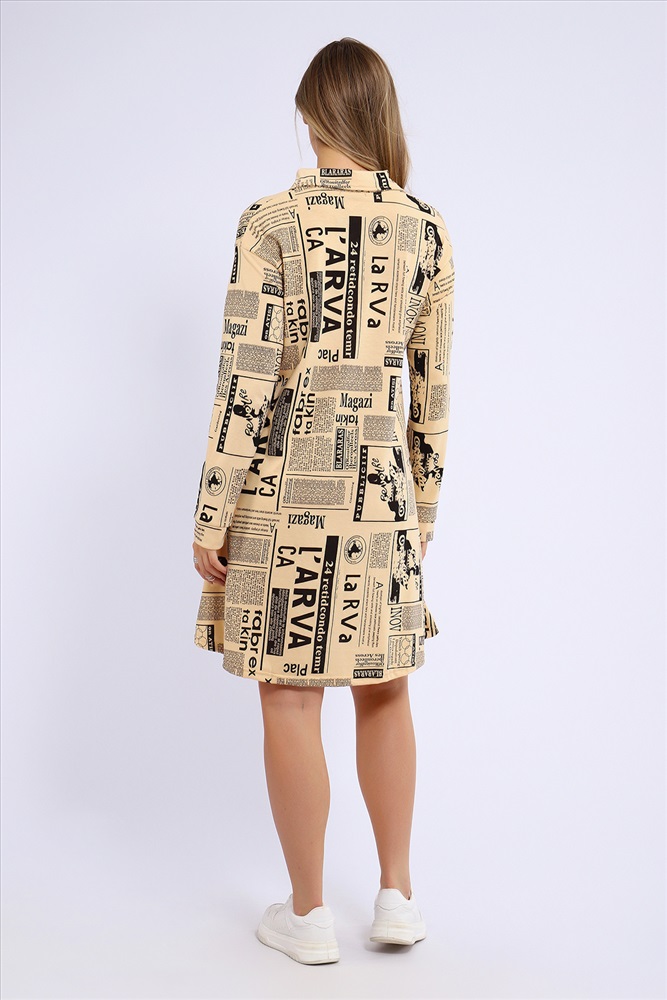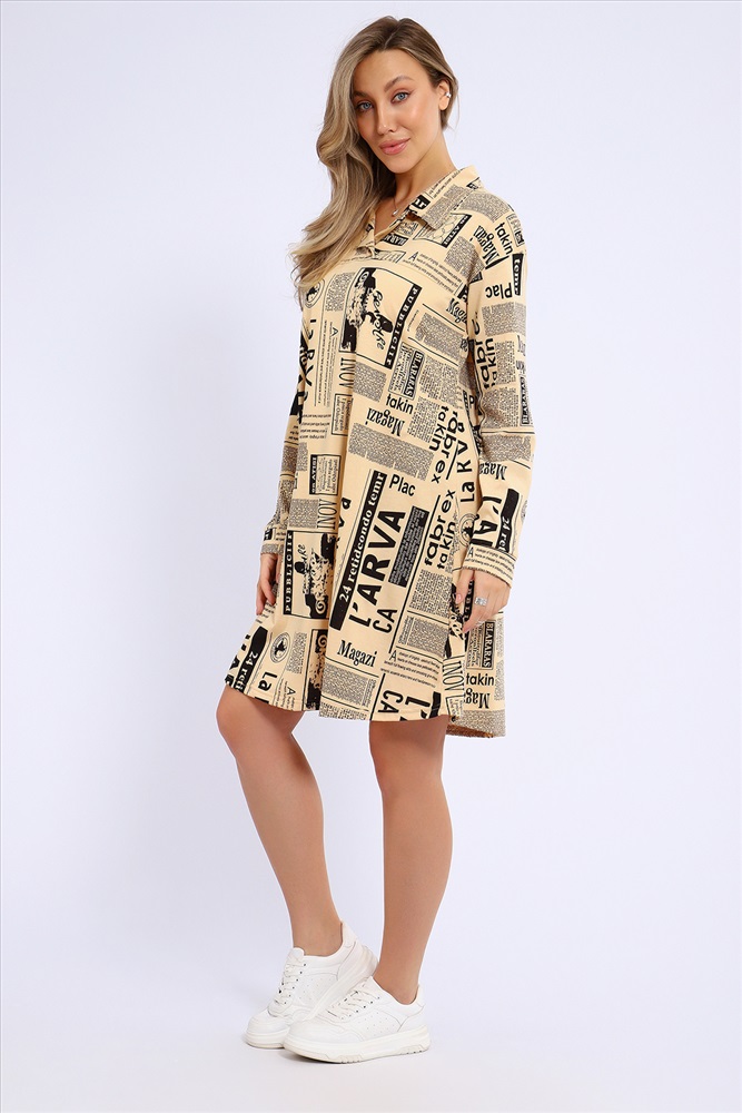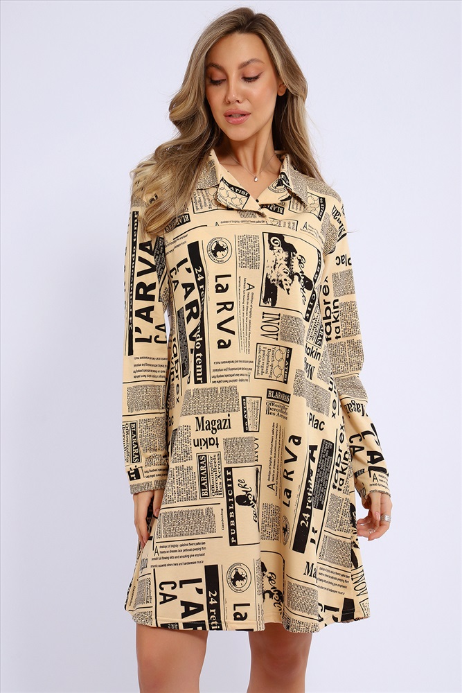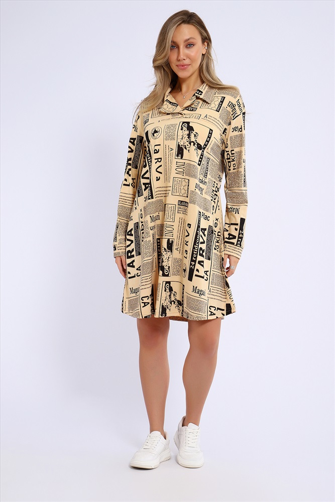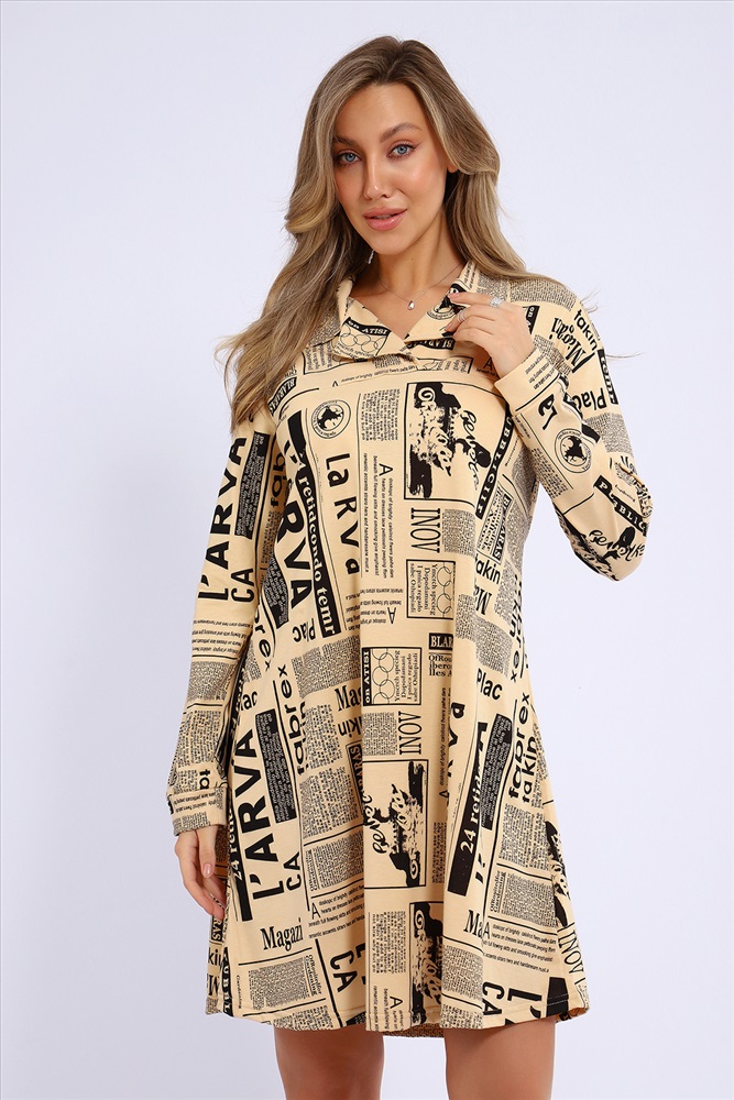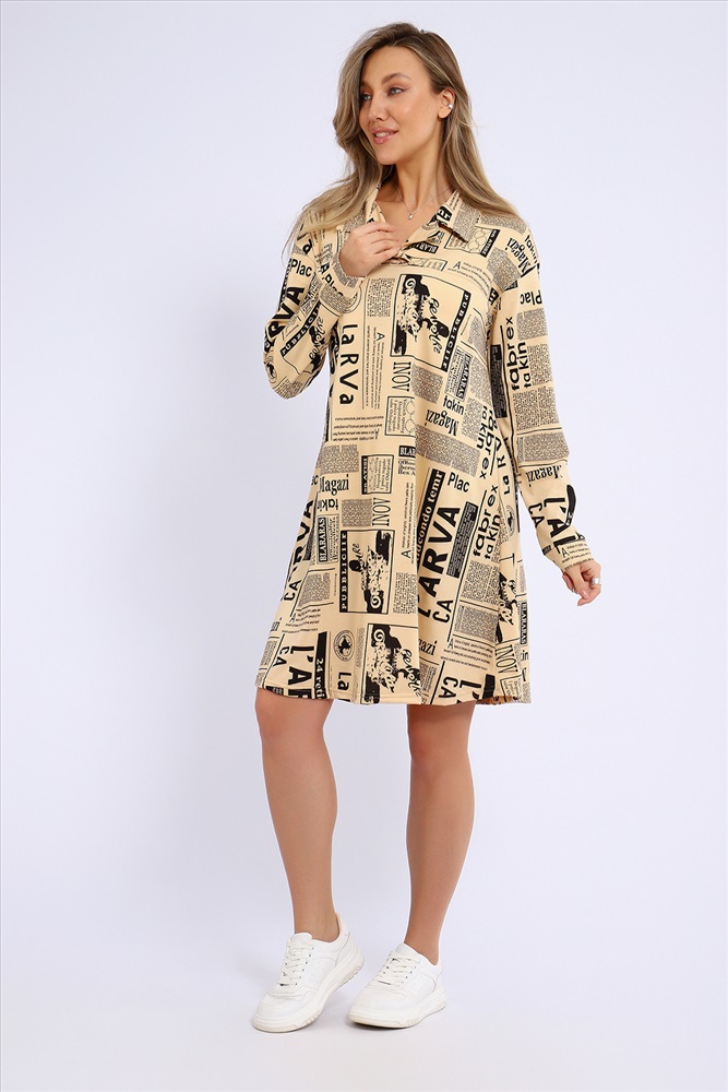 Застежка: без застежки Платье свободного кроя расклешенное к низу и с рубашечным воротником. Рукава длинные, на манжетах.