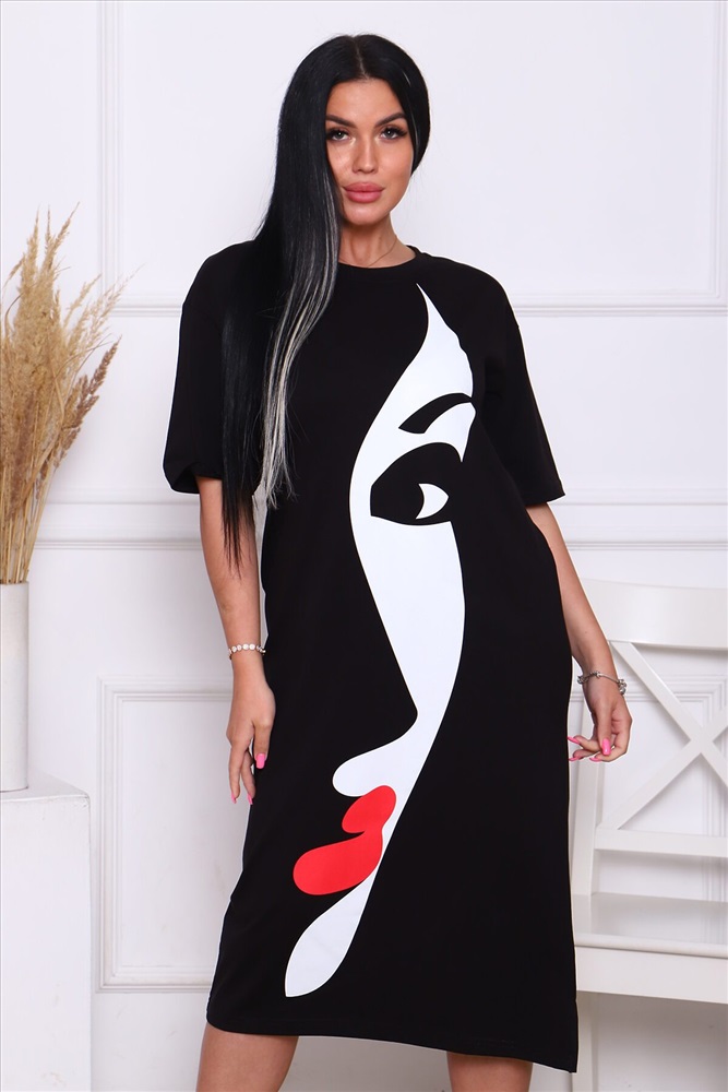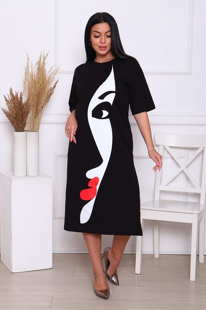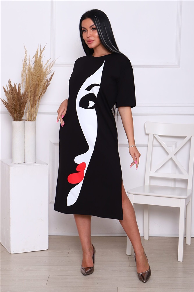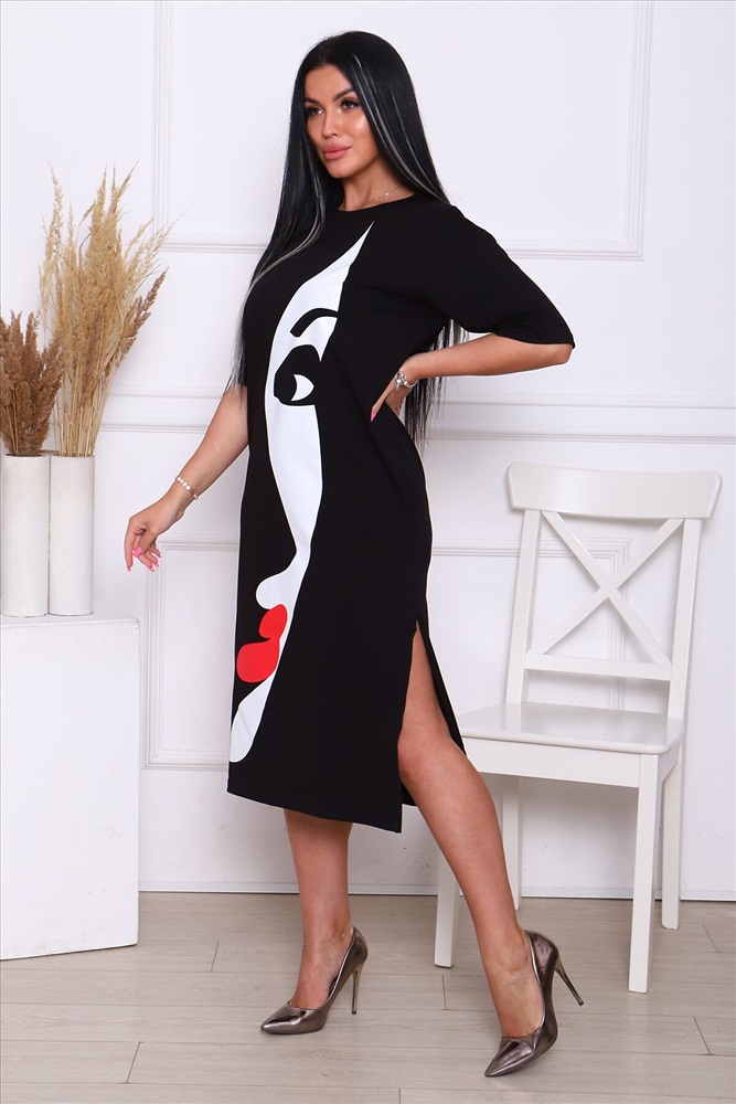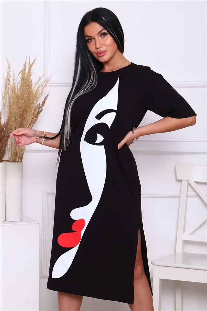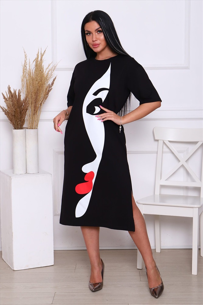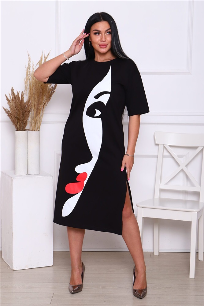 ID товара: 890377 Состав: Хлопок 92%, Лайкра 8% Сезон: Весна/Лето Длина: Миди Фасон: Прямое Рукав: короткие Вырез горловины: Округлый Рисунок: Девушка Декоративные элементы: Разрезы Основная ткань: Хлопок Стиль: Повседневный Вид ткани: Кулирка с лайкрой Страна бренда: Россия Страна производства: Россия Это женское летнее платье - футболка черного цвета, которое станет вашим незаменимым повседневным гардеробом. Оно подходит для любых размеров и фигур, включая беременных девушек. Длинное платье имеет оверсайз крой, что позволяет вам чувствовать себя комфортно и свободно в любую температуру, движение не будет ограничено. А легкий, хлопковый материал, в сочетании с лайкрой, делает платье легким и удобным в носке, что особенно важно в жаркое время года. Вы можете носить это платье как на свадьбу или вечеринку, так и на работу или в шоппинге с босоножками и бейсболкой. Базовый черный цвет и универсальный крой позволяют вам экспериментировать с различными аксессуарами и создавать совершенно разные образы. Если вы хотите добавить яркости своему образу, выберите платье с принтом. А если нужно добавить форму, просто наденьте куртку и выглядите ещё более стильно и модно. Это платье - воплощение комфорта и красоты. Оно подходит для любого случая, от офисного костюма до летнего сарафана. Оно никогда не выйдет из моды и всегда будет актуальным. Не упустите возможность держать себя в форме и выглядеть красиво и модно. Купите это летнее платье сейчас и наслаждайтесь его эластичным кроем и формой. Оно станет вашим любимым вариантом в гардеробе на многие лета. Комментарии к товару