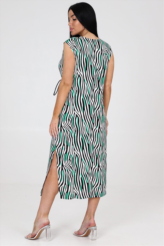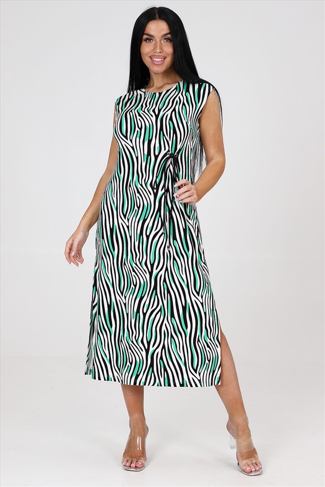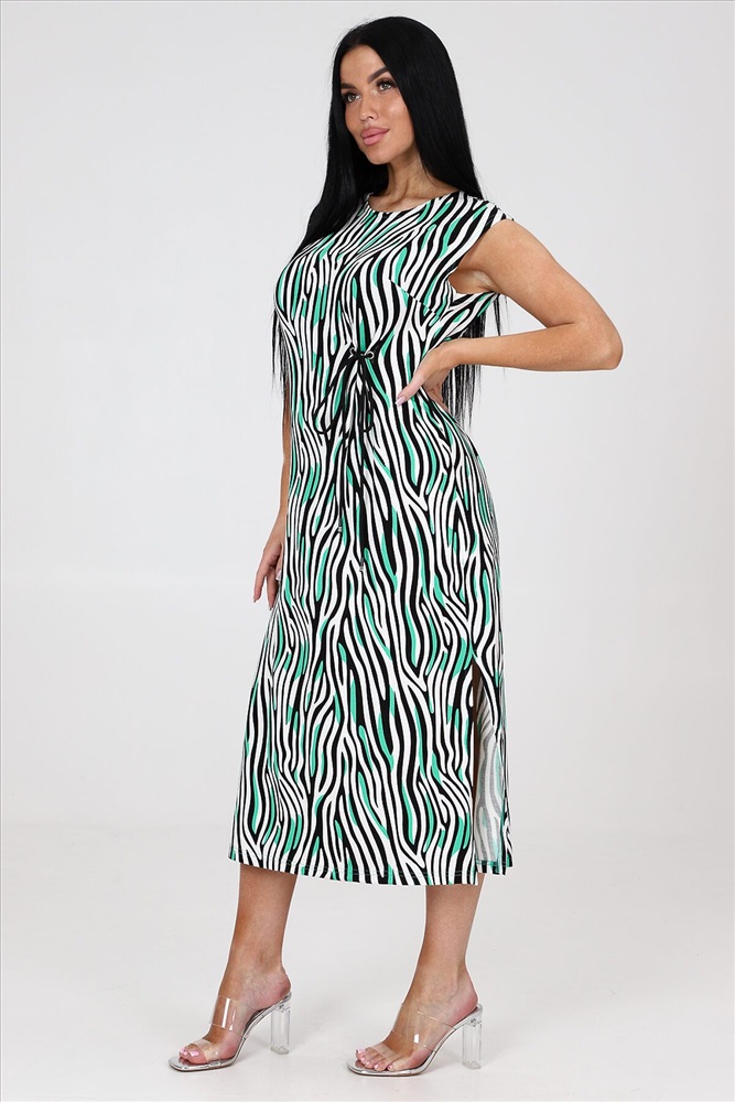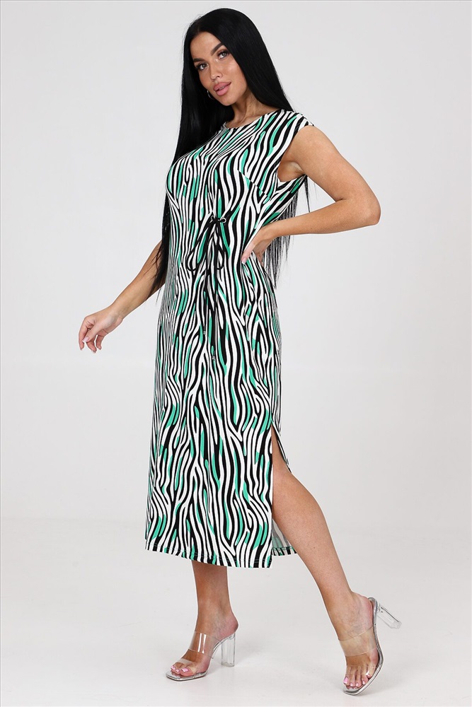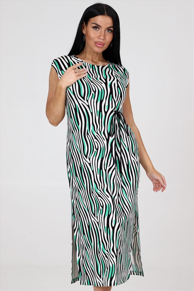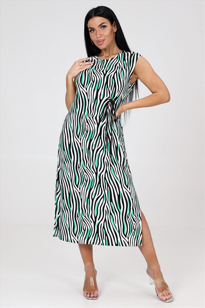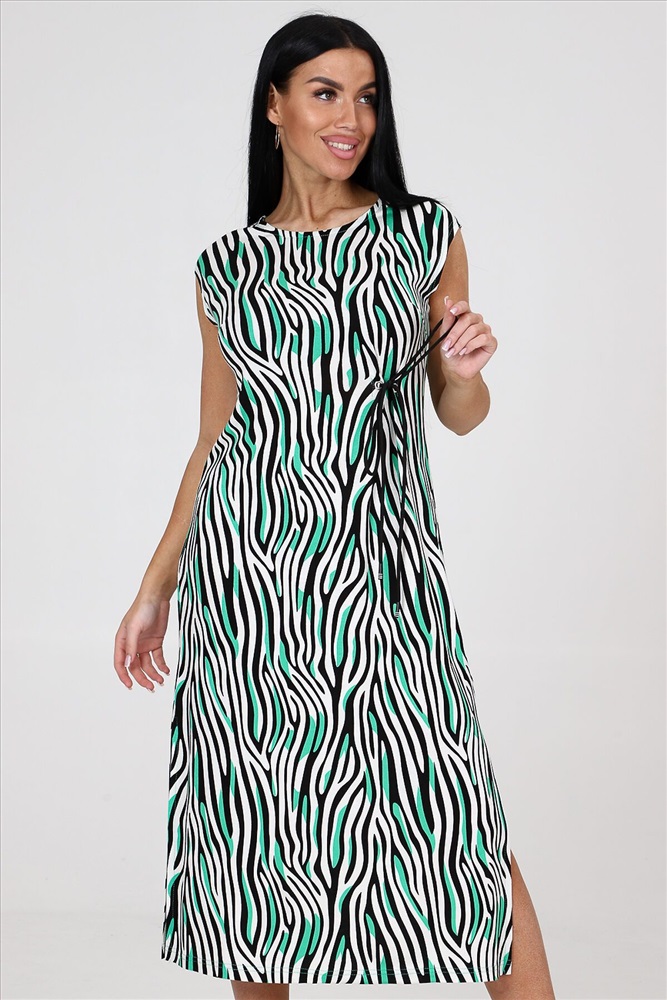 ID товара: 981781 Состав: Вискоза 95%, Лайкра 5% Сезон: Весна/Лето Фасон: Полуприталенный Рукав: Без рукавов Вырез горловины: Лодочка Рисунок: Фантазийный Вид ткани: Вискоза Страна бренда: Россия Страна производства: Россия Платье женское из вискозы свободного покроя. Платье со спущенной проймой, с двумя боковыми разрезами, с вытачками. Комментарии к товару