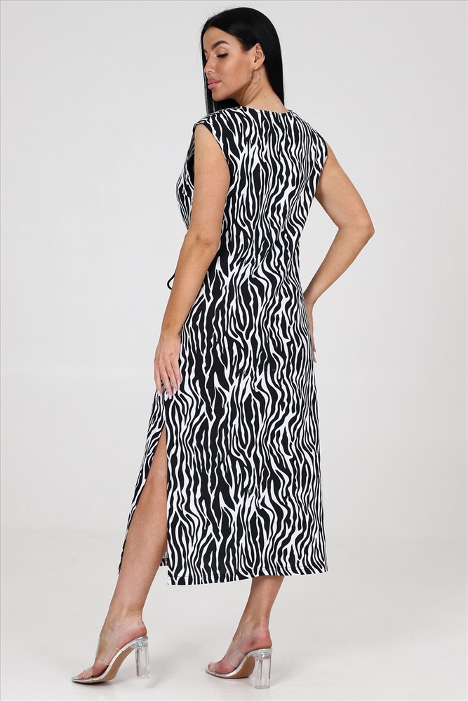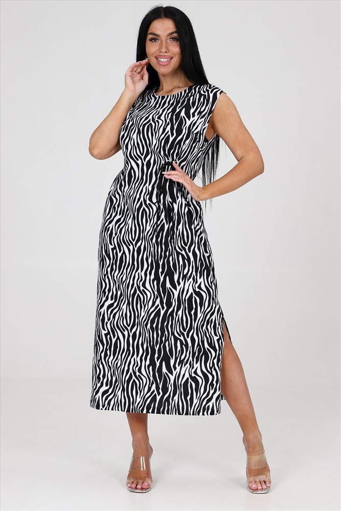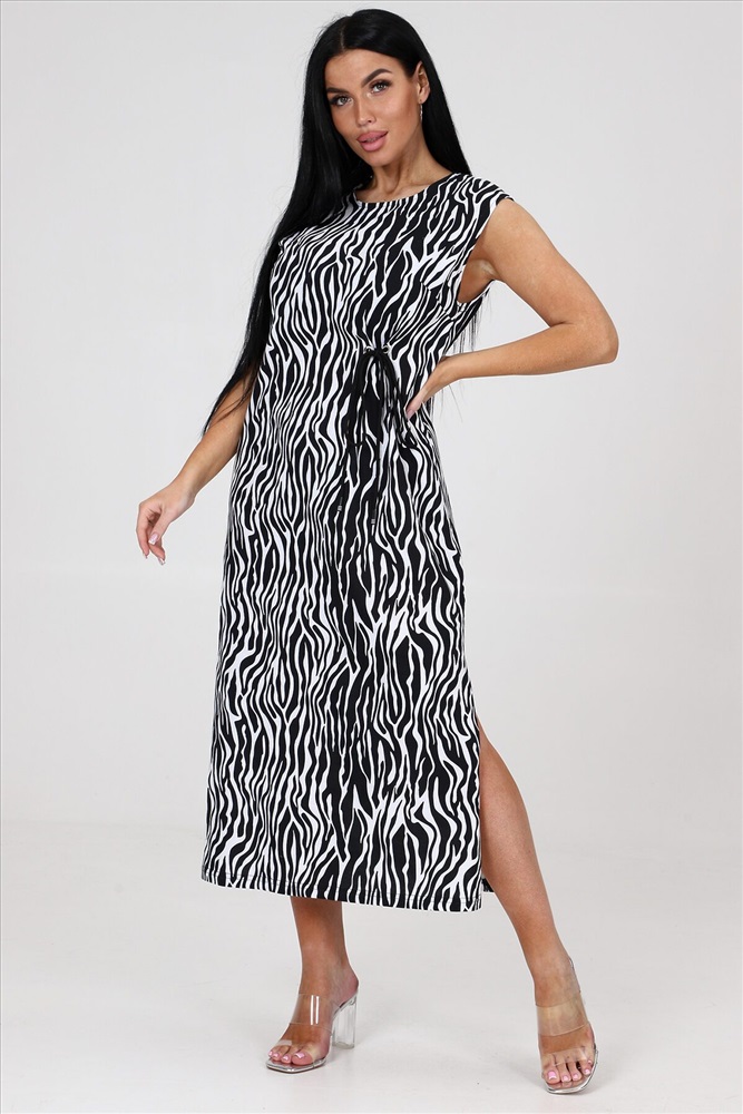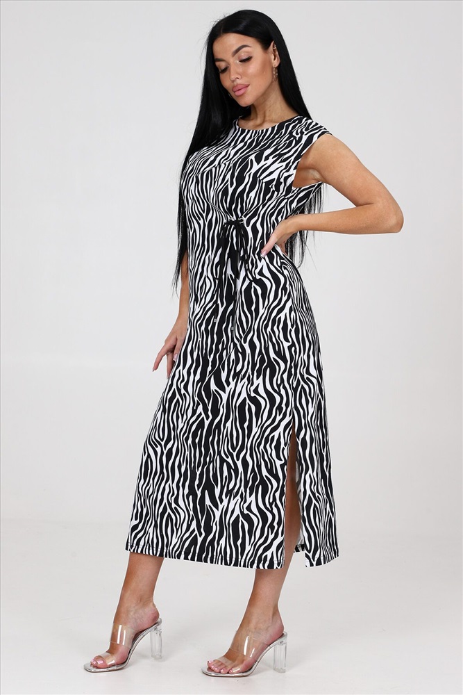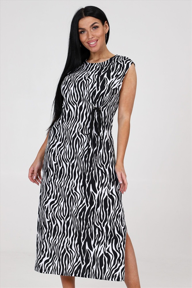 Страна производства: Россия Платье женское из кулирки. Платье свободного покроя со спущенной проймой, с боковыми разрезами, с вытачками.