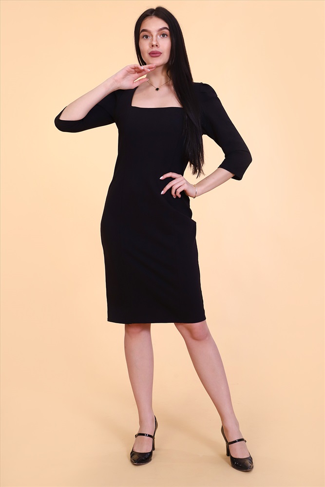 Воротник: без воротника Платье миди приталенного силуэта с рельефами, эффектный вырез декольте каре, обработанный обтачкой, рукав 3/4. Классическое платье подчеркнёт вашу фигуру, поможет создать изящный и элегантный образ, удобное, комфортное для романтических прогулок и деловых встреч.