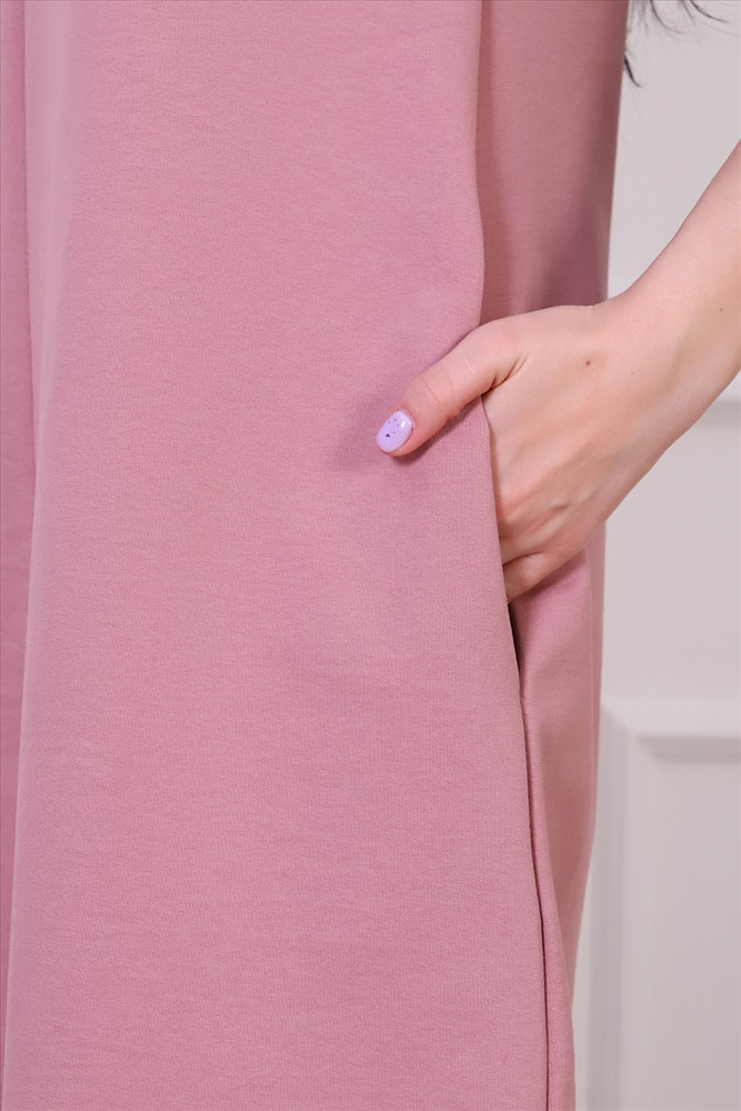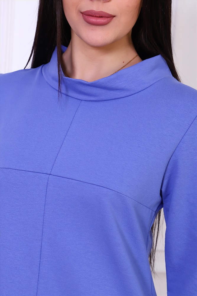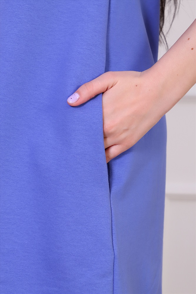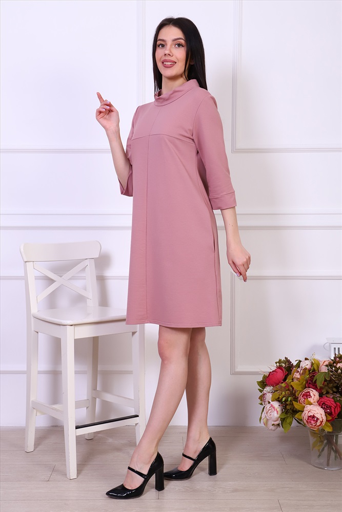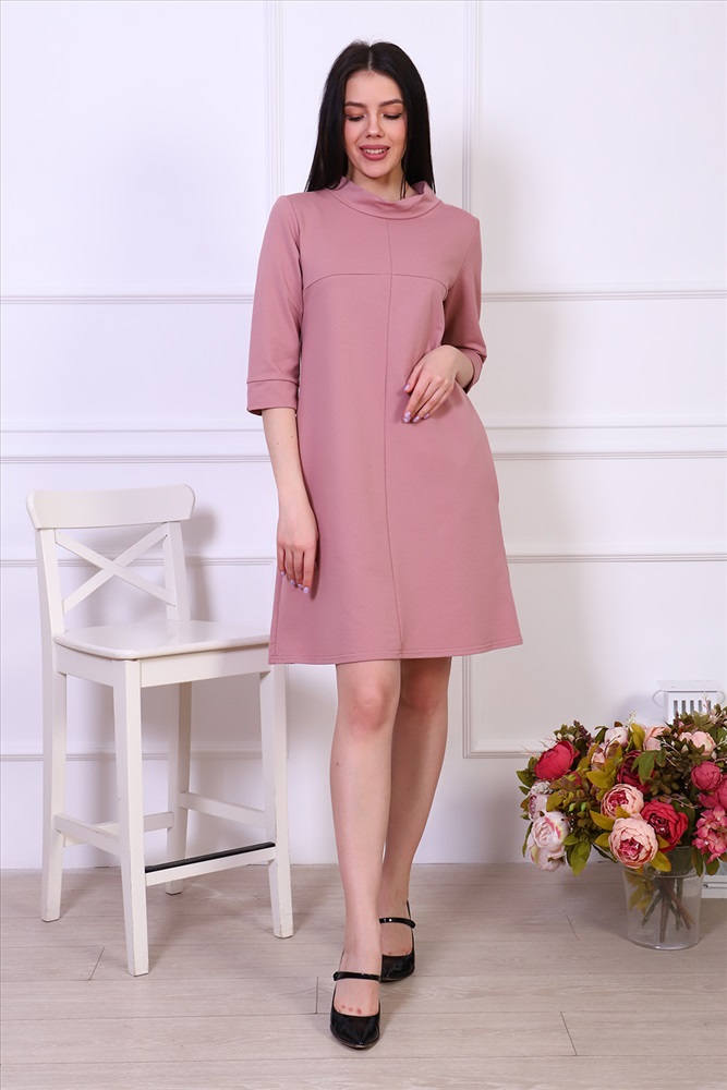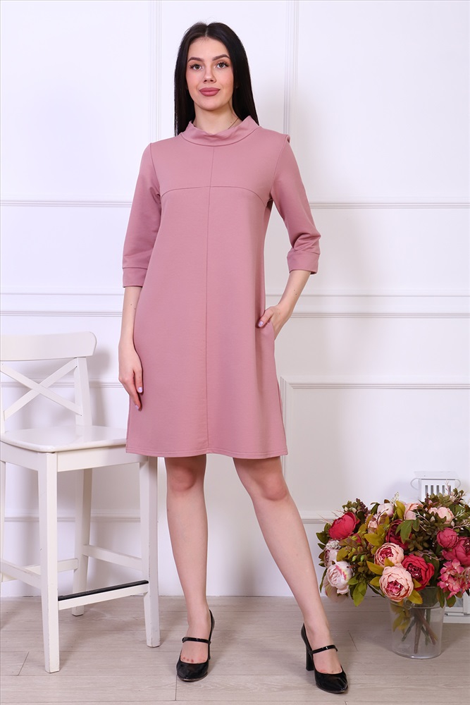 Застежка: без застежки Платье женское из трикотажа футера с лайкрой качества карде, круглая горловина в виде стойки, втачной рукав 3/4 на манжете, по груди отрезная кокетка, в боковых швах удобные карманы. Модель А-силуэта смотрится очень женственно и универсально в плане скрытия недостатков фигуры, выглядит всегда модно и актуально.